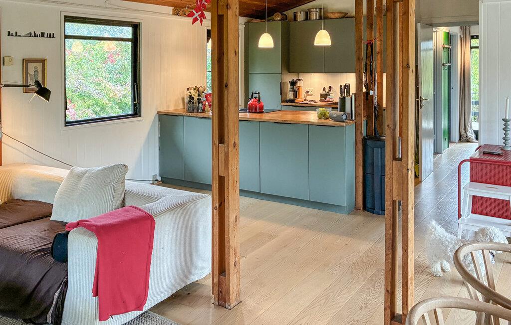 Erleben Sie einen entspannten Urlaub in diesem gemütlichen Ferienhaus, das Sie mit einer warmen Atmosphäre und viel Licht empfängt. Genießen Sie den offenen Wohn- und Essbereich mit großen Fenstern und Blick in den Garten. Machen Sie es sich in der Sofaecke bequem, lesen Sie ein Buch oder verbringen Sie gemeinsame Abende bei anregenden Gesprächen und lustigen Spielen. Der Essplatz mit seinen stilvollen Lampen schafft eine gemütliche Atmosphäre, und die moderne Küche mit Holzarbeitsplatte bietet alles, was Sie für gemeinsame Kochmomente benötigen. Das Zusammenspiel aus hellen Farben und natürlichen Materialien verleiht dem Raum eine behagliche, nordische Note.
