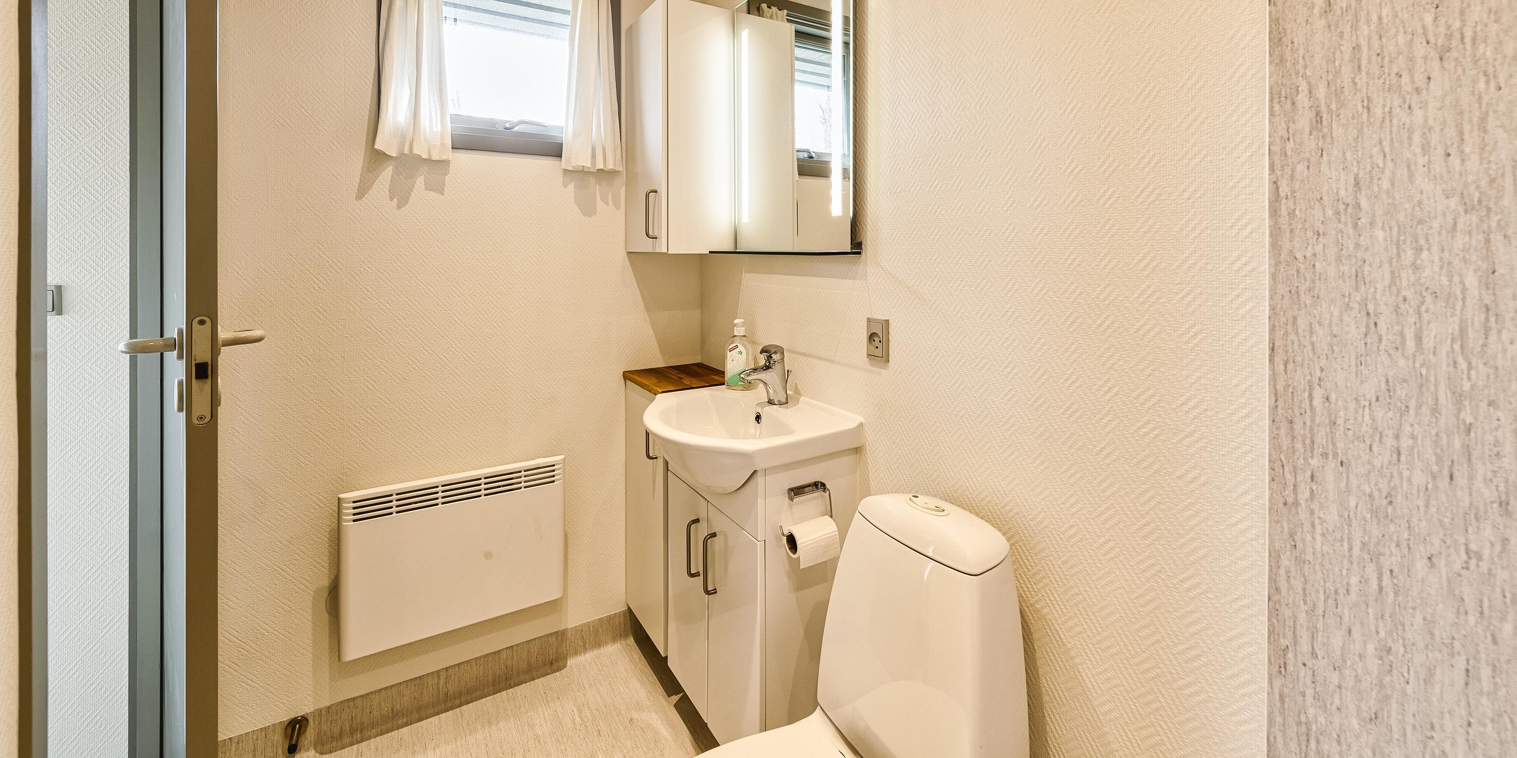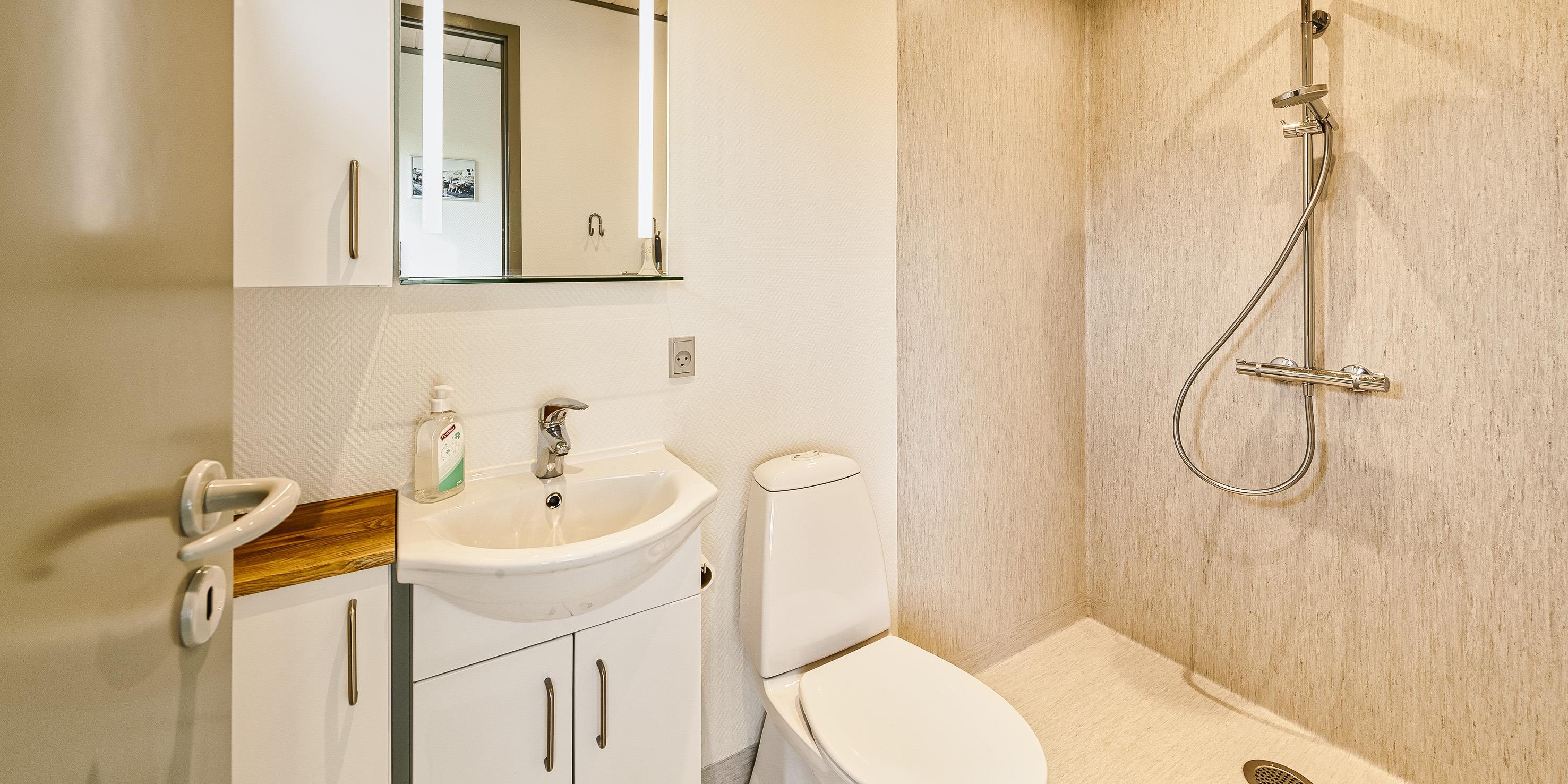 Badezimmer mit Toilette, Dusche und Waschbecken