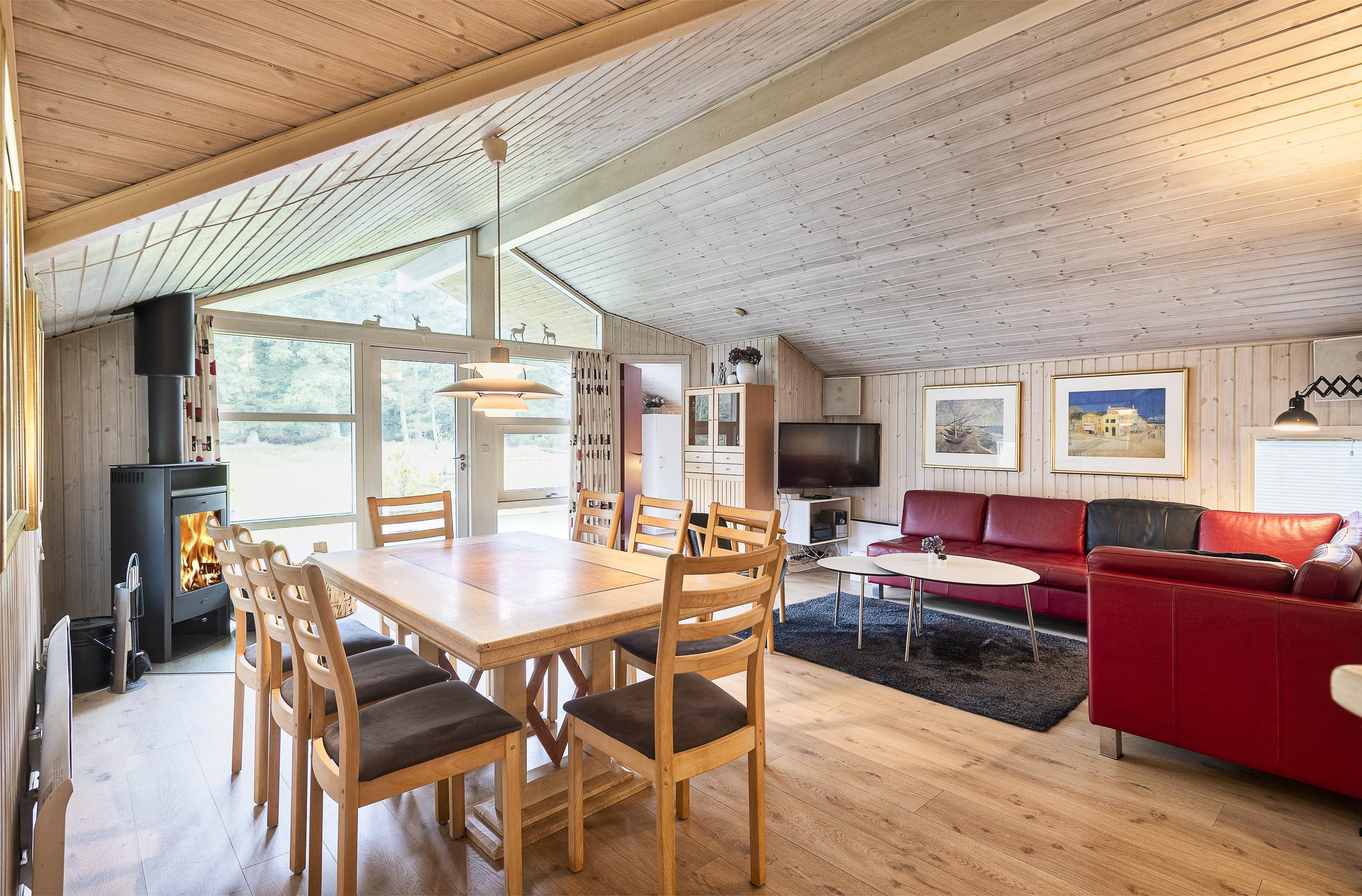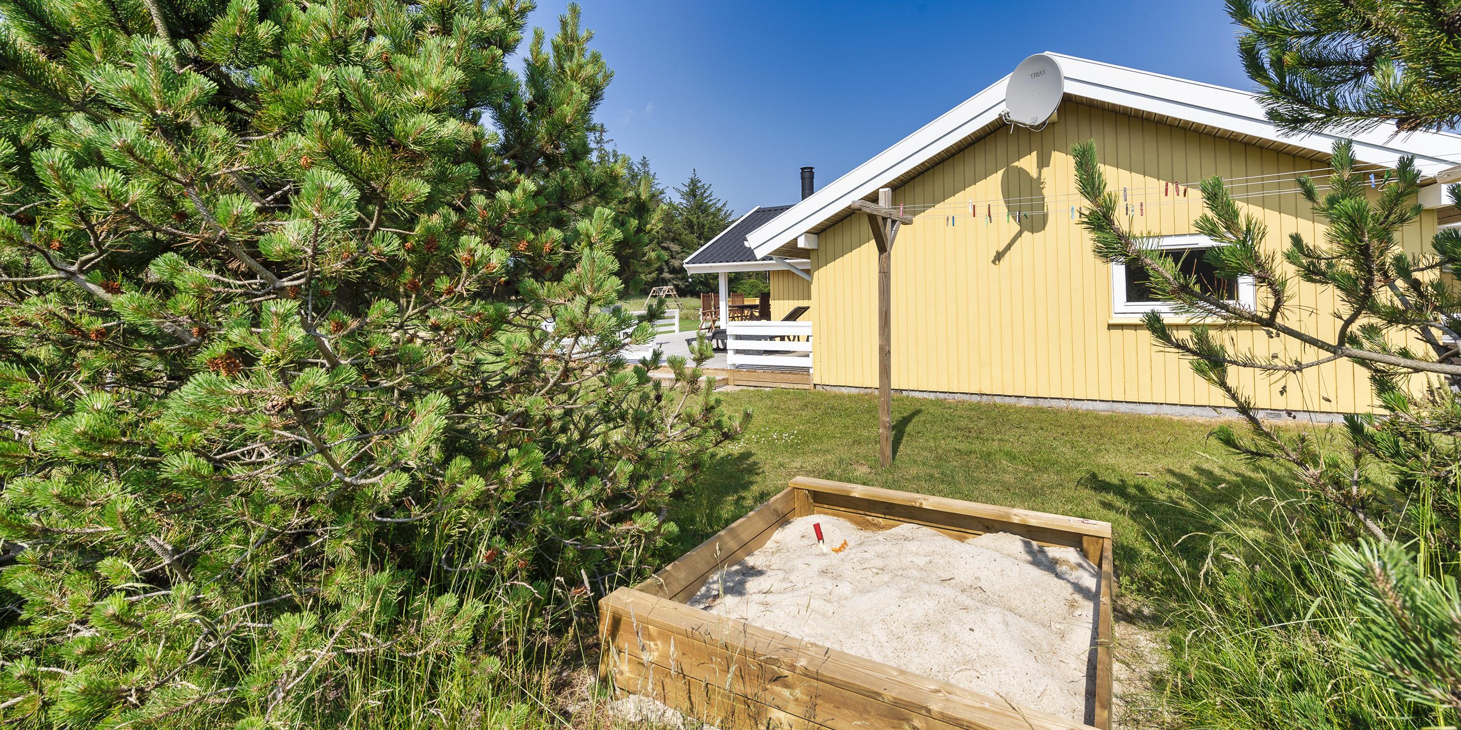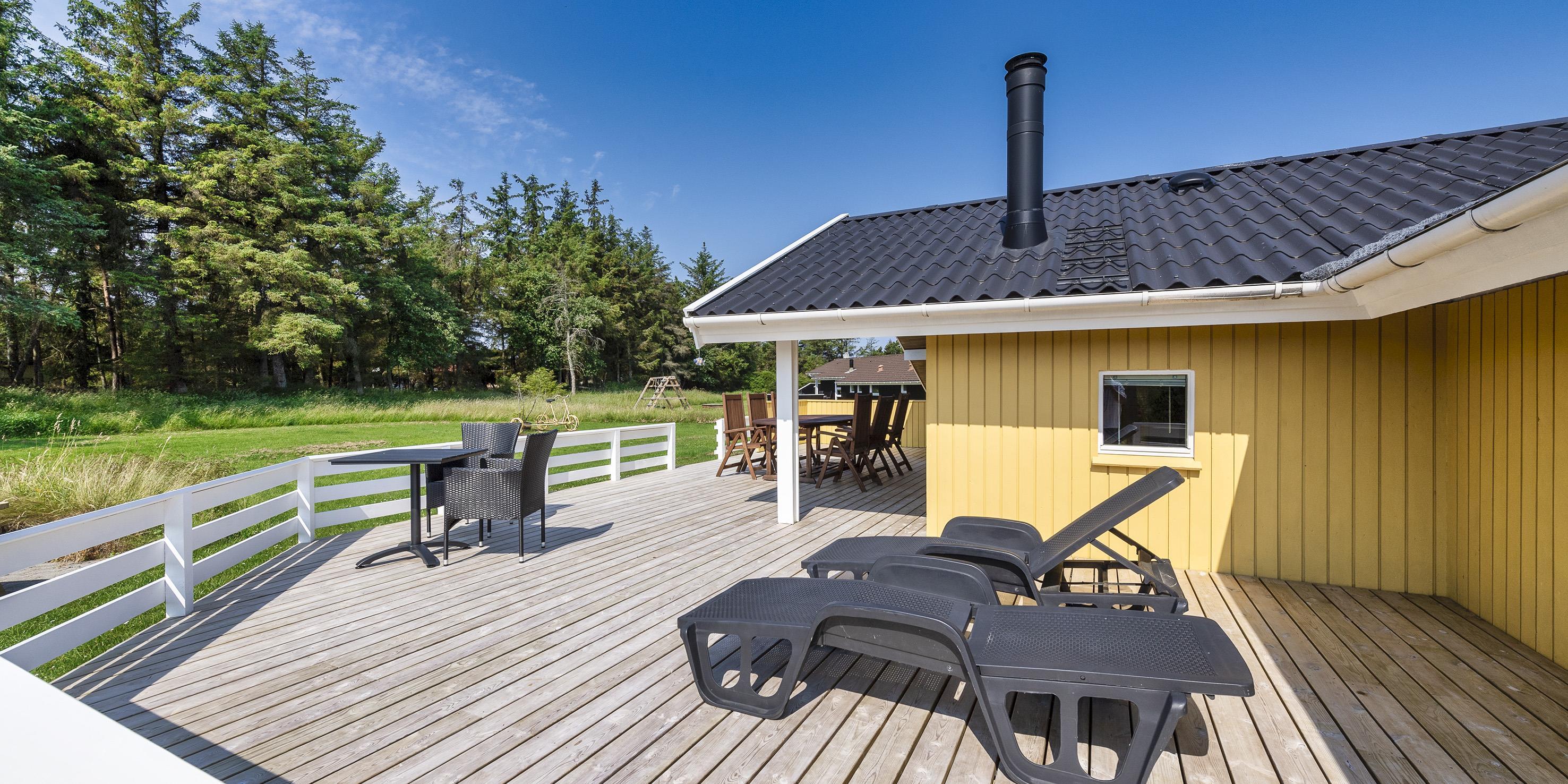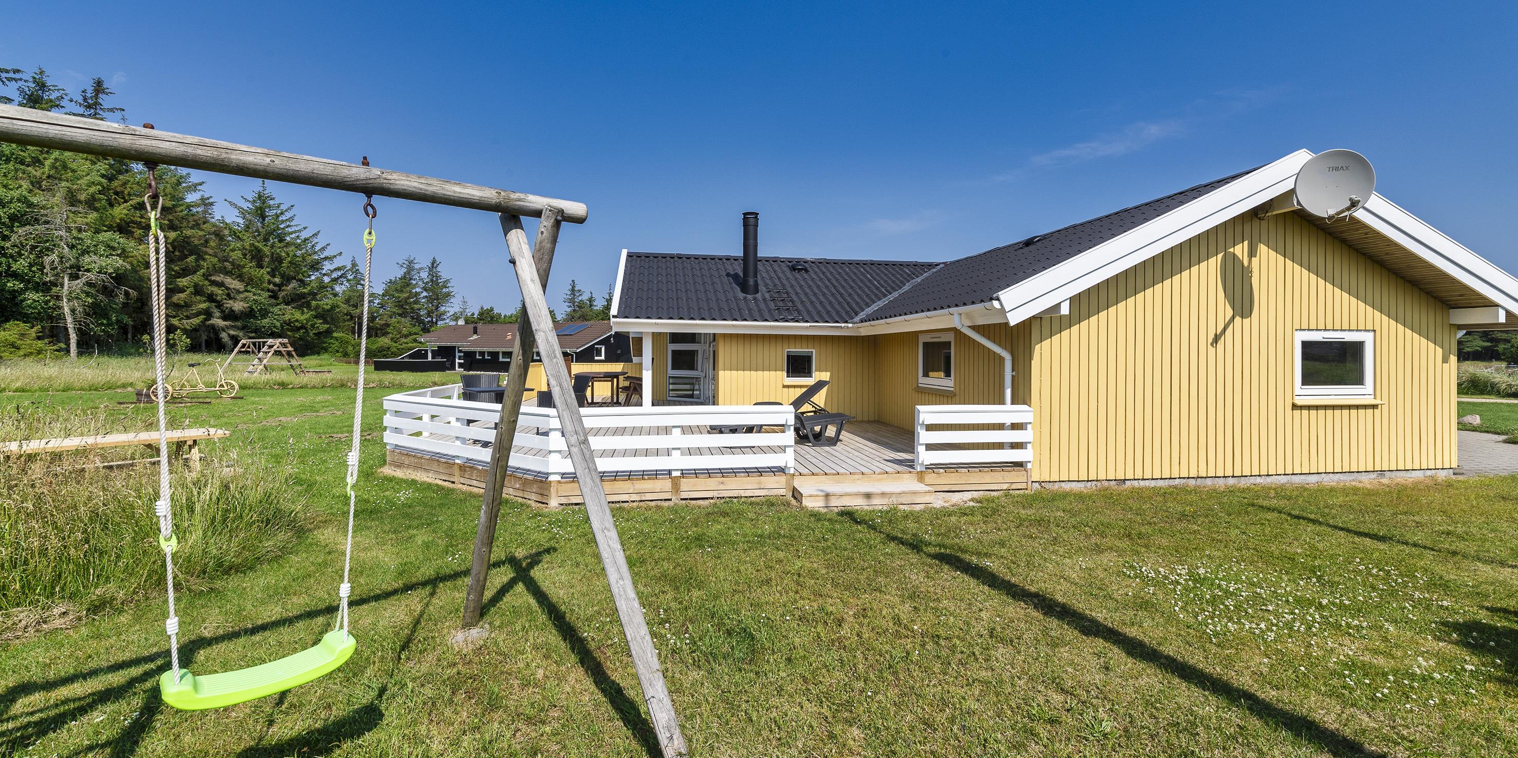 Geschmackvoll eingerichtetes Ferienhaus mit Namen “ Dig & Mig” auf einem großen Naturgrundstück gelegen. Die Einrichtung ist farblich abgestimmt und es passt alles gut zusammen. Das Ferienhaus ist für 8 Personen ausgestattet. Der Strand ist 1,5 Km vom Haus entfernt. In dieser Straße treffen Sie häufig auf Hirsche und das Rotwild, die aus dem dahinter liegenden Wald kommen. Die Tiere lieben es von den Gästen mit Obst und Gemüse verwöhnt zu werden. Im Wohn-, Ess- und Küchenbereich ist ein hübscher Laminatboden verlegt worden, Die Bäder sind gefliest und in den Schlafräumen liegt Teppichboden. Im Wohnbereich ist ein Kamin aufgestellt. Das deutsche Fernsehprogramm empfangen Sie über eine Parabolantenne. Es befindet sich eine Warmepumpe im Ferienhaus. Mit dieser Warmepumpe haben sie die Möglichkeit die Stromkosten zu senken, denn die Warmepumpe ist energiesparend. In der Küche finden Sie einen Herd mit Cerankochfeld, ein Backofen, eine Geschirrspülmaschine, eine Mikrowelle und eine Kühl- und Gefrierkombination. Zwei Bäder stehen den Gästen zur Verfügung. Das kleine Bad ist mit einem WC, einem Handwaschbecken und einer Dusche ausgestattet. Das große Badezimmer hat ein WC, ein Handwaschbecken, eine Dusche, eine Sauna und einen Whirlpool. Die Waschmaschine und der Trockner sind auch in dem großen Badezimmer untergebracht. Desweiteren stehen den Gästen vier Schlafzimmer zur Verfügung: DB + DB + 2B + 2B. Zwei davon sind mit je einem Doppelbett ausgestattet und die beiden anderen verfügen je über zwei Einzelbetten. Eine nett angelegte Terrasse lädt zum relaxen ein. Für die kleinen Gäste steht eine Sandkiste und eine Schaukel zur Verfügung. Das Ferienhaus verfügt über einen Internetanschluss (W-Lan). Es sind keine Haustiere erlaubt, mit Ausnahme ein kleiner Hund mit max. Rückenhöhe von 30 cm . Rauchen ist nicht erlaubt. Das Ferienhaus ist 1998 erbaut worden.