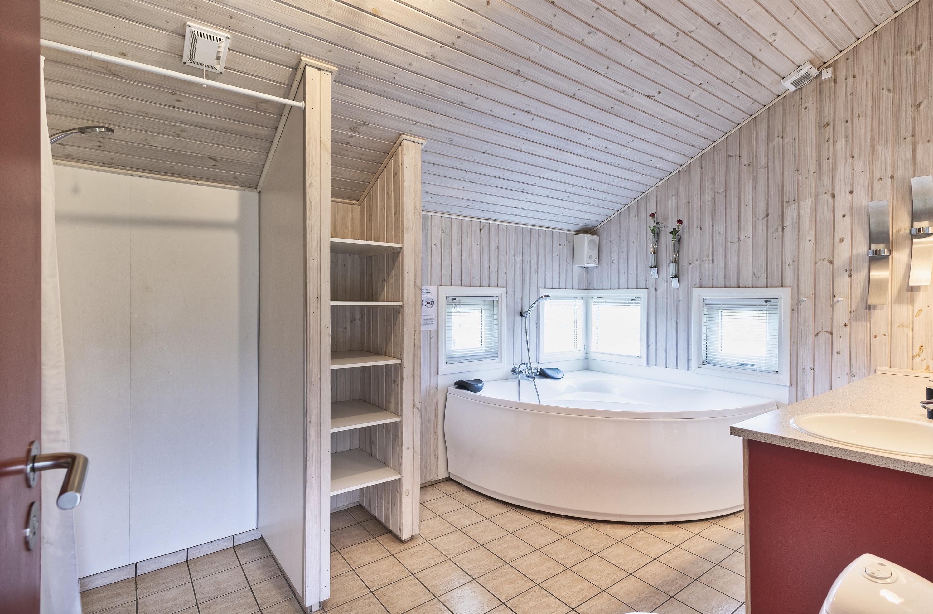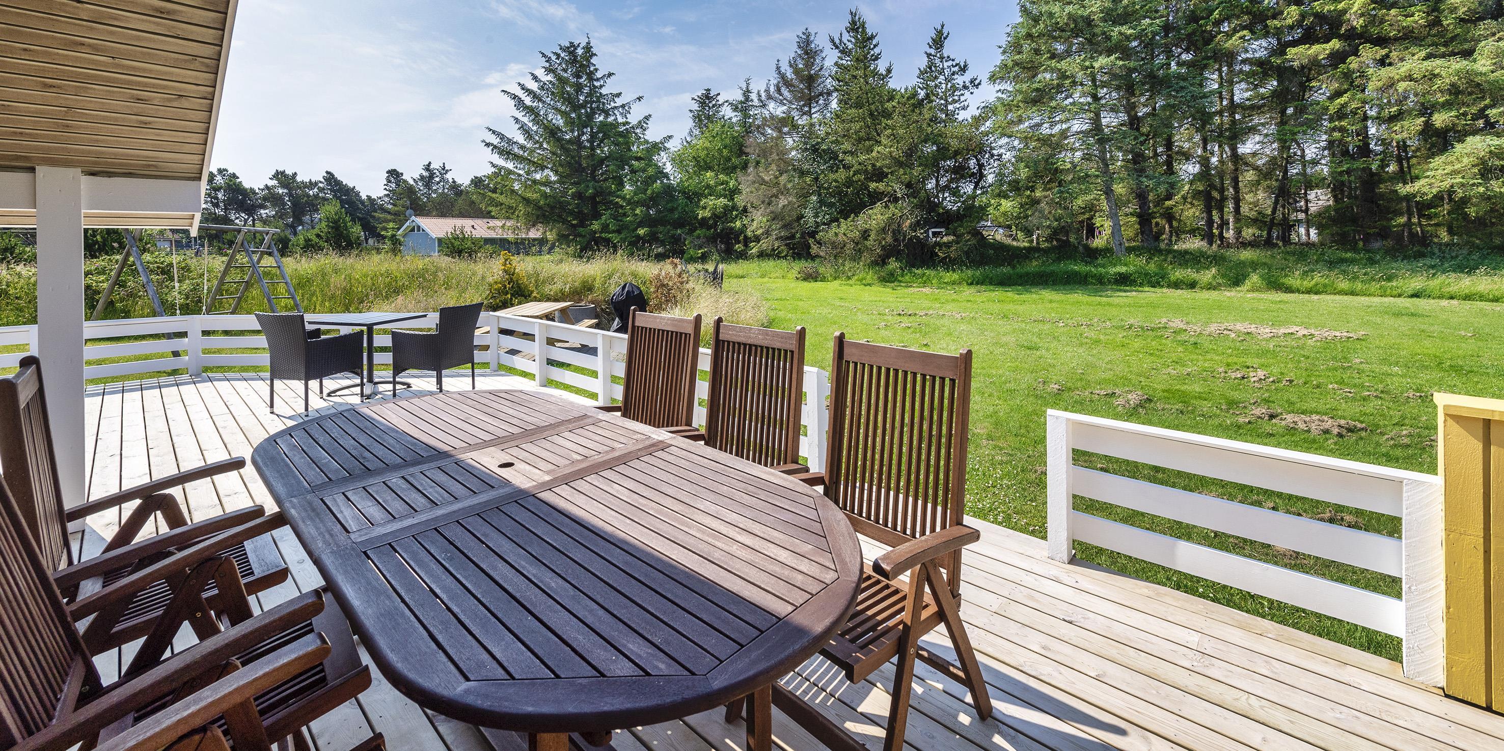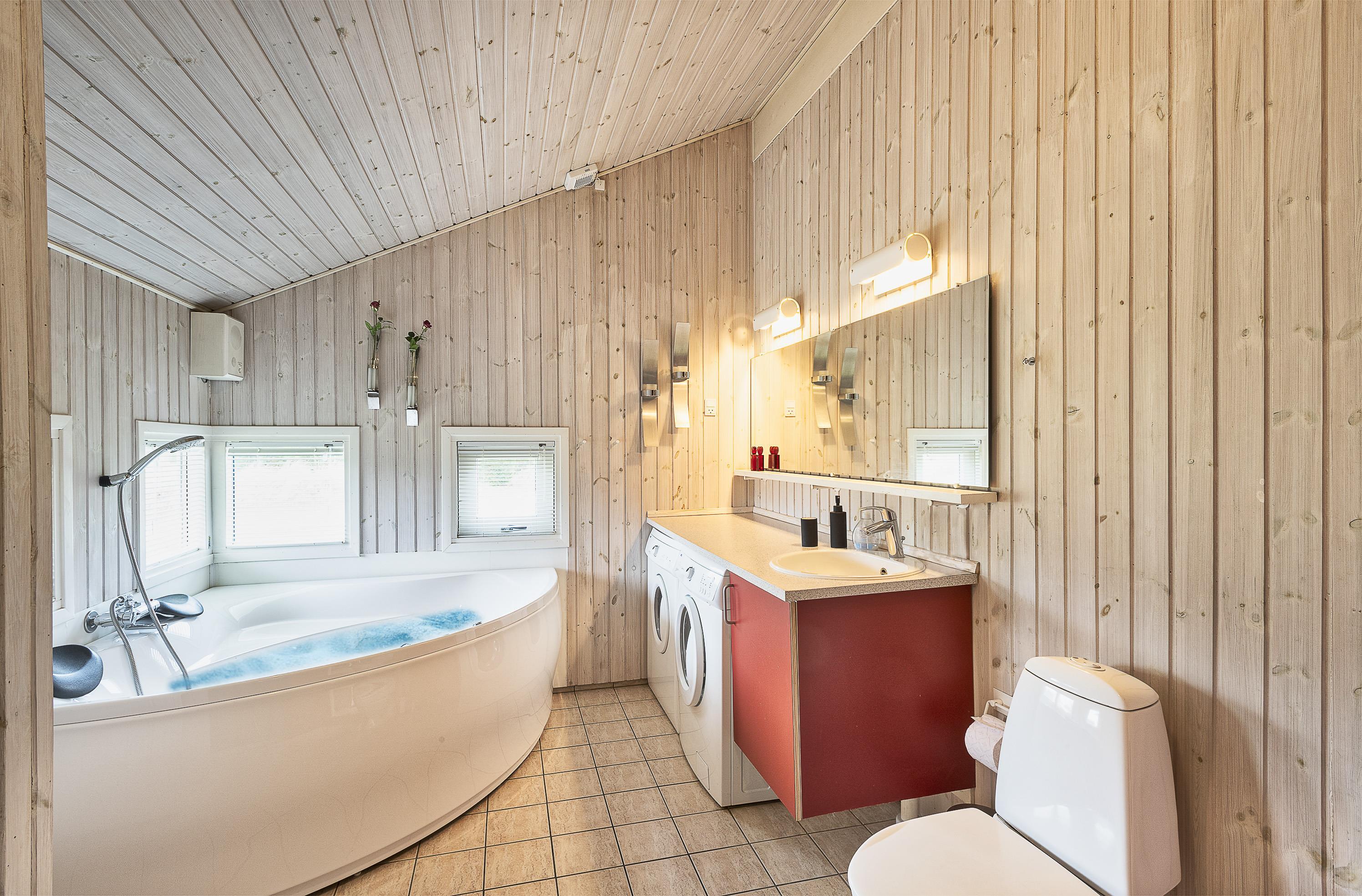 Geschmackvoll eingerichtetes Ferienhaus mit Namen “ Dig & Mig” auf einem großen Naturgrundstück gelegen. Die Einrichtung ist farblich abgestimmt und es passt alles gut zusammen. Das Ferienhaus ist für 8 Personen ausgestattet. Der Strand ist 1,5 Km vom Haus entfernt. In dieser Straße treffen Sie häufig auf Hirsche und das Rotwild, die aus dem dahinter liegenden Wald kommen. Die Tiere lieben es von den Gästen mit Obst und Gemüse verwöhnt zu werden. Im Wohn-, Ess- und Küchenbereich ist ein hübscher Laminatboden verlegt worden, Die Bäder sind gefliest und in den Schlafräumen liegt Teppichboden. Im Wohnbereich ist ein Kamin aufgestellt. Das deutsche Fernsehprogramm empfangen Sie über eine Parabolantenne. Es befindet sich eine Warmepumpe im Ferienhaus. Mit dieser Warmepumpe haben sie die Möglichkeit die Stromkosten zu senken, denn die Warmepumpe ist energiesparend. In der Küche finden Sie einen Herd mit Cerankochfeld, ein Backofen, eine Geschirrspülmaschine, eine Mikrowelle und eine Kühl- und Gefrierkombination. Zwei Bäder stehen den Gästen zur Verfügung. Das kleine Bad ist mit einem WC, einem Handwaschbecken und einer Dusche ausgestattet. Das große Badezimmer hat ein WC, ein Handwaschbecken, eine Dusche, eine Sauna und einen Whirlpool. Die Waschmaschine und der Trockner sind auch in dem großen Badezimmer untergebracht. Desweiteren stehen den Gästen vier Schlafzimmer zur Verfügung: DB + DB + 2B + 2B. Zwei davon sind mit je einem Doppelbett ausgestattet und die beiden anderen verfügen je über zwei Einzelbetten. Eine nett angelegte Terrasse lädt zum relaxen ein. Für die kleinen Gäste steht eine Sandkiste und eine Schaukel zur Verfügung. Das Ferienhaus verfügt über einen Internetanschluss (W-Lan). Es sind keine Haustiere erlaubt, mit Ausnahme ein kleiner Hund mit max. Rückenhöhe von 30 cm . Rauchen ist nicht erlaubt. Das Ferienhaus ist 1998 erbaut worden.