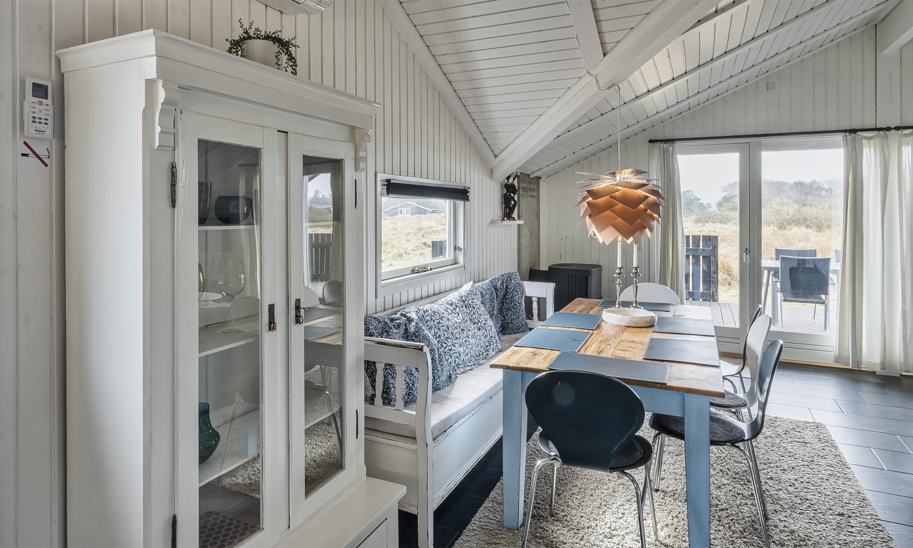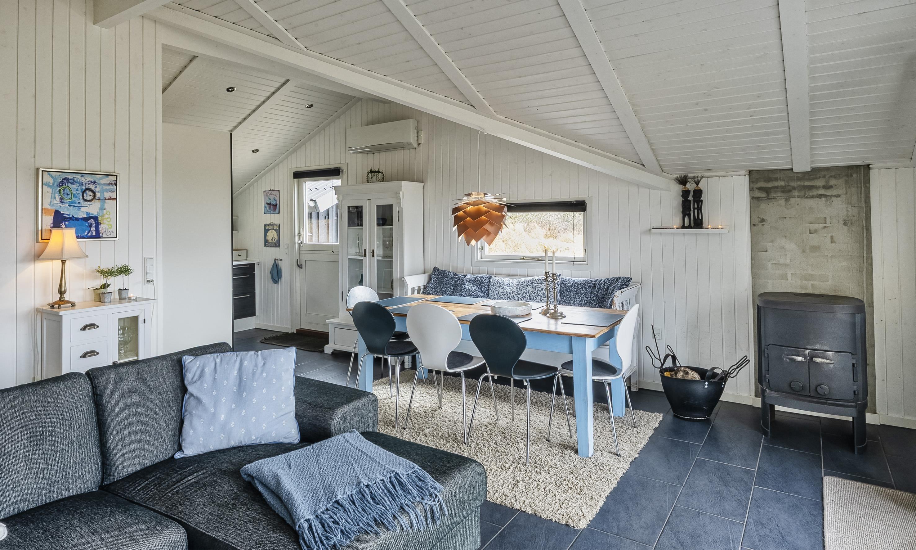 Dieses schnuckelige Ferienhaus mit Namen "Smør-Hullet" ist für 5 Personen liegt auf einem ca. 2.900 m2 großem Grundstück. Der Strand ist rund 1 Km vom Ferienhaus entfernt. Das Ferienhaus ist liebevoll und persönlich von den Eigentümern eingerichtet und strahlt einen besonderen Charme aus. Die Räumlichkeiten sind alle gefliest bis auf die Schlafzimmer. Ein gemütliches Sofa lädt zum entspannen ein und von hier haben Sie direkten Blick den Gartenbereich. Das deutsche Fernsehprogramm empfangen Sie über Stofa, daher sind nur 5-8 deutsche Kanäle zu empfangen. Der Essbereich ist zur Küche hin offen. Hier steht der kleine ”unscheinbare” Kamin, der eine angenehme Wärme in den Wohn- und Essbereich strahlt. Es befindet sich eine Warmepumpe im Ferienhaus. Mit dieser Warmepumpe haben sie die Möglichkeit die Stromkosten zu senken, denn die Warmepumpe ist energiesparend. Die Küche bietet alles was Sie zum Kochen brauchen. Einen Herd mit Cerankochfeld, einem Backofen in Arbeitshöhe, einer Mikrowelle, einer Geschirrspülmaschine und einer Kühl- und Gefrierkombination. Das Badezimmer verfügt über ein WC, ein Handwaschbecken und eine Duschkabine. In einem Hauswirtschaftsraum befindet sich die Waschmaschine. Es gibt drei Schlafbereiche im Ferienhaus: DB + DB + B. Der Terrassenbereich ist offen und ein Teil der Holzterrasse ist sogar überdacht. Folgend der Sonne haben Sie die Möglichkeit Ihr Sonnenbad zu nehmen, da eine relativ neue Holzteeasse rund um das Ferienhaus gebaut wurde. Das Wildnisbad ist privat. Großzügigem Naturgrundstück. Das Ferienhaus verfügt über einen Internetanschluss (W-Lan). Das Rauchen im Haus ist nicht erlaubt. Haustiere sind nicht erlaubt. Das Ferienhaus ist 1985 erbaut worden und in 2014 renoviert.