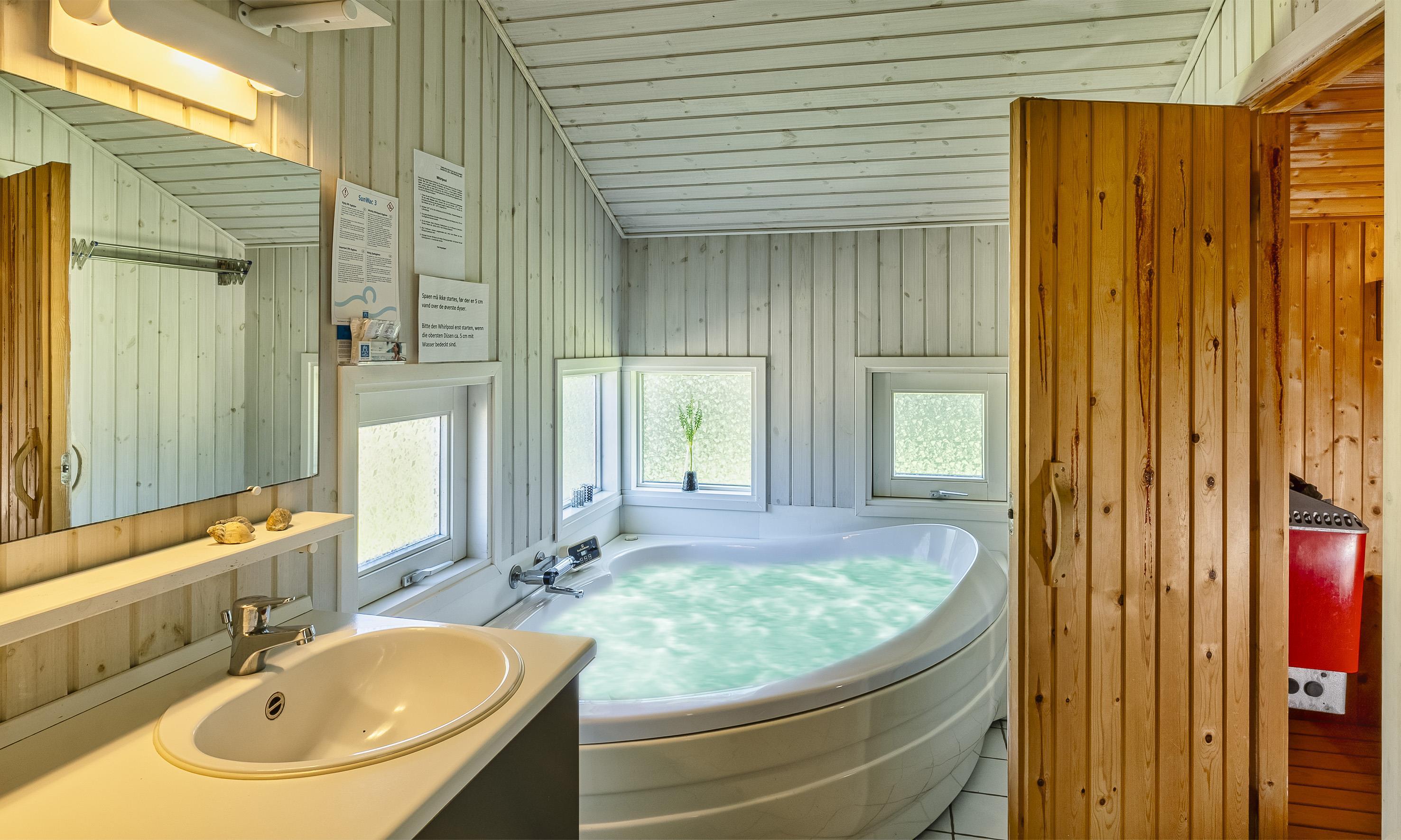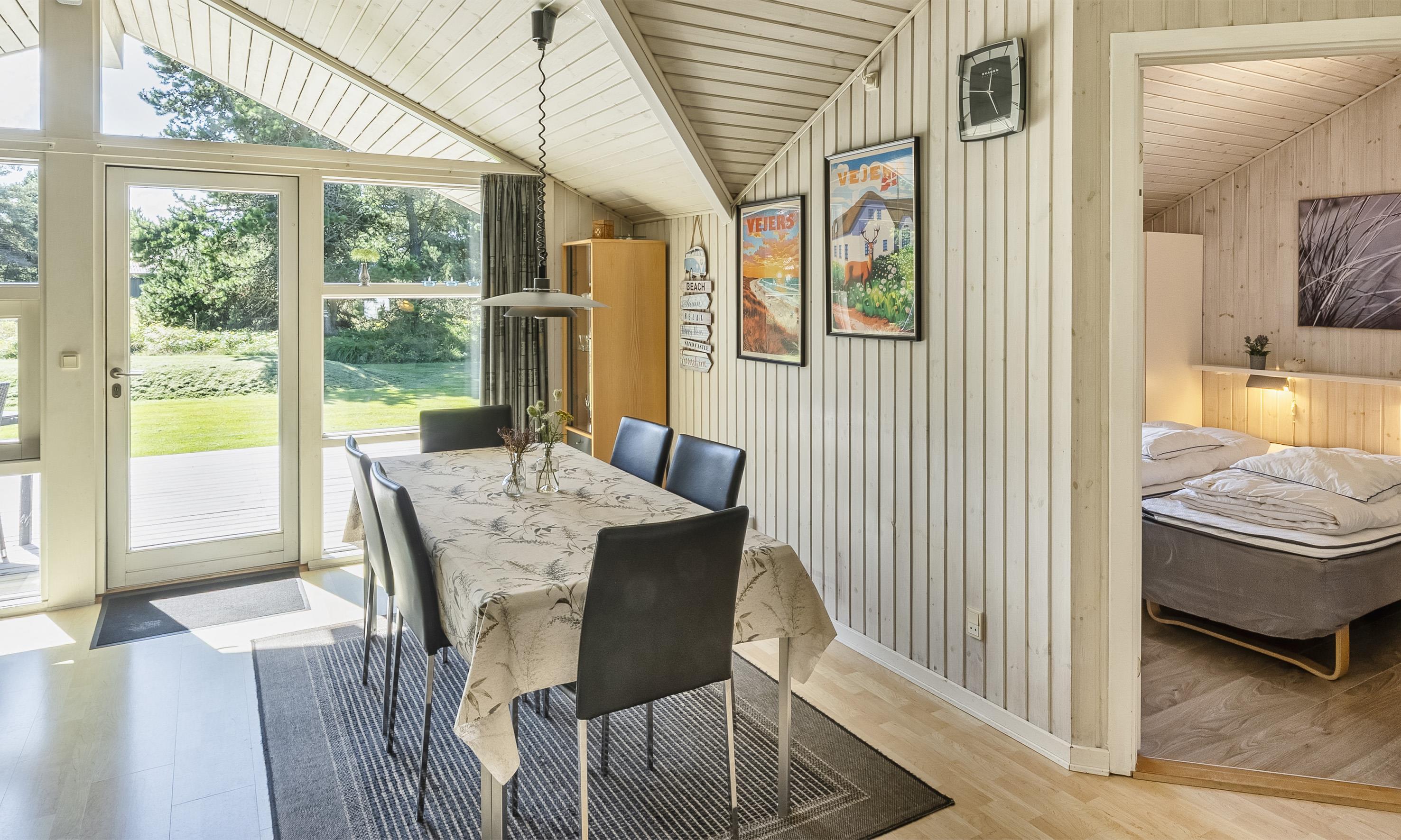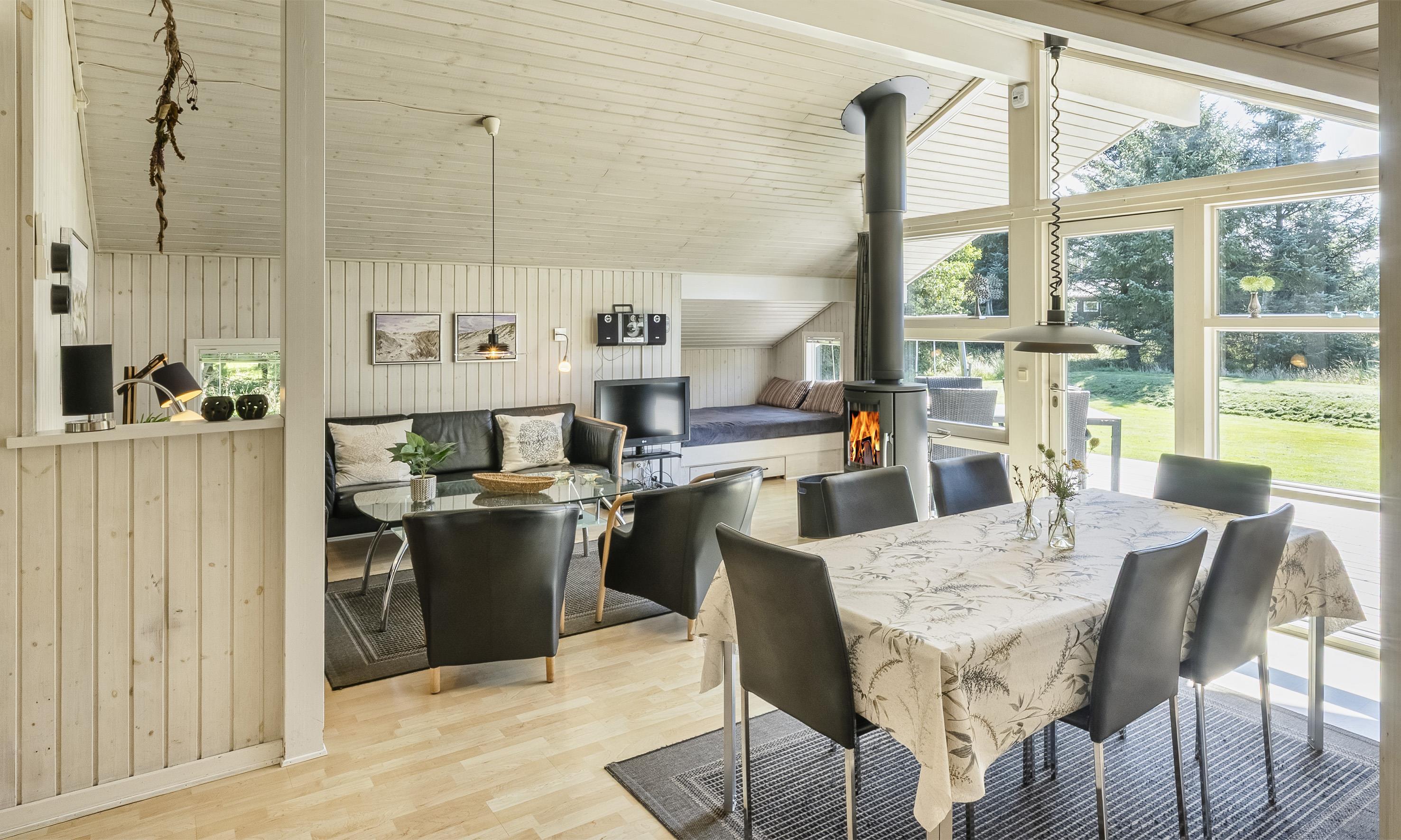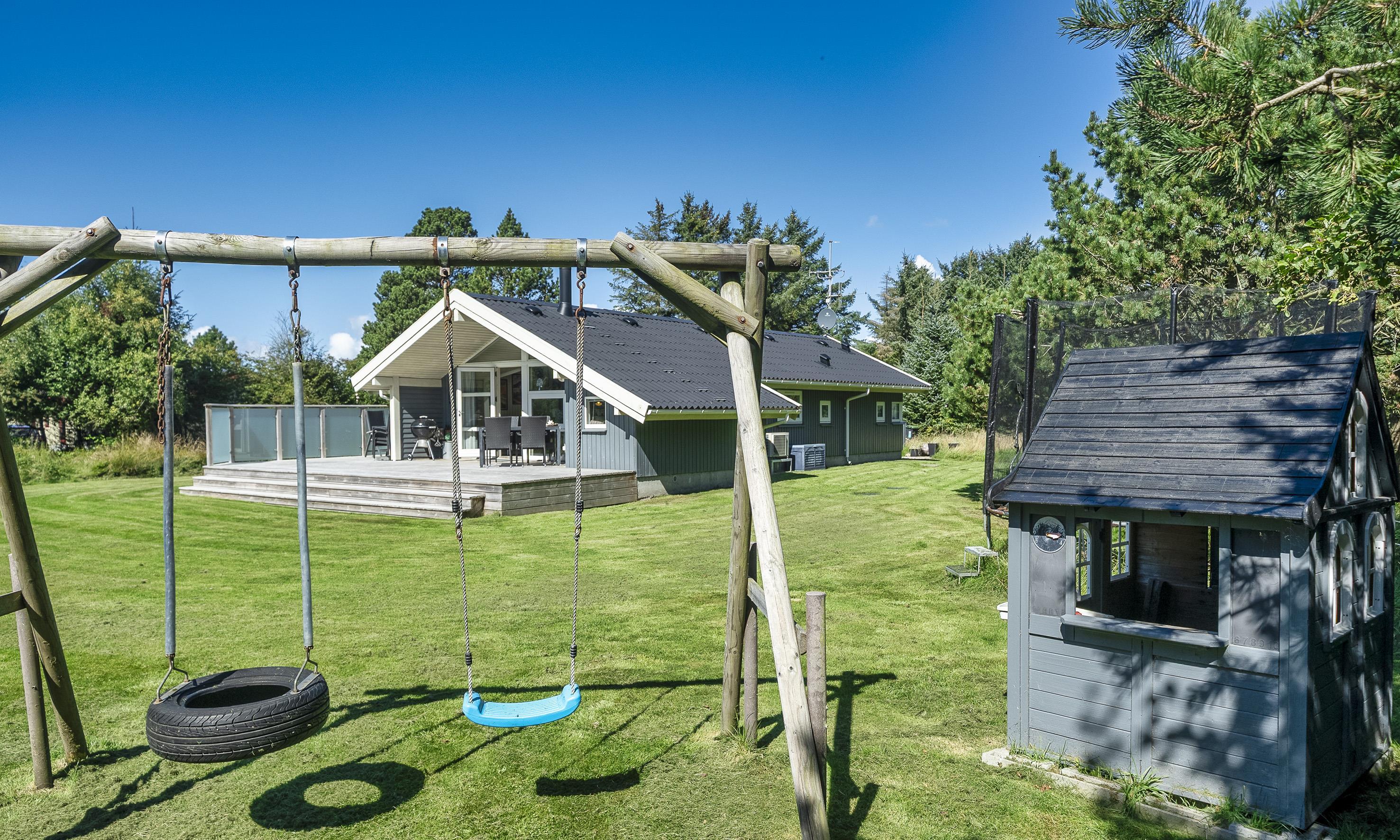 Hell und freundlich ausgestattetes Ferienhaus auf einem großen Rasengrundstück. Das Ferienhaus ist für 6 Personen ausgestattet. Der Strand ist ca. 1 Km vom Haus entfernt. Der Wohn- und Essbereich ist modern eingerichtet und farblich toll abgestimmt. Es stehen gemütliche Sitzmöbel zur Verfügung. Im Wohnbereich ist der Kamin aufgestellt. Das deutsche Fernsehprogramm empfangen Sie über eine Parabolantenne. Es befindet sich eine Warmepumpe im Ferienhaus. Mit dieser Warmepumpe haben sie die Möglichkeit die Stromkosten zu senken, denn die Warmepumpe ist energiesparend. Ein im Wohnbereich befindlicher Alkoven bietet Ihnen eine Möglichkeit sich zurück zuziehen und zu entspannen oder auch Ihr spannendes Buch zu lesen. Die Küche ist zum Wohn- und Essbereich offen gehalten und verfügt über einen Herd mit Cerankochfeld, einem Backofen, einer Geschirrspülmaschine, einer Mikrowelle und einer Kühl- und Gefrierkombination. Es stehen Ihnen ein großes Badezimmer und ein weiteres Gästebad zur Verfügung. Das große Badezimmer ist mit einem WC, einem Handwaschbecken, einer Dusche, einer Sauna und einem Whirlpool ausgestattet. Die Waschmaschine befindet sich in dem großen Badezimmer. Das Gästebad verfügt über ein WC, ein Handwaschbecken und eine Dusche. Insgesamt befinden sich drei Schlafzimmer im Ferienhaus: DB + DB + 2B. Zwei der Schlafzimmer sind mit je einem Doppelbett ausgestattet und das Dritte verfügt über zwei Einzelbetten. Das Ferienhaus verfügt über einen Internetanschluss (W-Lan 200mbit). Auf der Holzterrasse ist genügend Platz um Ihren Kaffee zu geniessen, ein Sonnenbad zu nehmen oder auch Ihren hyggeligen Grillabend zu gestalten. Für die kleinen Gäste steht ein Schaukelstativ auf dem Grundstück bereit sowie eine Sandkiste. Max. ein Haustier ist erlaubt. Rauchen ist nicht erlaubt. Das Ferienhaus wurde 1994 erbaut. Für dieses Ferienhaus entstehen Zusatzkosten für den Wasserverbrauch.