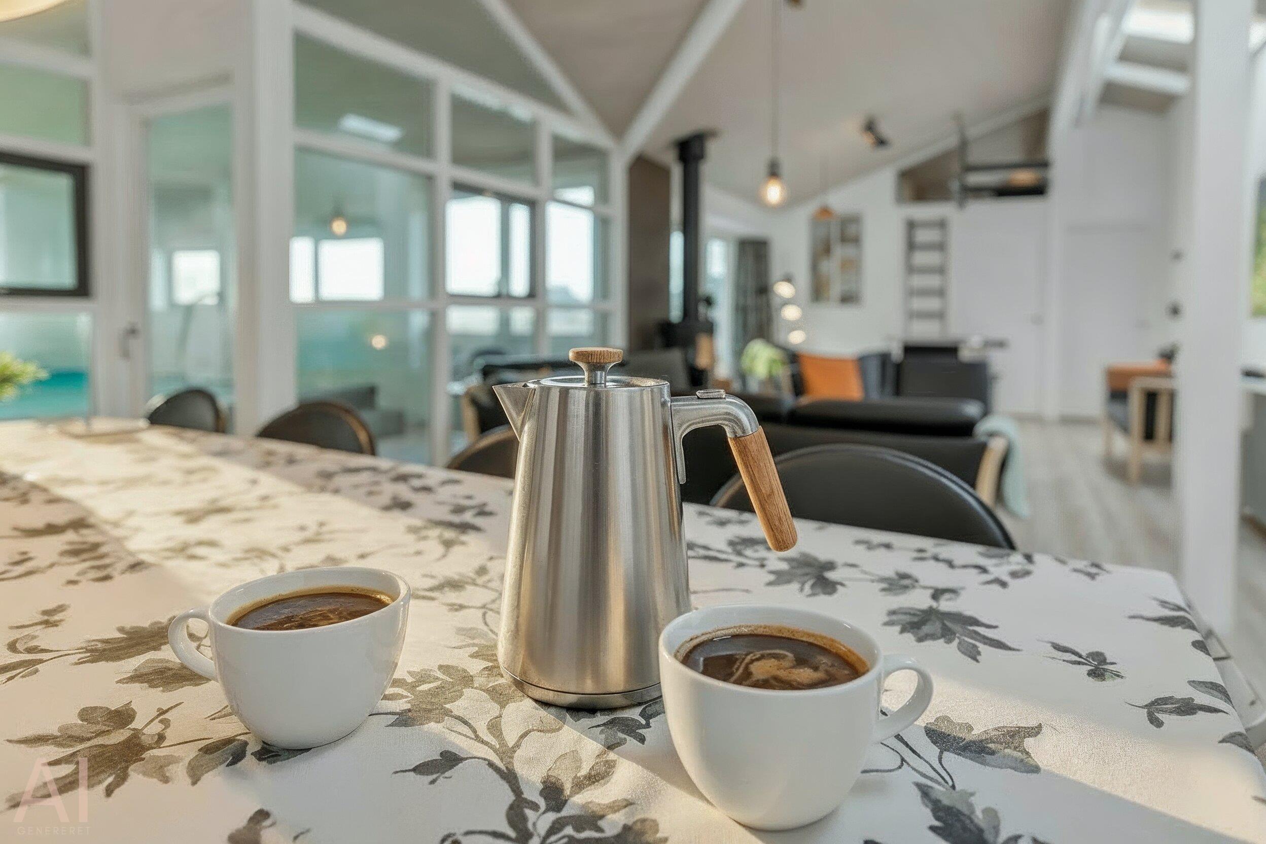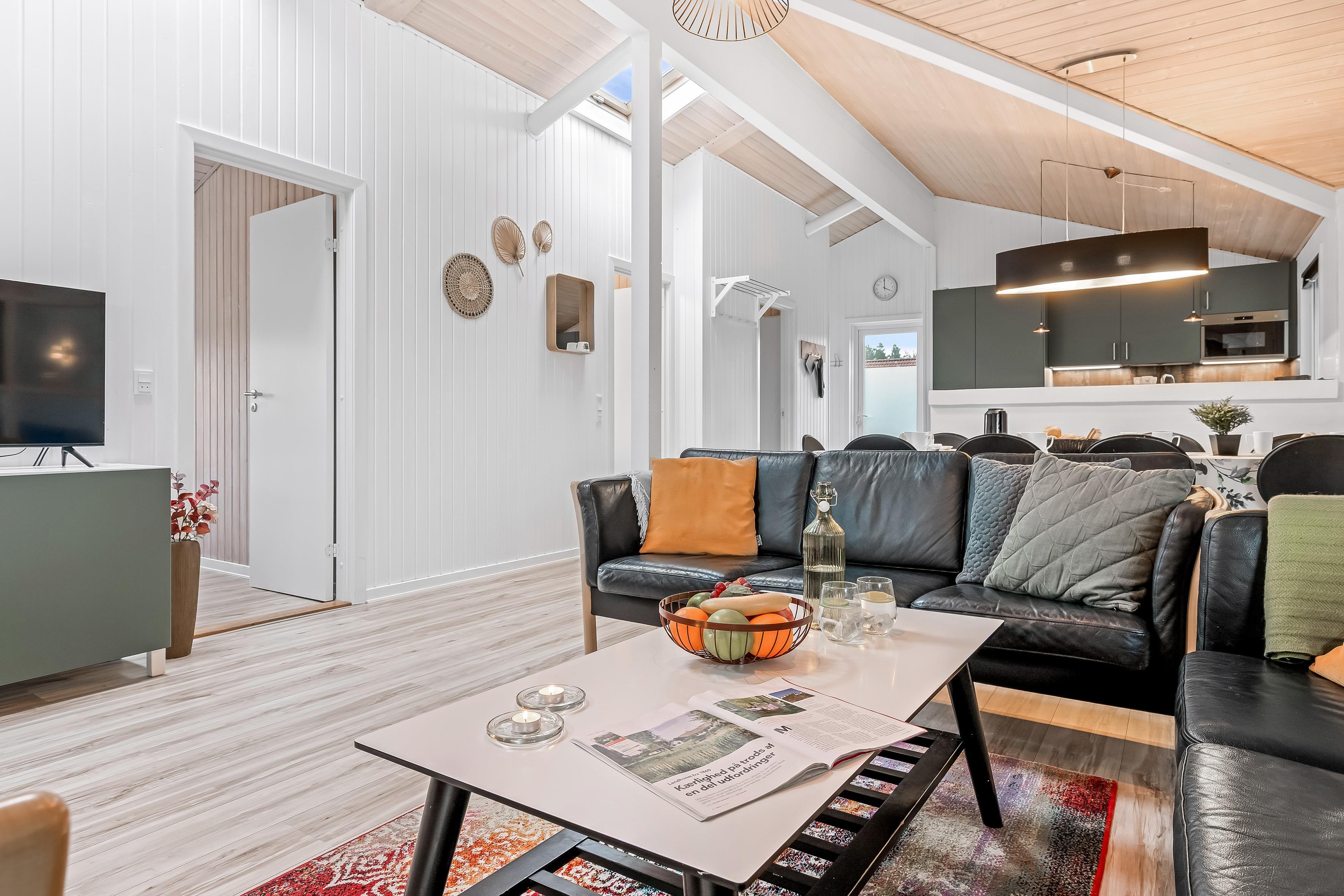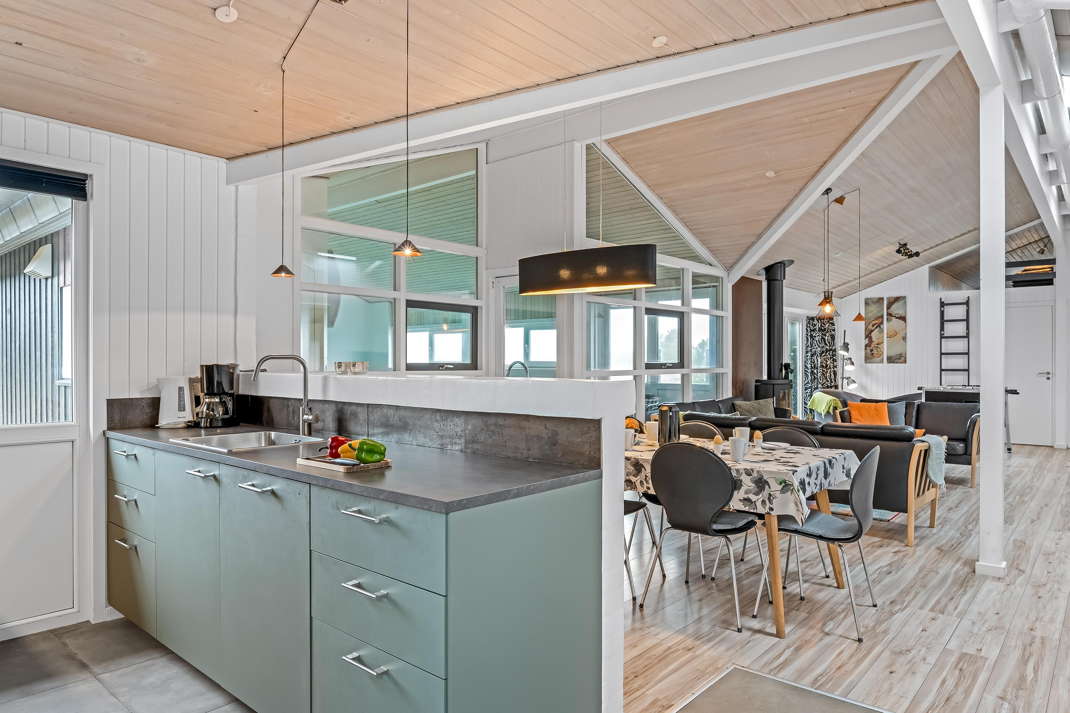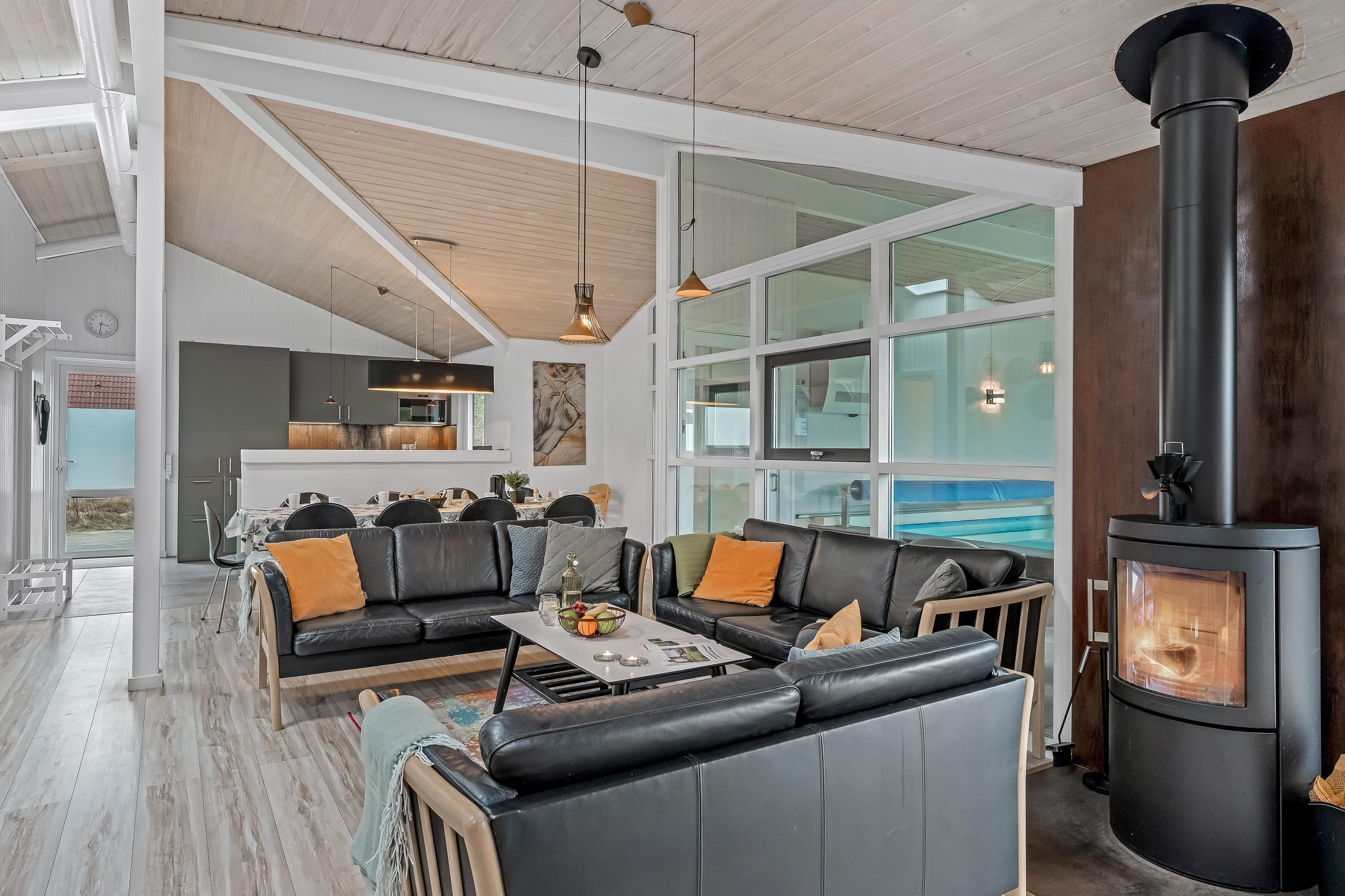Das Herzstück des Hauses ist der offene Wohn- und Essbereich, in dem Küche, Essbereich und Wohnzimmer miteinander verschmelzen. Hier können Sie gemeinsam Zeit verbringen, während einige das moderne Küchenequipment nutzen, während andere sich vor dem Kaminofen entspannen. Eine energieeffiziente Wärmepumpe sorgt für ein angenehmes Raumklima. Es gibt außerdem zwei Badezimmer mit Fußbodenheizung.