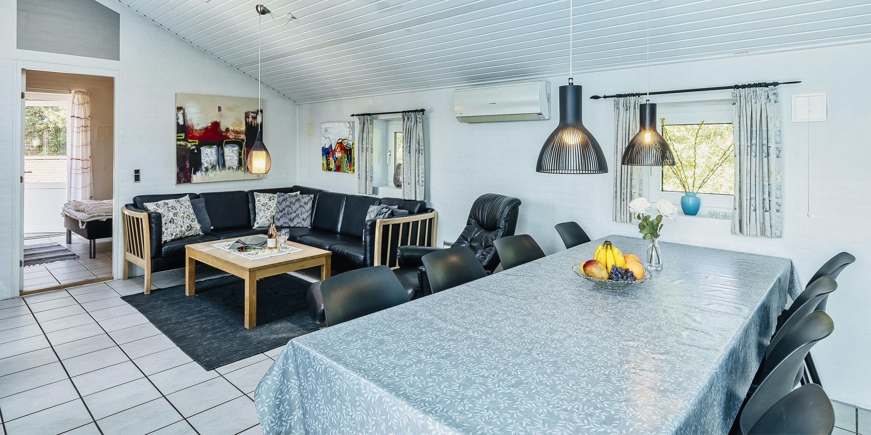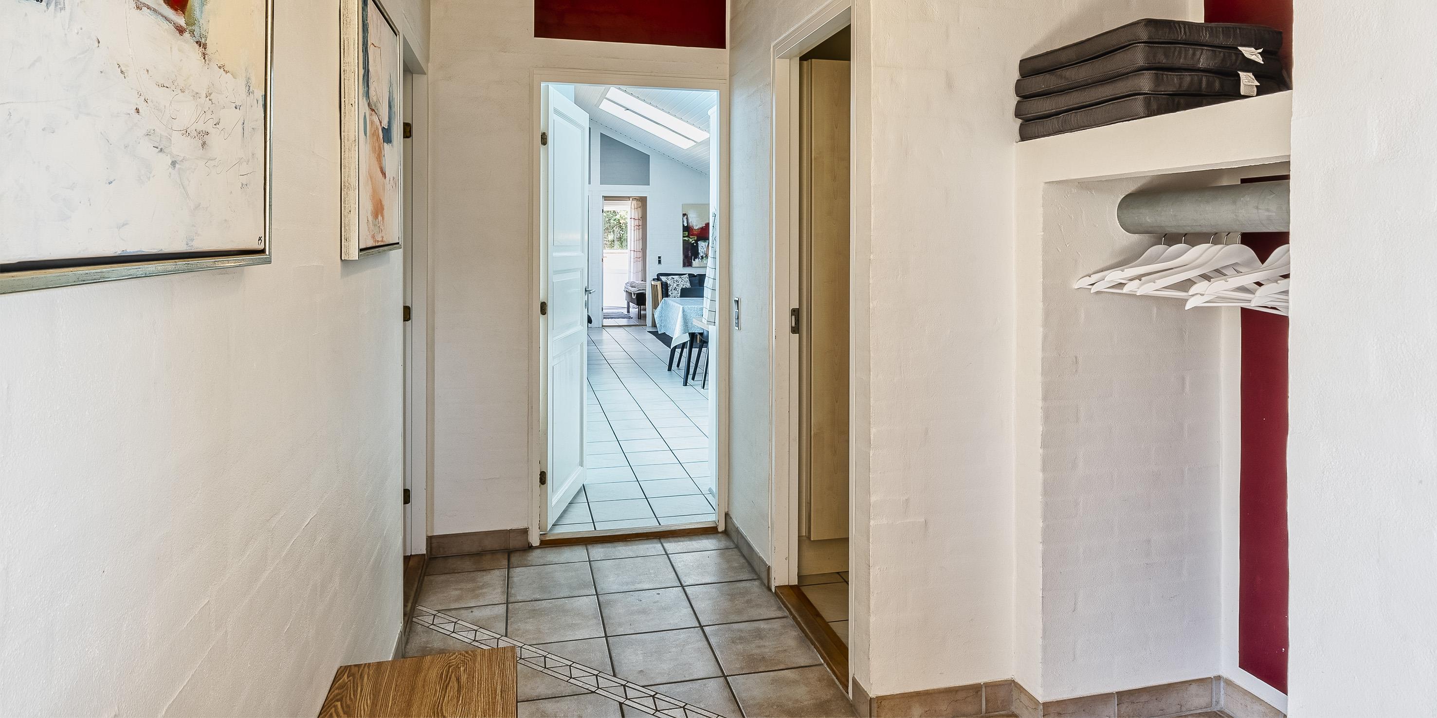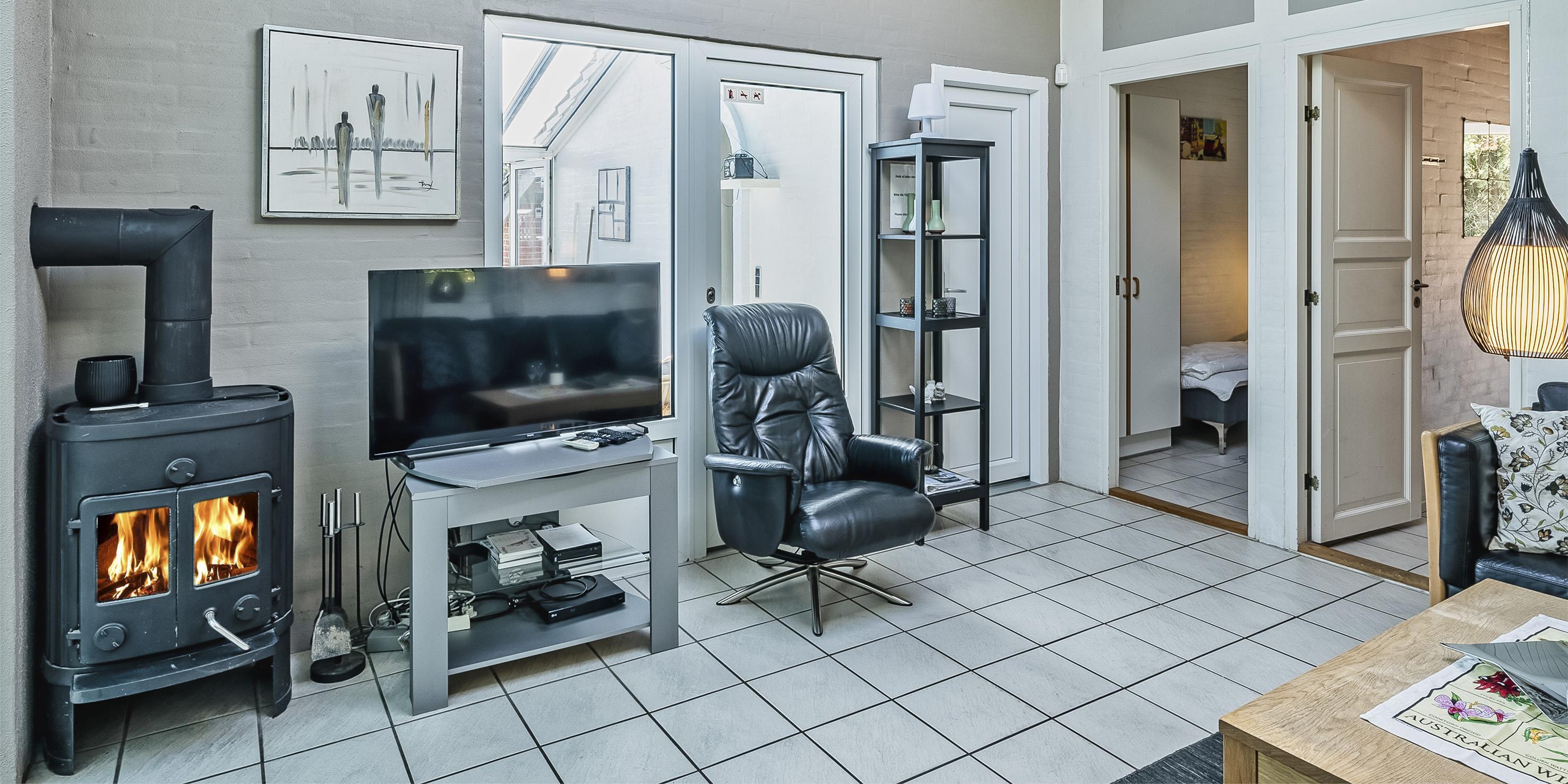 Der Eingangsbereich mit Platz für eine Garderobe und Schuhwerk. Schönes Wohnzimmer mit einem Kaminofen, einem Fernseher, einem DVD-Abspielgerät, einem DAB-Radio und einer PlayStation. Das deutsche Fernsehprogramm empfangen Sie über Stofa, daher sind nur 5-8 deutsche Kanäle zu empfangen. WLAN-Internetzugang steht den Gästen auch zur Verfügung. Der Küchenbereich in offener Verbindung mit dem Essbereich und dem Wohnbereich. Die Küche ist so weit gut ausgestattet und verfügt über einen Herd mit Cerankochfeld, einem Backofen, einer Geschirrspülmaschine, einer Mikrowelle, einem Kühlschrank sowie einem kleinen Gefrierschrank. Es stehen den Gästen zwei schöne Badezimmer mit Fußbodenheizung zur Verfügung. Beide Bäder sind mit einem Handwaschbecken, einem WC und einer Dusche ausgestattet. In dem größeren Badezimmer gibt es einen Whirlpool und eine Sauna. Außerdem sind hier noch die Waschmaschine und der Trockner untergebracht. Das Haus verfügt über insgesamt vier Schlafzimmer. Drei der Schlafzimmer mit je einem Doppelbett(DB+DB+DB), ein Schlafzimmer mit einem Etagenbetten(KS). Ein Bett mit dem Maas von 180x200, 2 Betten mit dem Maas von 140x200 und das Etagenbett mit dem Maas von 1x mit 90x200 und unten mit 150x200.