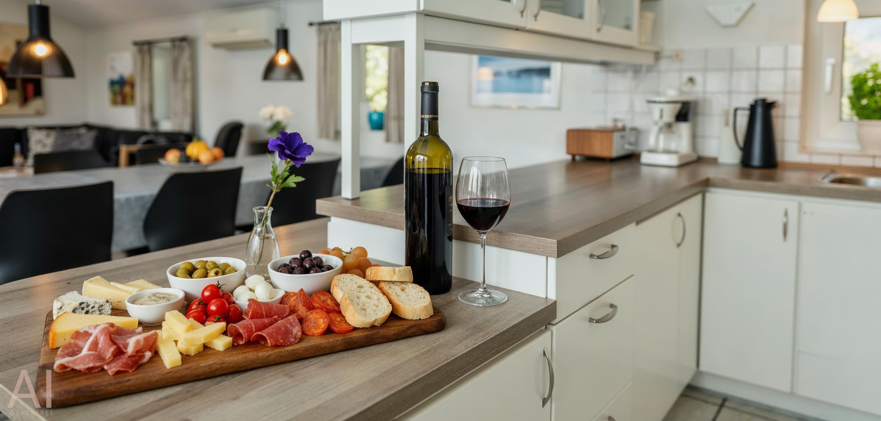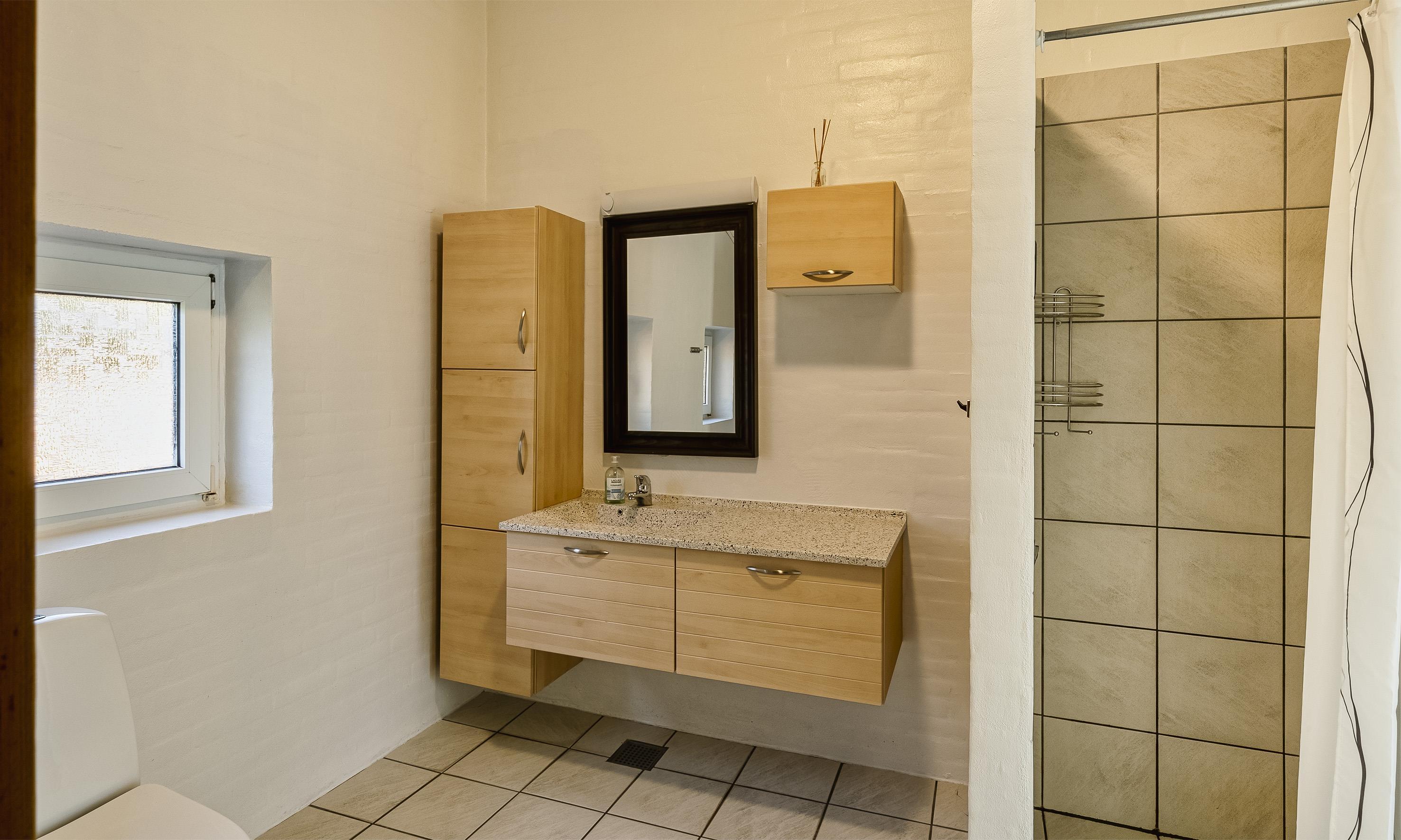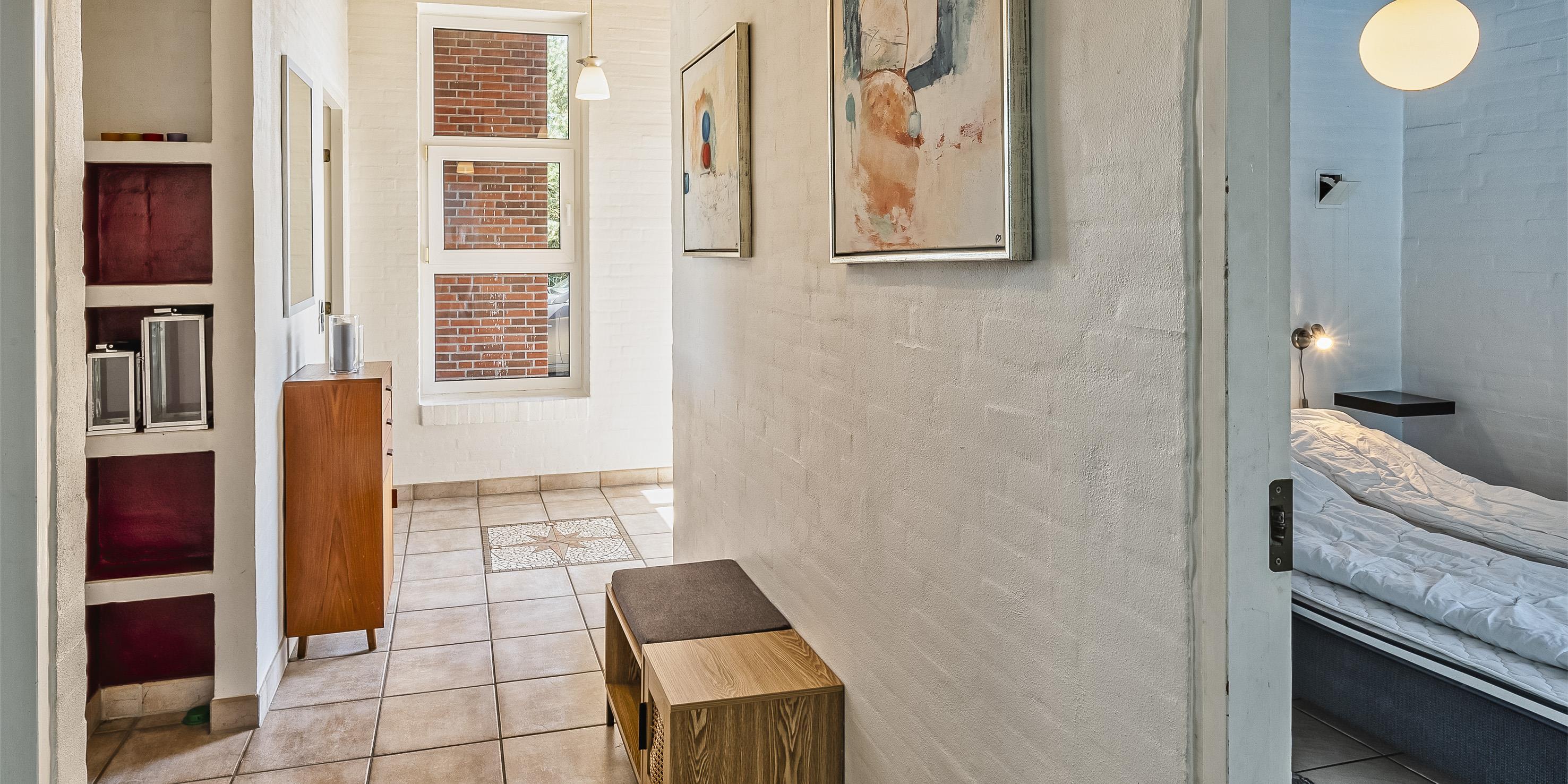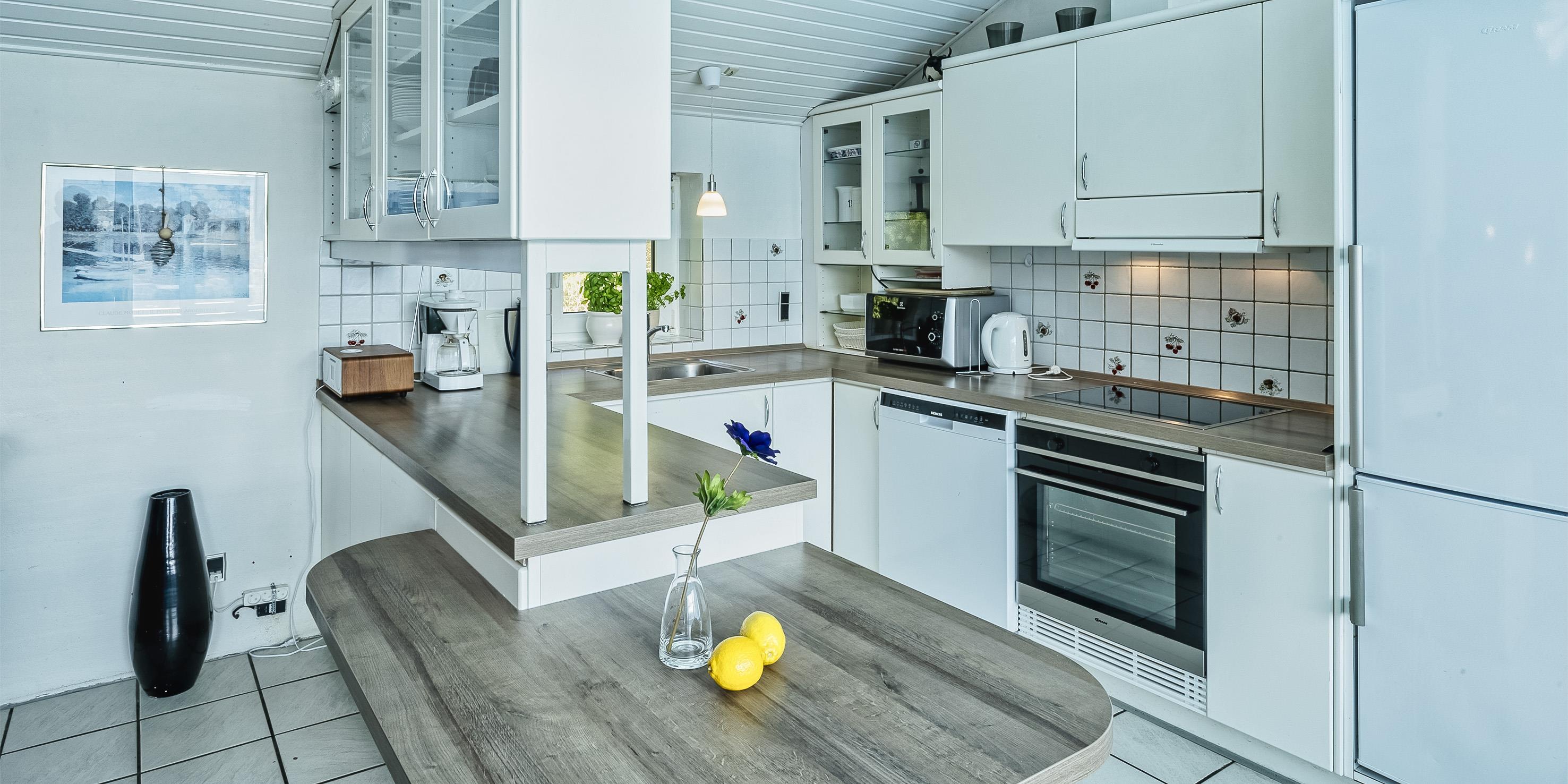 Der Eingangsbereich mit Platz für eine Garderobe und Schuhwerk. Schönes Wohnzimmer mit einem Kaminofen, einem Fernseher, einem DVD-Abspielgerät, einem DAB-Radio und einer PlayStation. Das deutsche Fernsehprogramm empfangen Sie über Stofa, daher sind nur 5-8 deutsche Kanäle zu empfangen. WLAN-Internetzugang steht den Gästen auch zur Verfügung. Der Küchenbereich in offener Verbindung mit dem Essbereich und dem Wohnbereich. Die Küche ist so weit gut ausgestattet und verfügt über einen Herd mit Cerankochfeld, einem Backofen, einer Geschirrspülmaschine, einer Mikrowelle, einem Kühlschrank sowie einem kleinen Gefrierschrank. Es stehen den Gästen zwei schöne Badezimmer mit Fußbodenheizung zur Verfügung. Beide Bäder sind mit einem Handwaschbecken, einem WC und einer Dusche ausgestattet. In dem größeren Badezimmer gibt es einen Whirlpool und eine Sauna. Außerdem sind hier noch die Waschmaschine und der Trockner untergebracht. Das Haus verfügt über insgesamt vier Schlafzimmer. Drei der Schlafzimmer mit je einem Doppelbett(DB+DB+DB), ein Schlafzimmer mit einem Etagenbetten(KS). Ein Bett mit dem Maas von 180x200, 2 Betten mit dem Maas von 140x200 und das Etagenbett mit dem Maas von 1x mit 90x200 und unten mit 150x200.