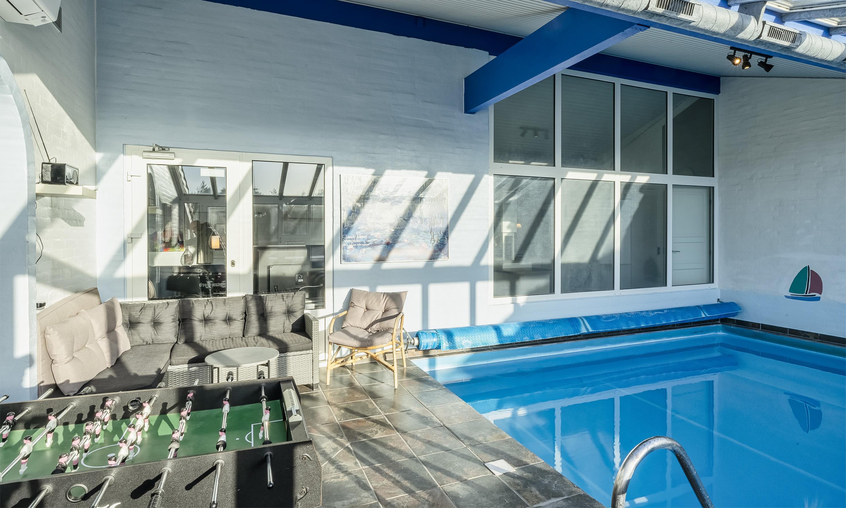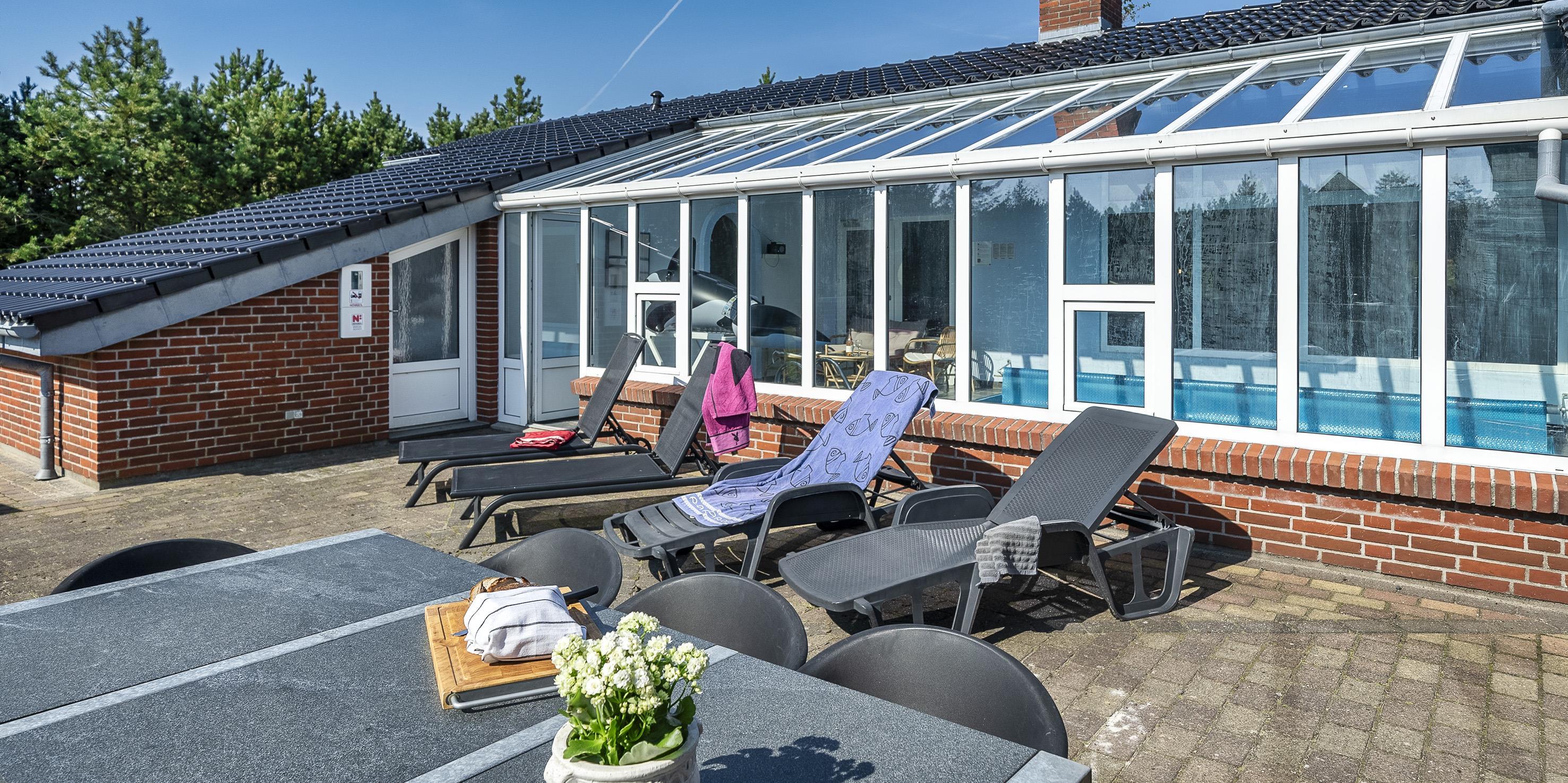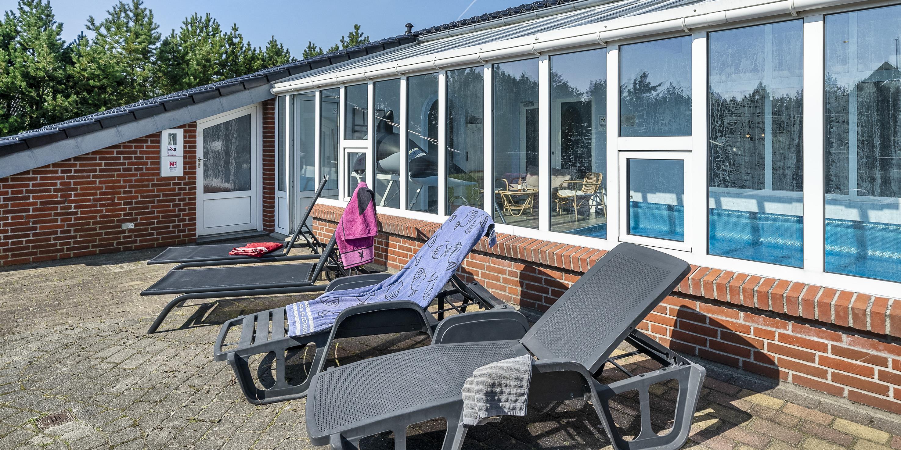 Poolraum ist mit einem Lounge-Set ausgestattet, so das Sie zwischendurch sich auch mal vom Schwimmen erholen können. Der Pool hat eine Gösse von ca. 4,8 x 4,8 x 1 Meter ( Länge x Breite x Tiefe). Das Haus verfügt zusätzlich über eine Wärmepumpe. Mit dieser Wärmepumpe haben Sie die Möglichkeit die Stromkosten zu senken, denn Sie ist energiesparend. Das Haus ist kinderfreundlich ausgestattet und verfügt über eine Schaukel, einen Sandkasten, ein Fußballtor und eine Tischtennisplatte, die im Außenbereich überdacht ist. Es gibt um das Ferienhaus zwei teilweise geschlossene Terrassen, die gefliest sind, auf denen die Abende bis weit in den Frühling/Herbst hinein verlängert und genossen werden können. Eine Terrasse hat ein kleines Dach. Im Sommer stehen Gasgrills zur Verfügung.(Gas muss man selber mitbringen) Das Rauchen im Haus ist verboten. Es sind maximal 2 Haustiere erlaubt. Das Ferienhaus wurde in 1989 erbaut und in 2005 renoviert. Es fallen zusätzlich Wasserkosten an. Diese können Sie im Büro nachfragen.
