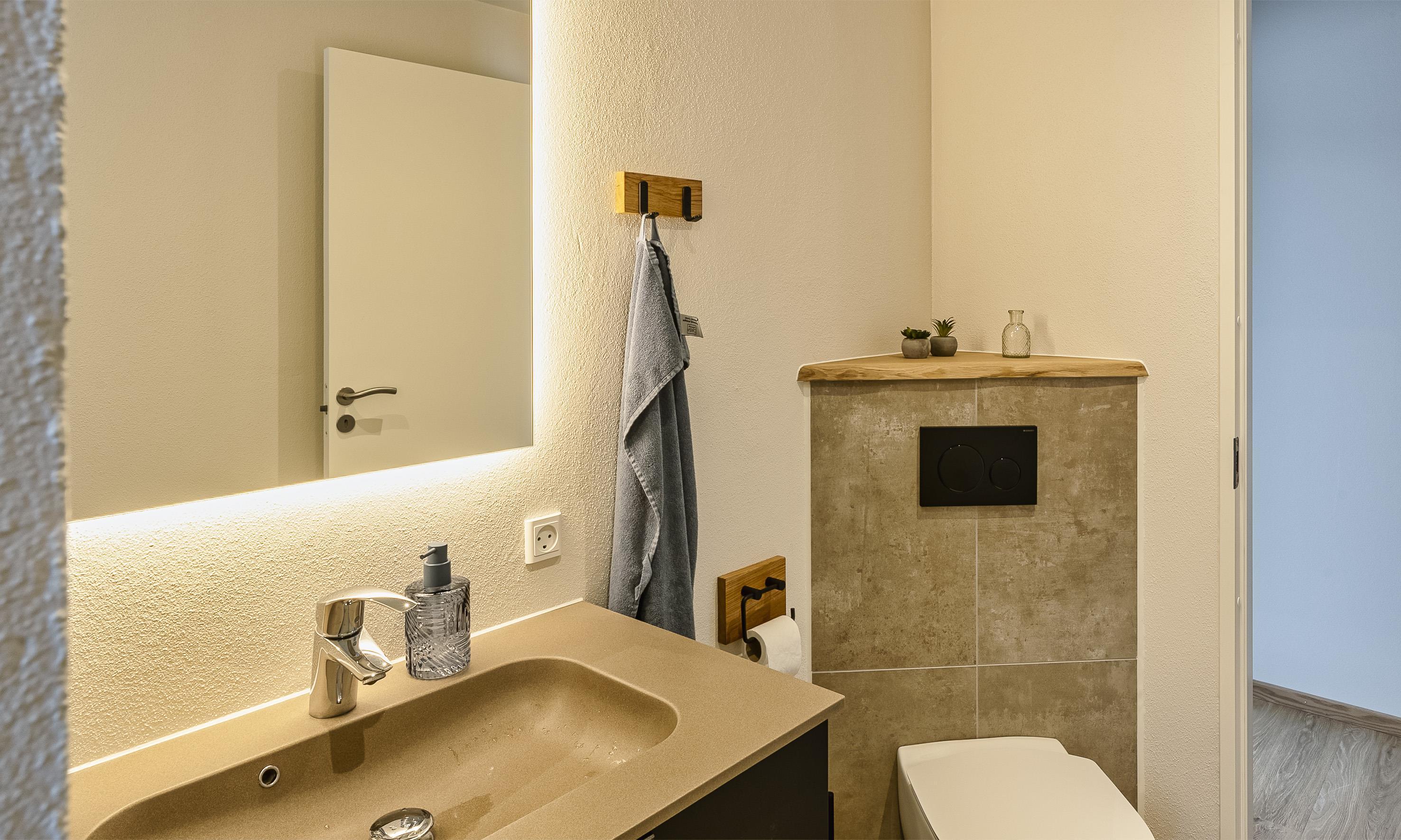 Badezimmer mit Toilette, Dusche und Waschbecken