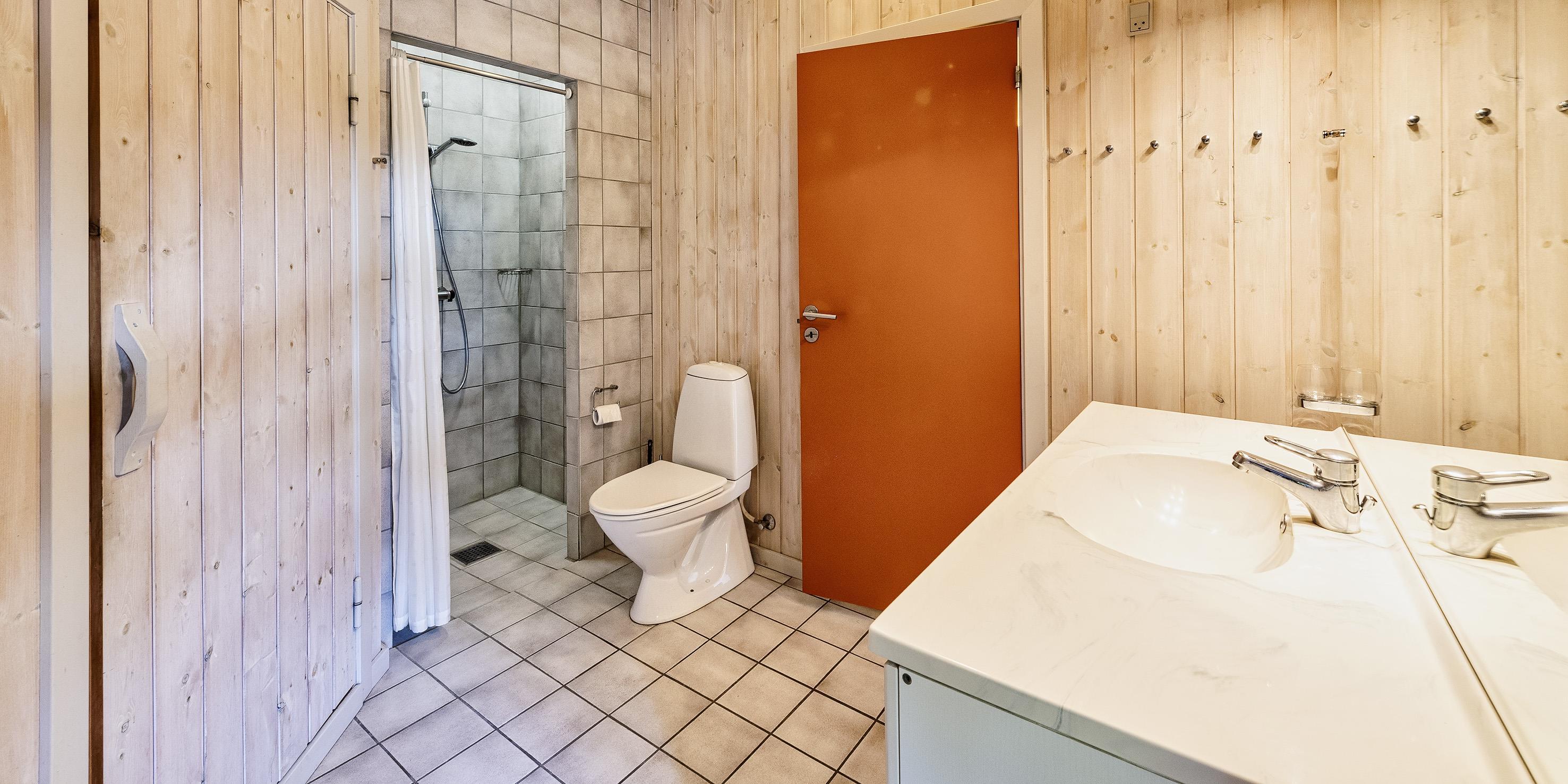 Badezimmer mit Toilette, Dusche und Waschbecken
