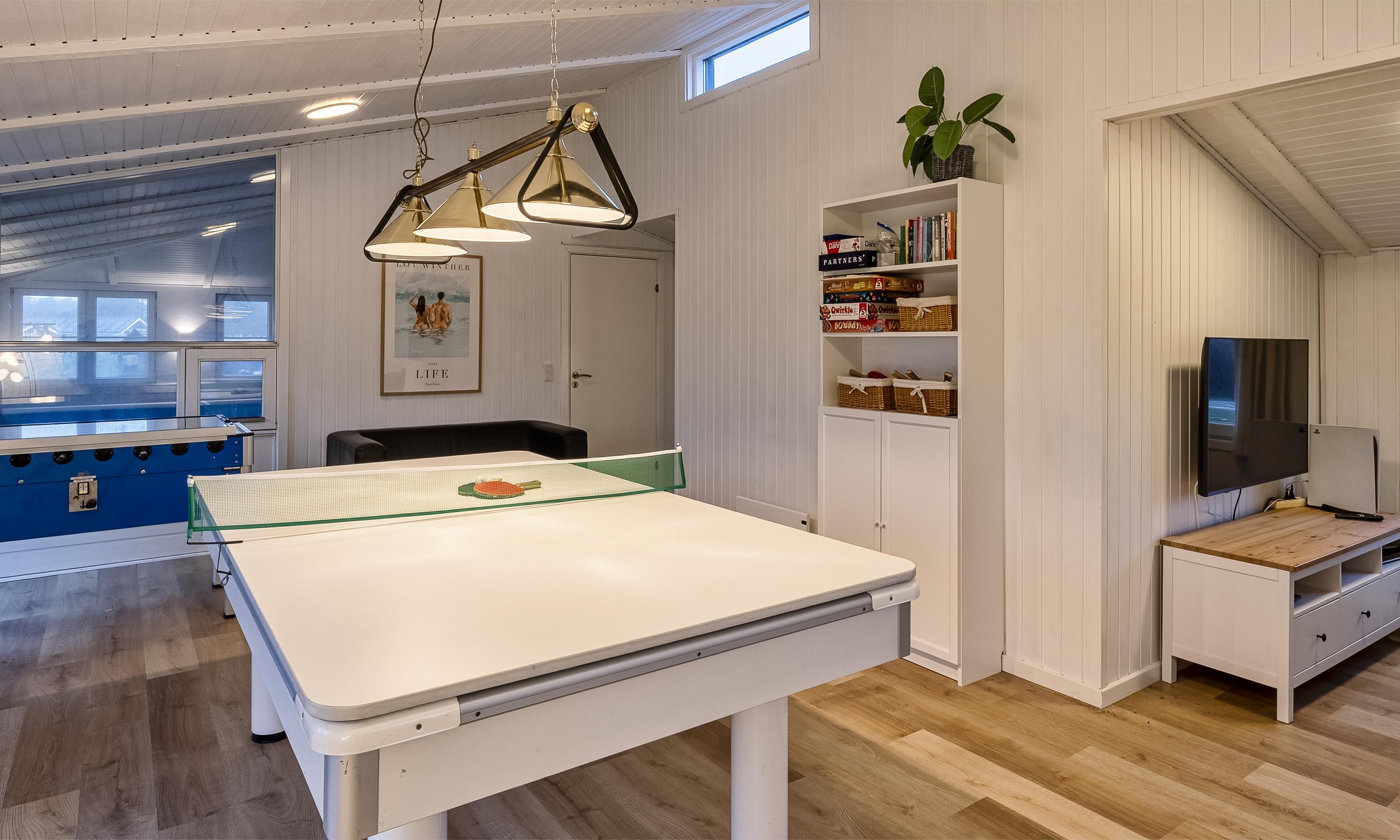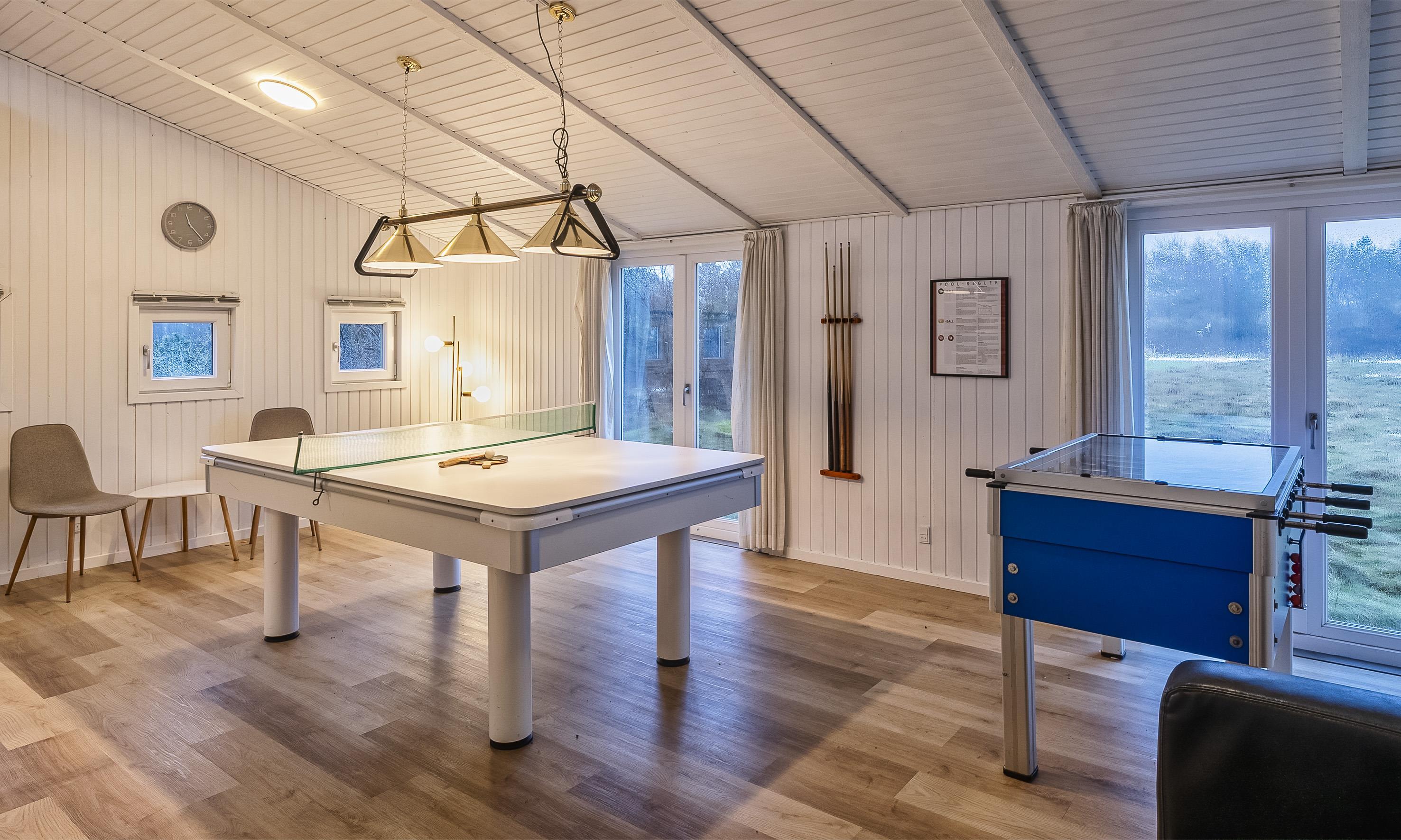 Tischfußball, Tischtennis und Billardtisch.