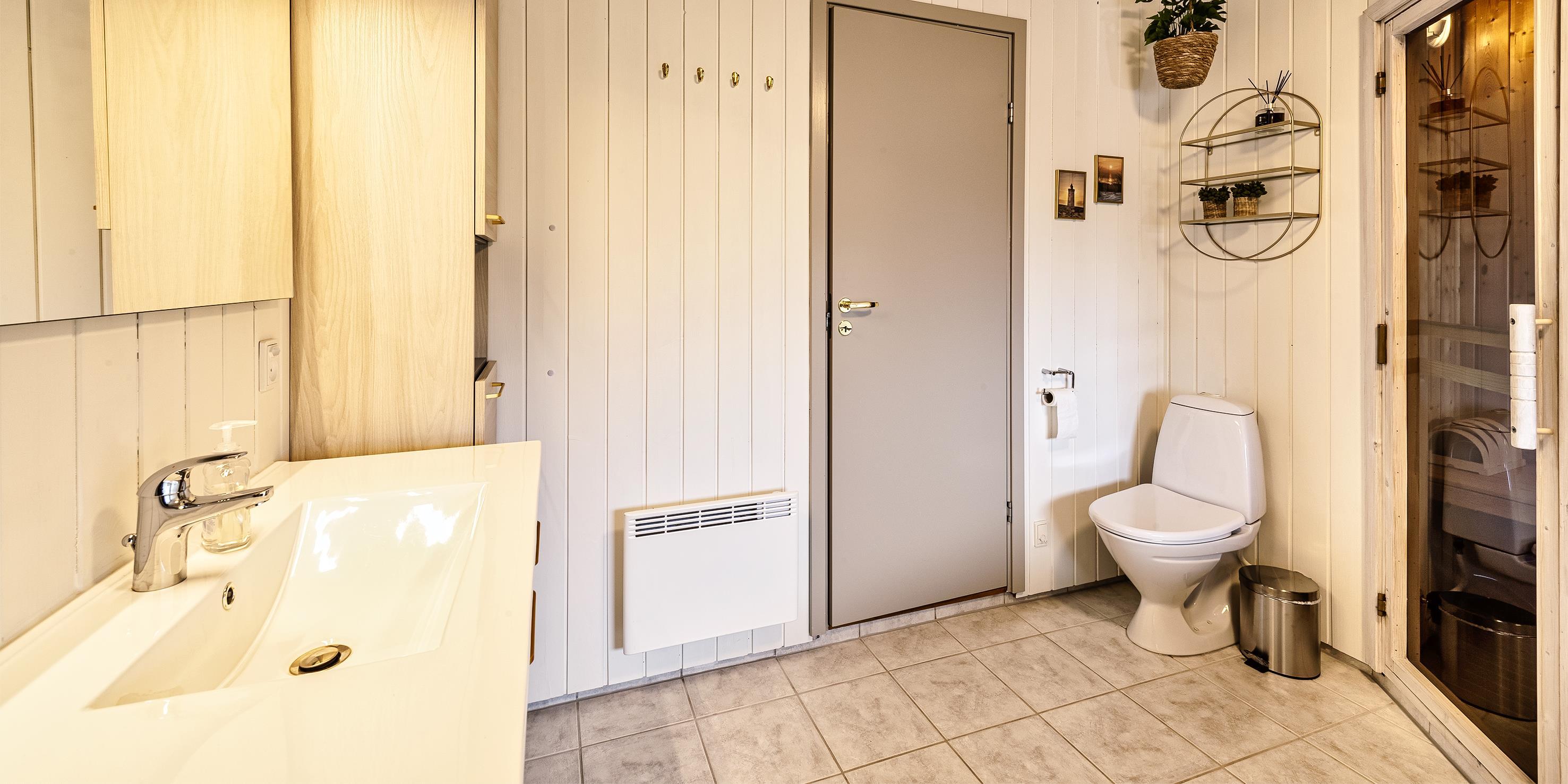 Badezimmer mit Toilette, Dusche und Waschbecken