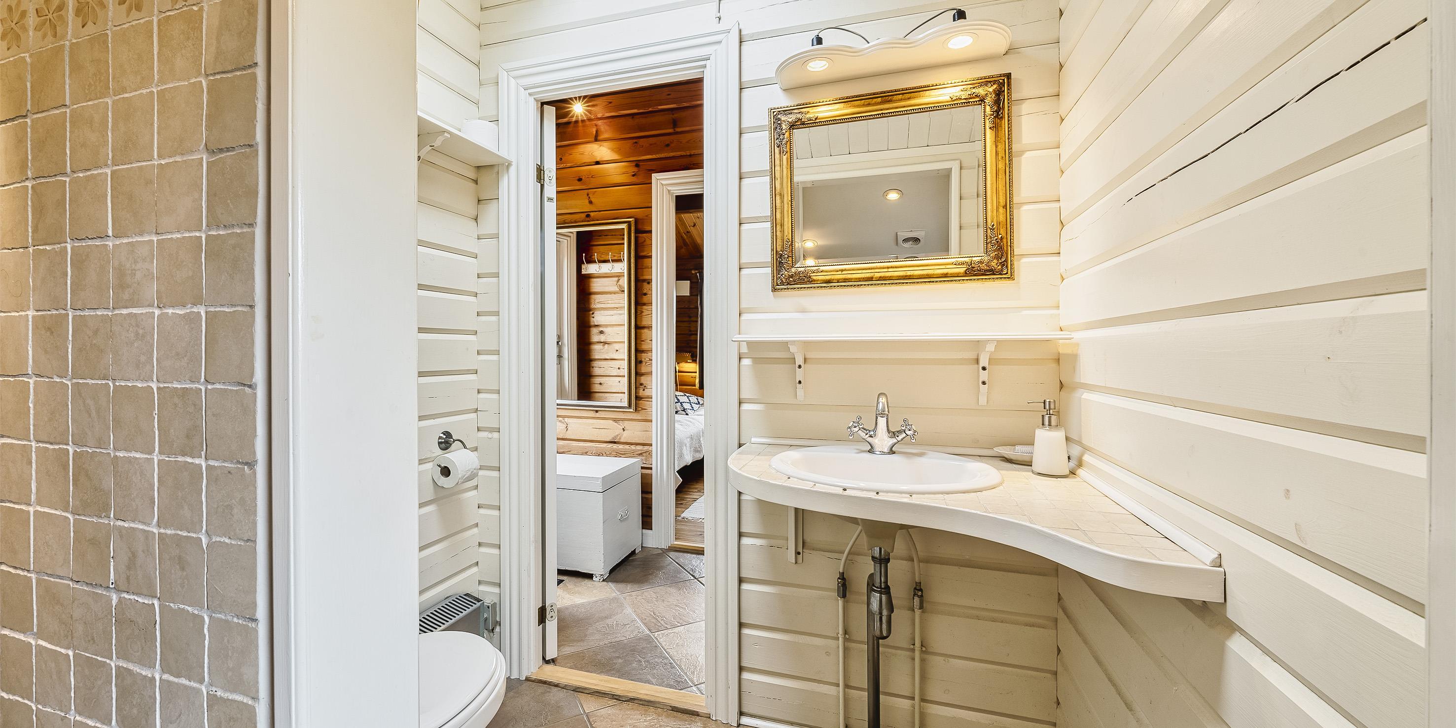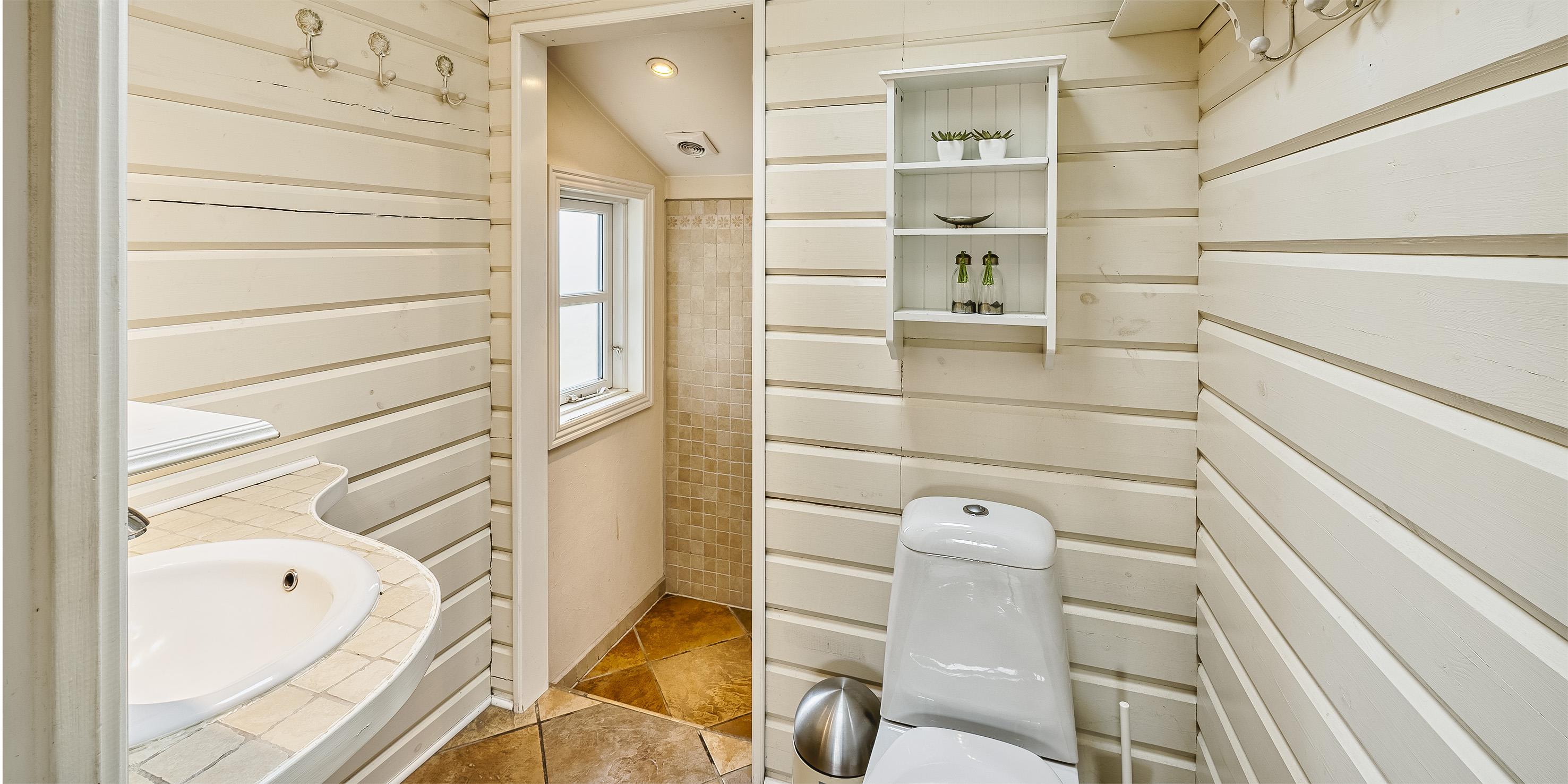 Badezimmer mit Toilette, Dusche und Waschbecken