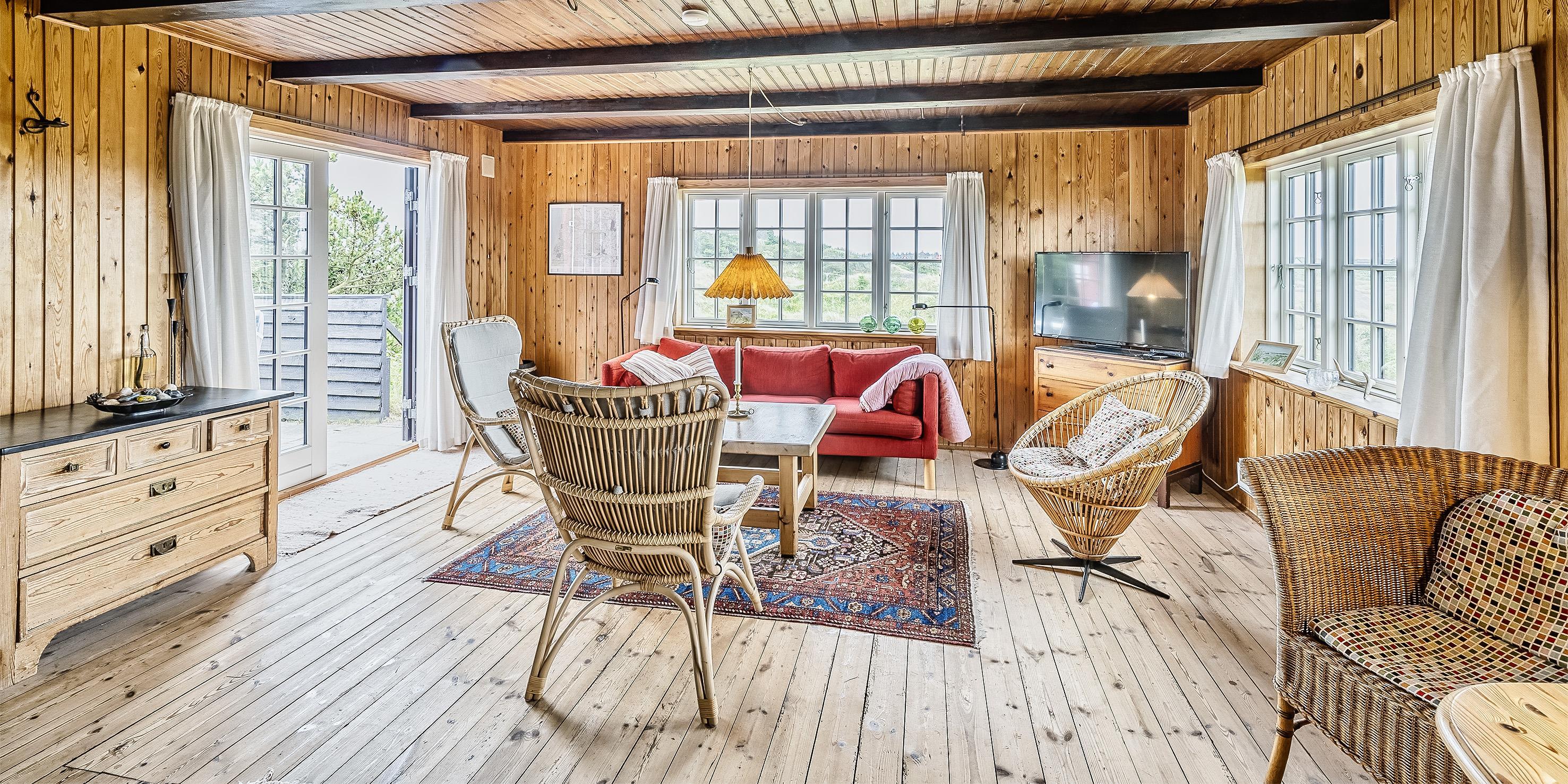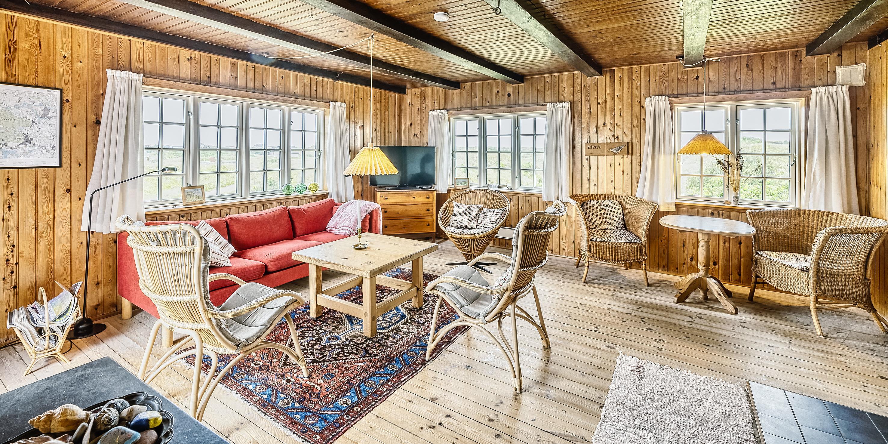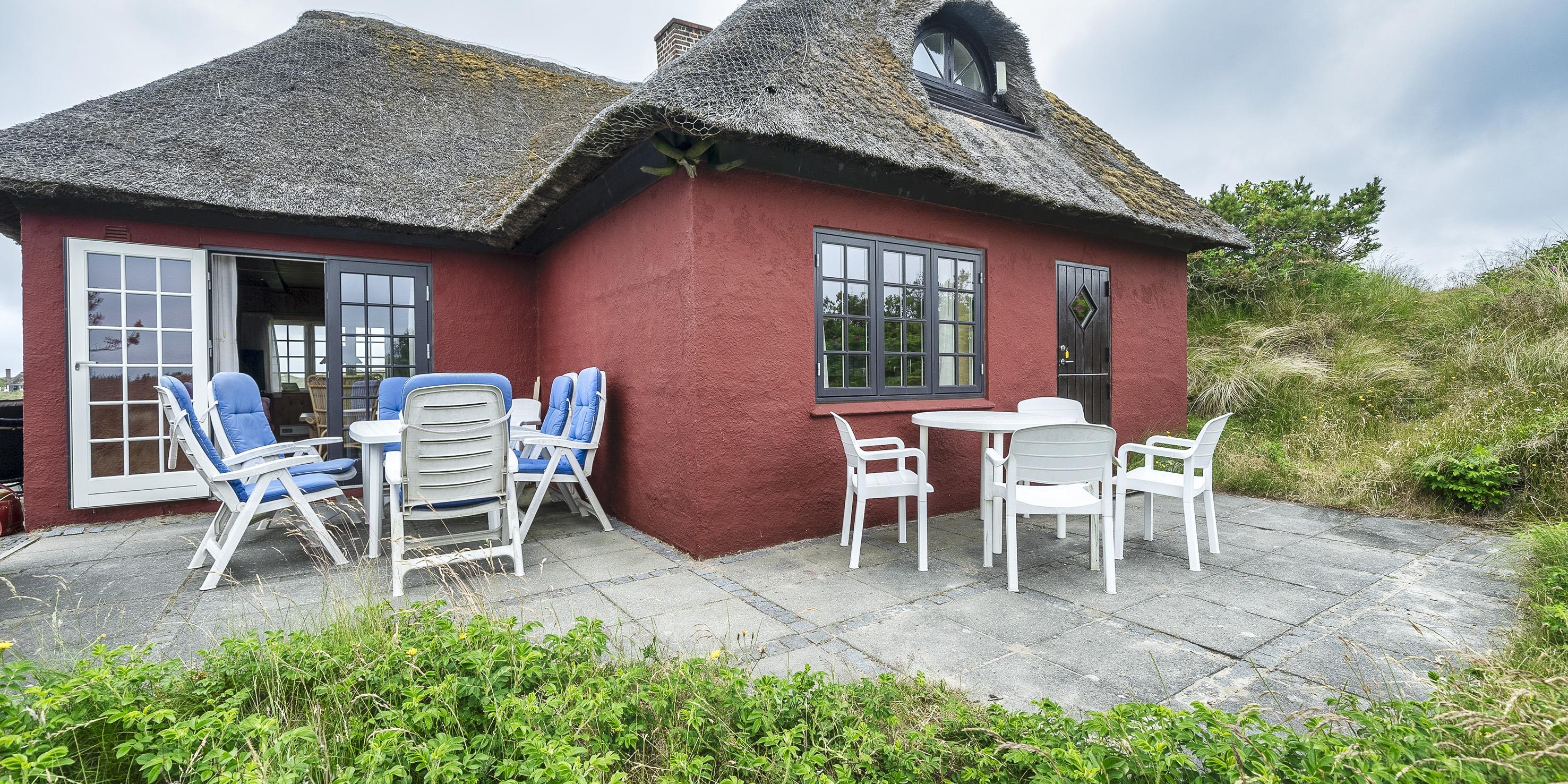 Typisch dänisches Reetdachhaus mit dem Namen ”Thule”, auf einem 3900 m2 großen Naturgrundstück oben auf der Düne gelegen mit wundervollem Panoramablick auf das Ferienhausgebiet. Der Strand ist nur ca. 500 Meter vom Ferienhaus entfernt. Um an das Ferienhaus zu gelangen ist ein größerer Aufstieg notwendig, wobei hier allerdings kein festes Treppengeländer angebracht ist. Es ist ein freier Aufstieg. Das Ferienhaus ist für 6 Erwachsene und 2 Kindern ausgestattet und die Räumlichkeiten verteilen sich auf 2 Ebenen. Dieses Ferienhaus stahlt diesen urigen und hyggligen (gemütlichen) Charme aus. Im Erdgeschoss befindet sich der Wohnbereich, die Küche mit Essplatz, das Badezimmer und ein Schlafzimmer. Im Obergeschoss finden Sie dann weitere drei Schlafzimmer (die Betten sind ca. 180 cm Lang). Der Wohnbereich ist mit einem Kamin ausgestattet sowie eine Wärmepumpe. Das deutsche Fernsehprogramm empfangen Sie über eine Parabolantenne. Google Chrome Cast. Im ganzen Haus befindet sich Dielenfußboden außer im Badezimmer. Die Küche verfügt über einen Herd mit Kochplatten, einer Geschirrspülmaschine und einer Kühl- und Gefrierkombination (ca. 30 ltr.). Das Badezimmer verfügt über ein WC, ein Handwaschbecken und einer Dusche. Die Waschmaschine und der Trockner sind hier im Badezimmer untergebracht. Eine im Badezimmer gelegte Fußbodenheizung sorgt für wohlige Wärme in den Morgen- und Abendstunden. Das Schlafzimmer im Erdgeschoss ist mit zwei Einzelbetten ausgestattet. Zwei von den Schlafzimmern im Obergeschoss sind mit je einem Doppelbett ausgestattet und das Dritte verfügt über 2 Einzelbetten. Die Aussicht von den Schlafräumen im Obergeschoss ist einfach wundervoll, dazu die -halbrunden Fenster mit teilweise Rüschen umrandet, da fühlen Sie sich gleich wie in einer Puppenstube. Ein Kinderhochstuhl für die ganz kleinen Gäste steht im Haus zur Verfügung. Das Ferienhaus verfügt über einen Internetanschluss (W-Lan). Das Rauchen im Ferienhaus ist nicht erlaubt. Ein Hund ist erlaubt aber keine Katzen. Ein großer Terrassenbereich ums Haus steht Ihnen zur Verfügung. Für die kleinen Gäste steht ein Schaukelstativ und eine Sandkiste auf dem Grundstück zur Verfügung. Von hier können Sie den Ausblick bei einer Tasse Kaffee wundervoll schweifen lassen und genießen. Das Ferienhaus wurde um 1937 erbaut und in 2001 teilweise renoviert. 4 Schlafzimmern: DB + DB + 2B + 2B.