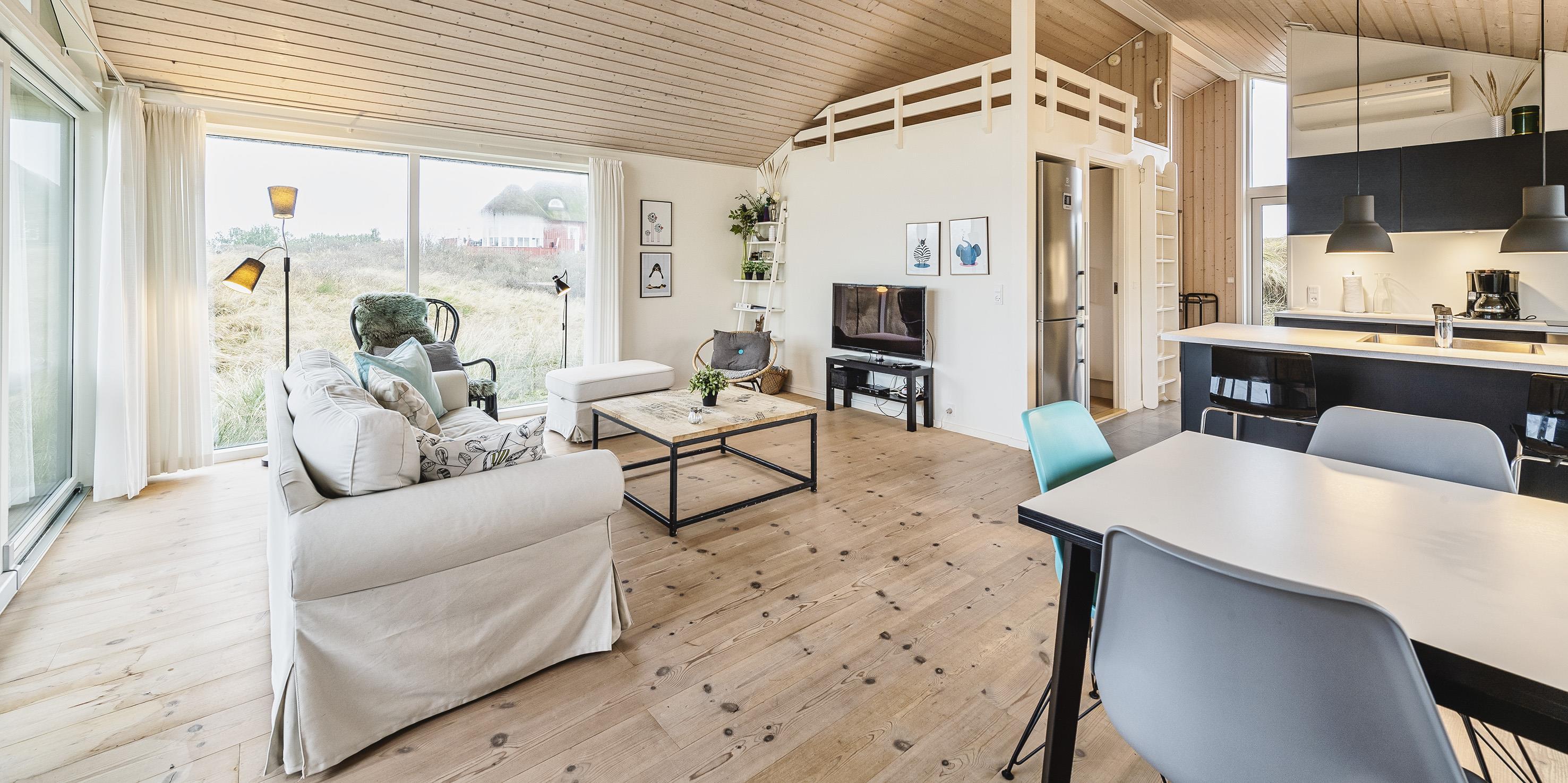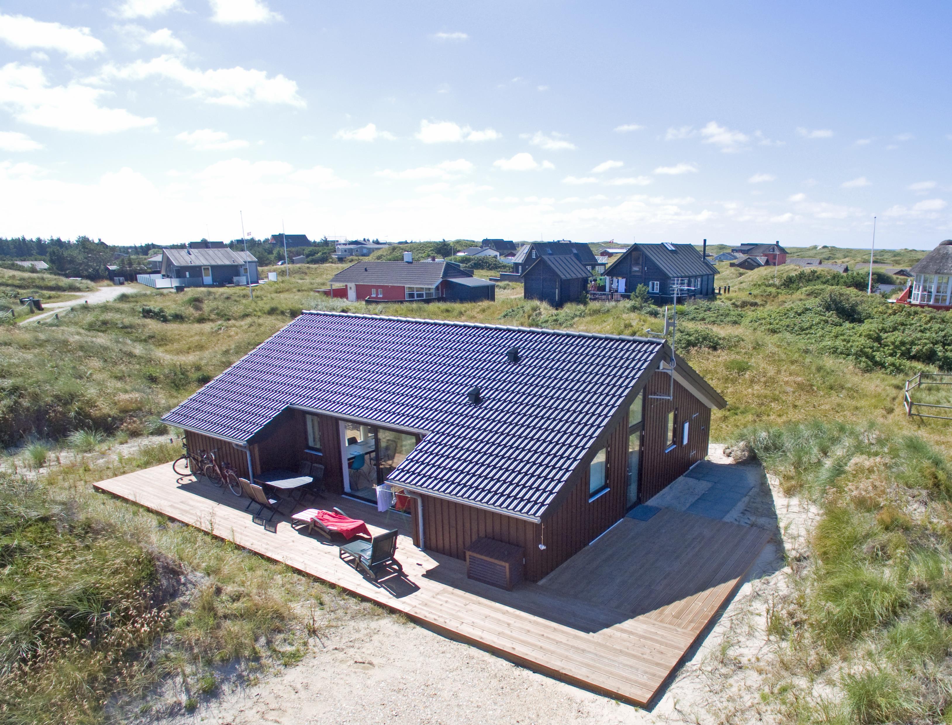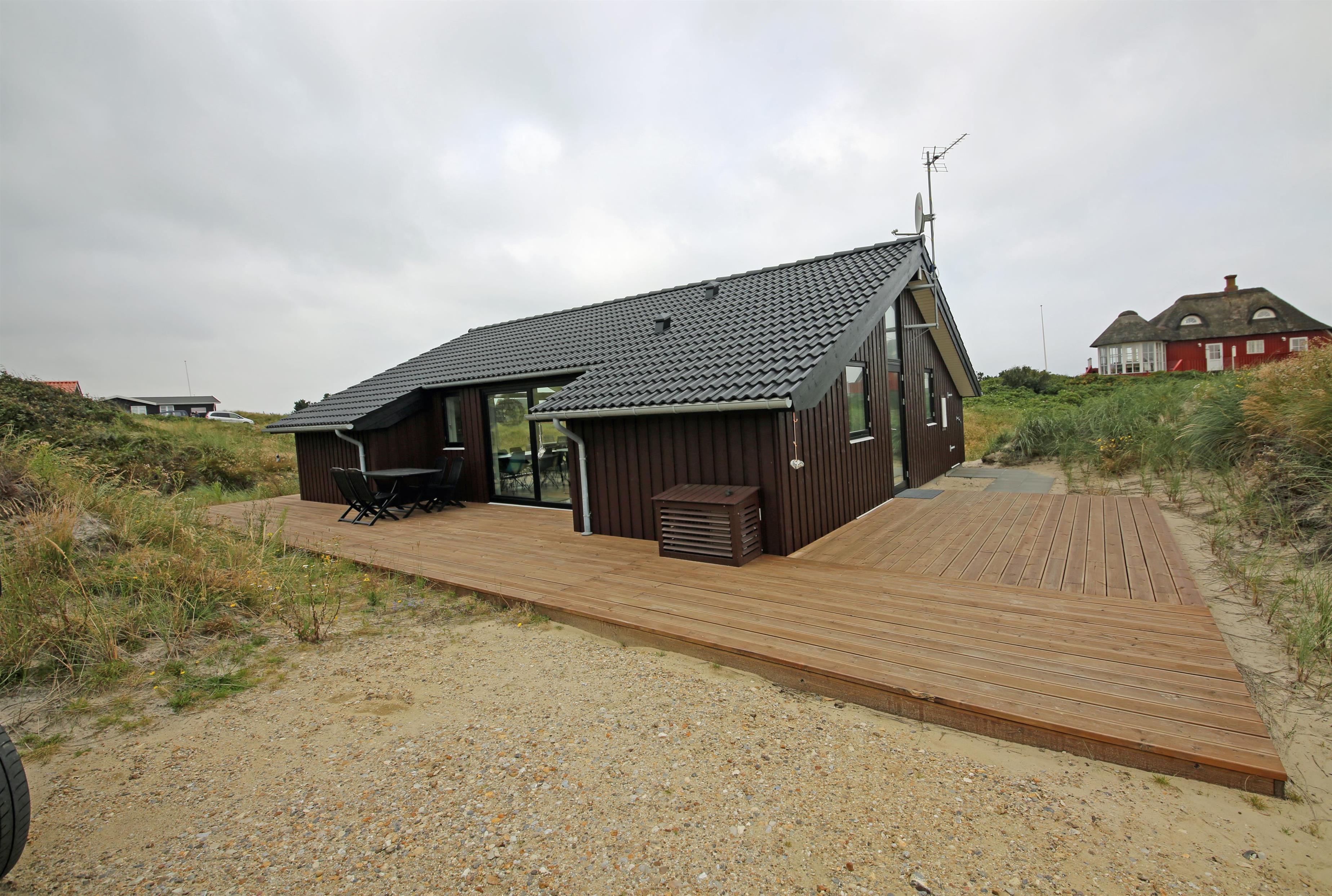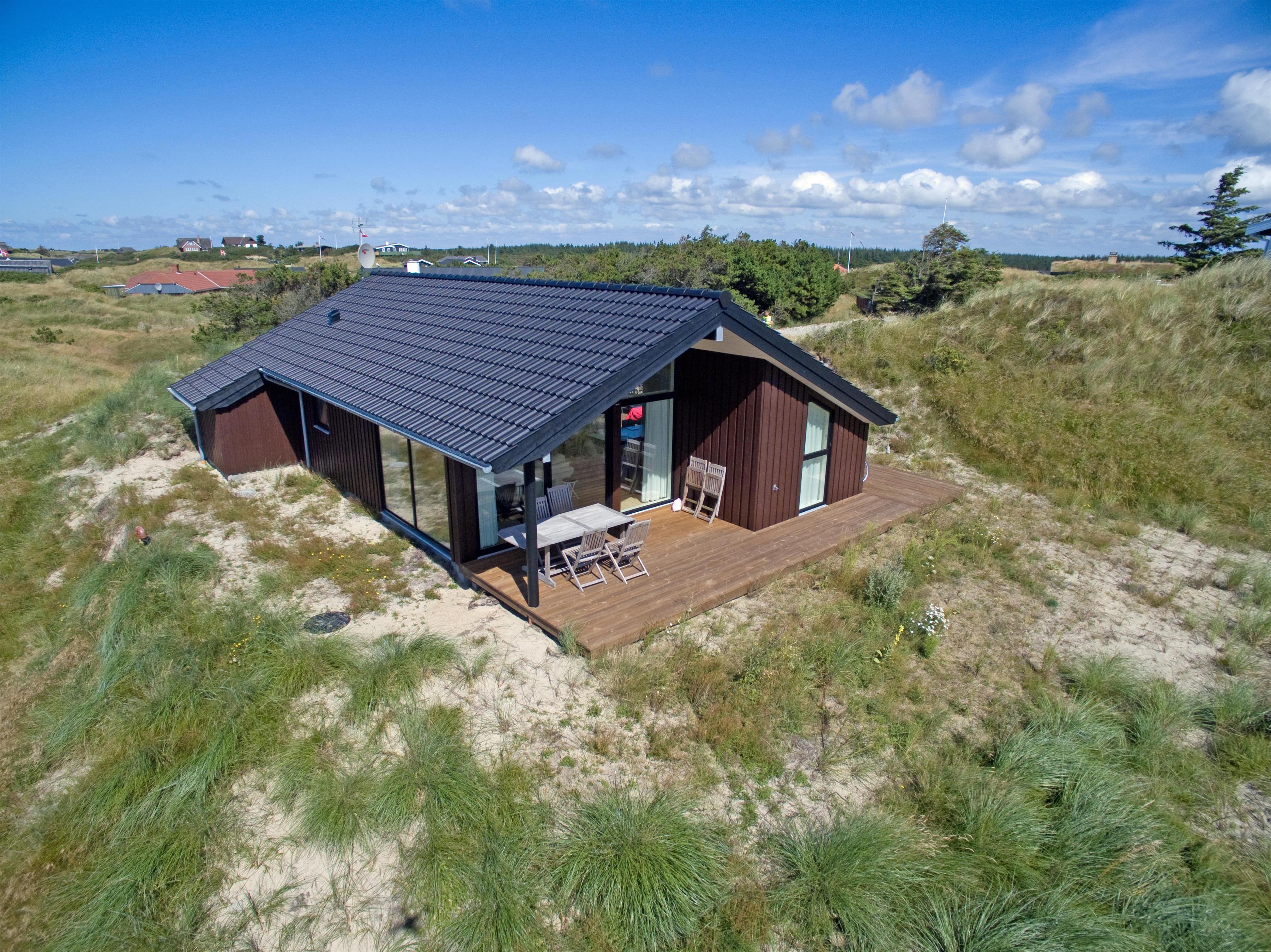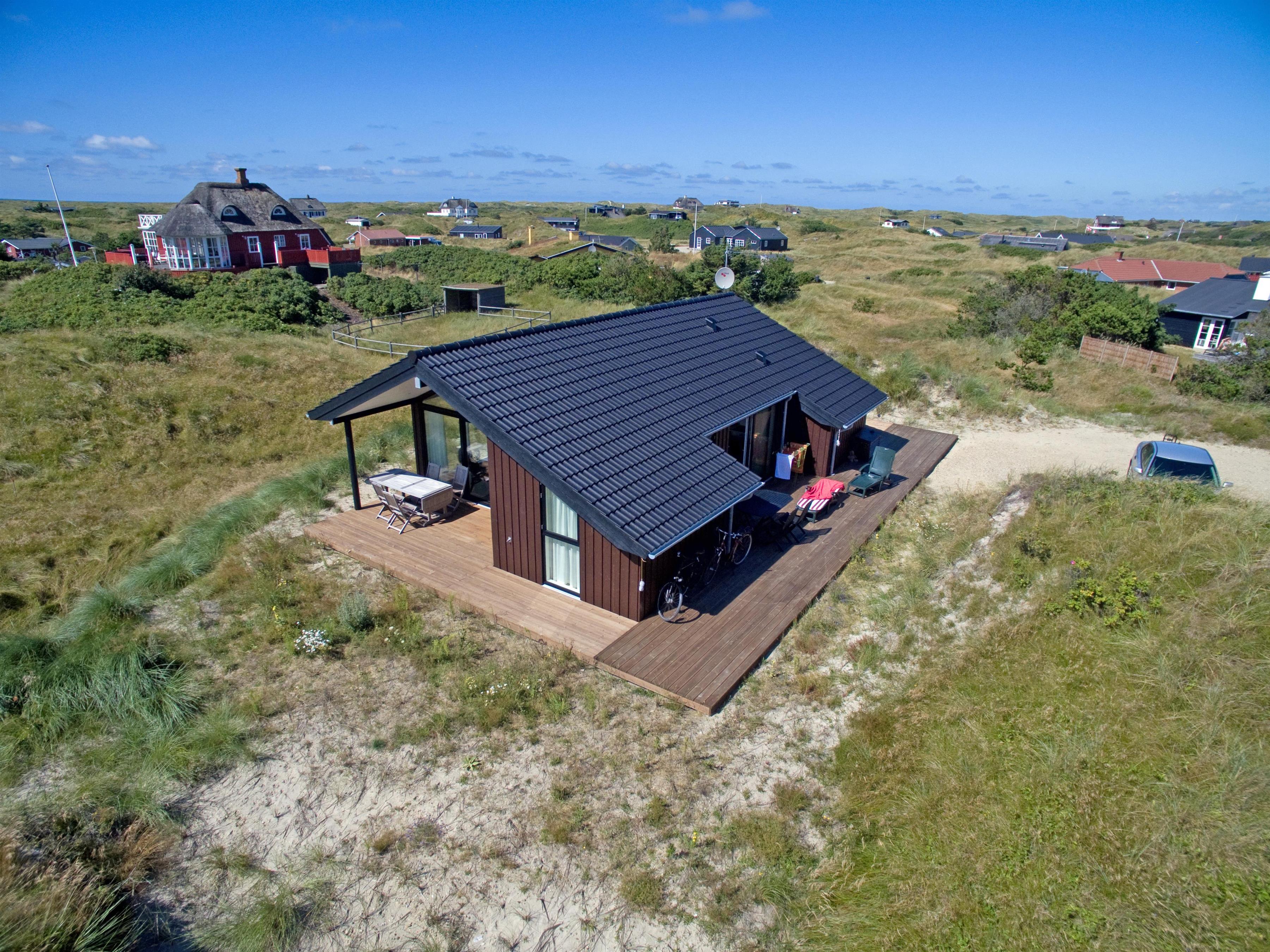 Attraktives, flottes und relativ neues Ferienhaus auf einer Düne gebaut und für 6 Personen ausgestattet. Es sind rund 300 Meter vom Ferienhaus zum Strand. Das ganze Ferienhaus ist mit einem tollen Holzfußboden verlegt, außer die Bereiche der Küche, des Badezimmers und des Eingangs. Das Wohnzimmer ist geschmackvoll eingerichtet und durch die großen Fenster kommt viel Licht in das Haus. Ein kleiner Hems verleitet zum relaxen ein. Es befindet sich eine Warmepumpe im Ferienhaus. Mit dieser Warmepumpe haben sie die Möglichkeit die Stromkosten zu senken, denn die Warmepumpe ist energiesparend. Das deutsche Fernsehprogramm ist über eine Parabolantenne zu empfangen. Google Chromecast. Die offene Küche ist sehr modern und verfügt über einen Herd mit Cerankochfeld, einem Backofen, einer Geschirrspülmaschine, einer Mikrowelle und einer Kühl- und Gefrierkombination. Das Badezimmer ist mit einem WC, einem Handwaschbecken, einer Dusche und einer Fußbodenheizung ausgestattet. Die Waschmaschine ist im Badezimmer untergebracht. Das Ferienhaus verfügt über drei Schlafzimmer: DB + DB + 2B. Das Ferienhaus verfügt über einen Internetanschluss (W-Lan). Es gibt eine große Holzterrasse, die fasst um das ganze Ferienhaus verlegt ist. Ein Teil davon ist sogar überdacht. Für dieses Ferienhaus entstehen Zusatzkosten für den Wasserverbrauch. Es sind keine Haustiere erlaubt. Das Rauchen im Ferienhaus ist auch nicht erlaubt. Das Ferienhaus ist in 2014 gebaut worden.