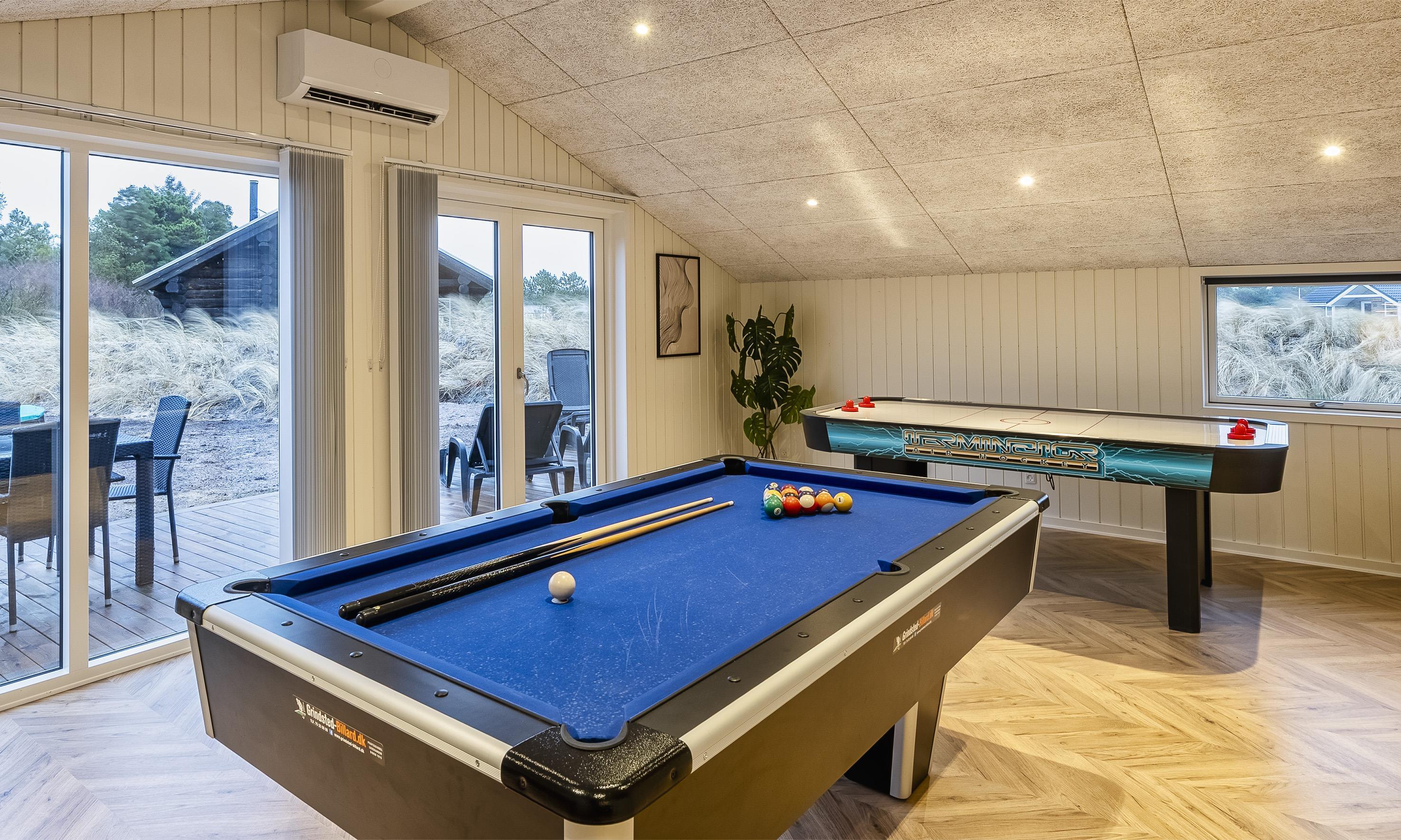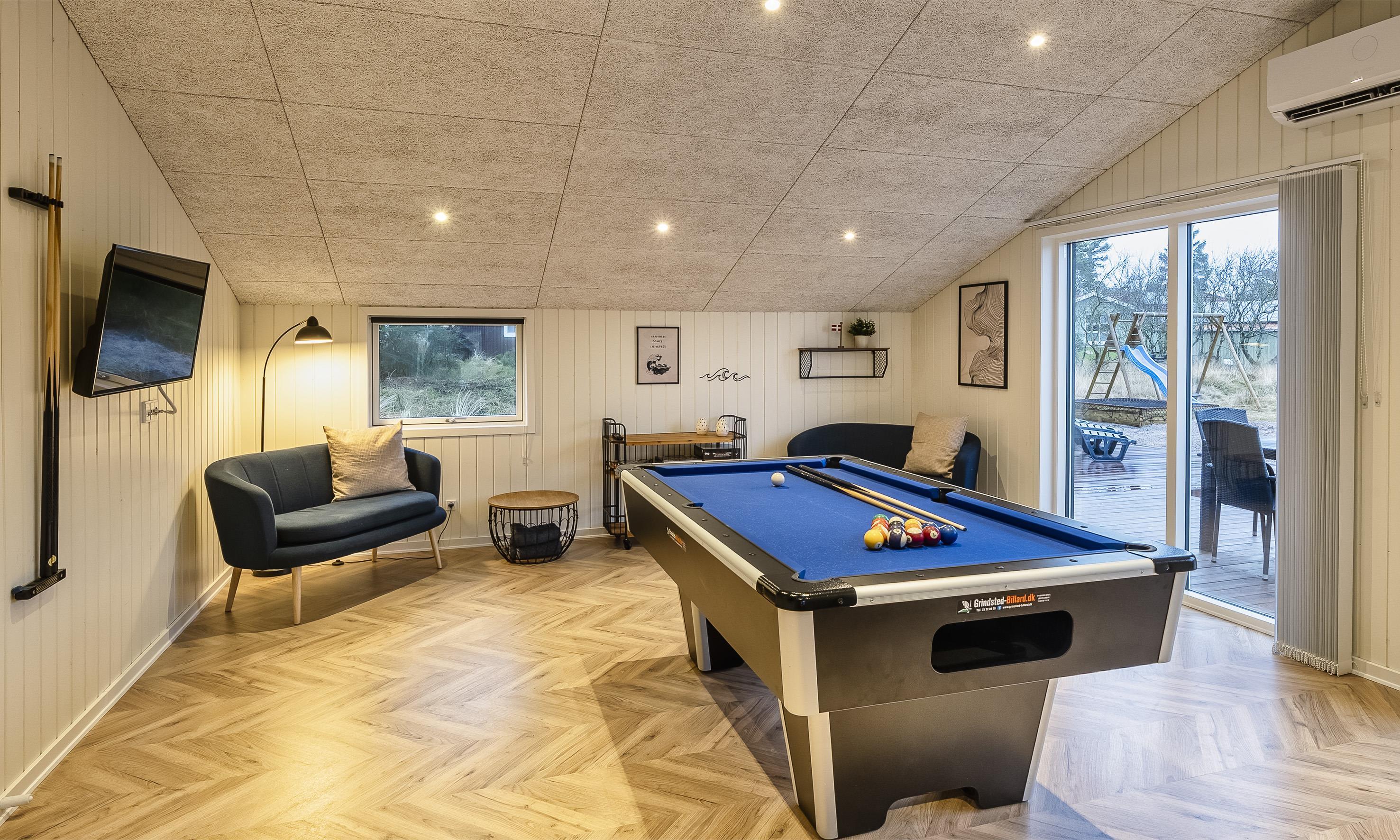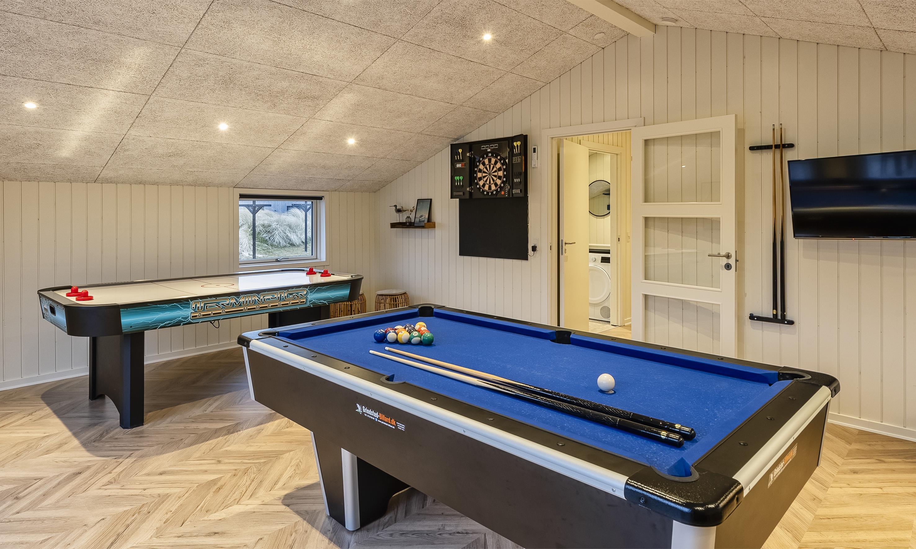 Der Aktivitätsraum lädt zu geselligen Spielen ein: Billard, Dart und Airhockey sorgen für Abwechslung. Außerdem gibt es hier einen zweiten Fernseher und eine gemütliche Sofaecke. Auch die zweite Wärmepumpe befindet sich in diesem Bereich.