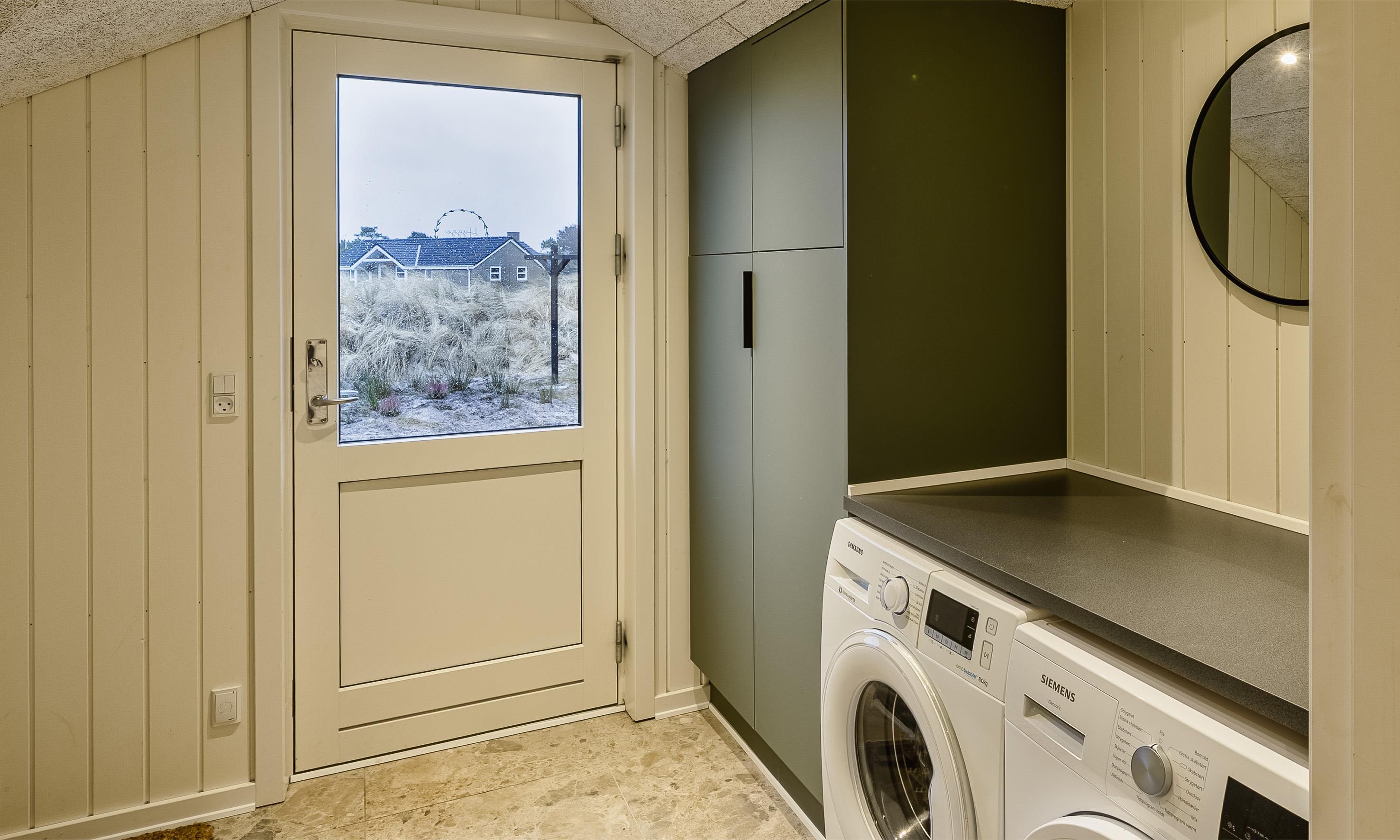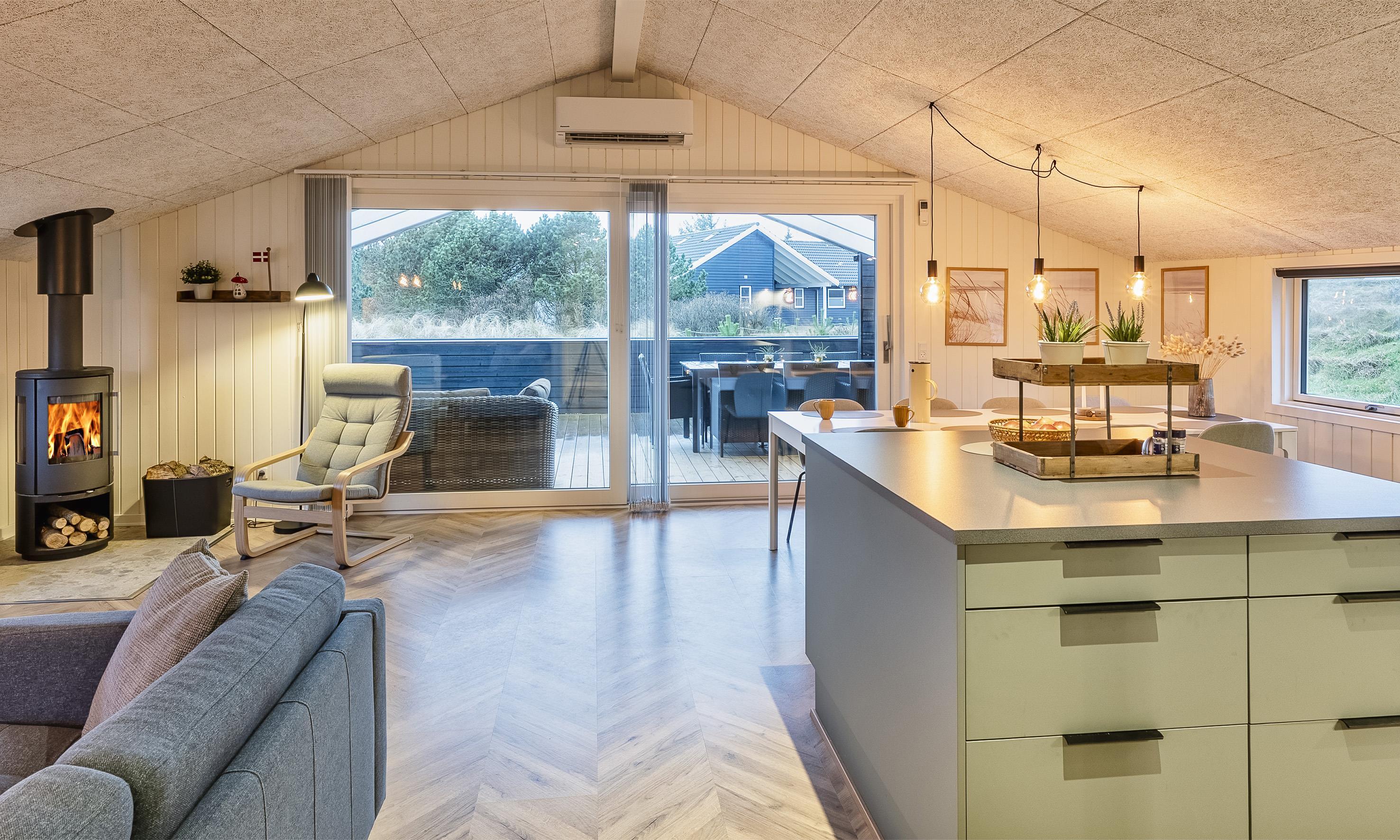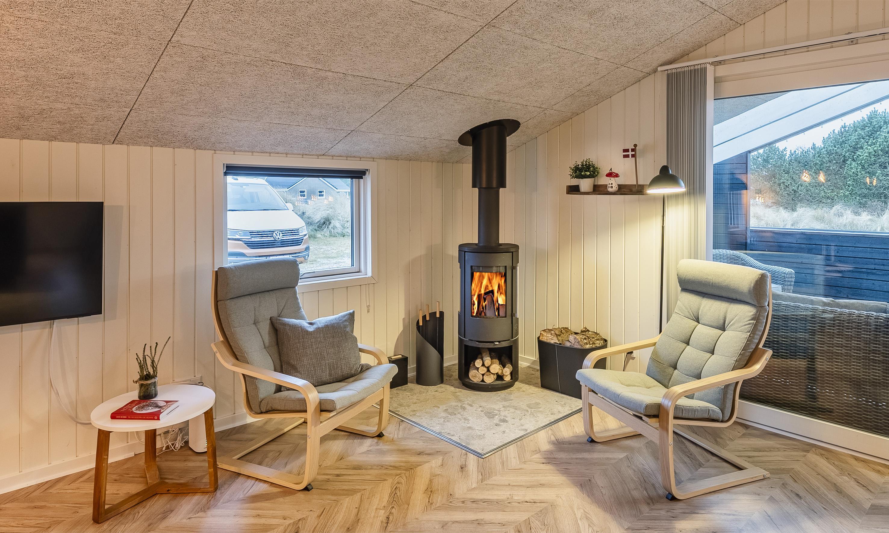Im Eingangsbereich des Hauses finden Sie ausreichend Platz für Garderobe und Schuhe sowie eine Waschmaschine und einen Trockner. Auf insgesamt 166 m² bietet das Ferienhaus viel Raum und Komfort. Der Wohnbereich ist mit dem Essbereich und der modernen Küche verbunden und schafft mit den großen Fenstern eine besonders freundliche und gemütliche Atmosphäre. Ein Kaminofen sorgt für zusätzliche Wärme und Behaglichkeit. Auch eine der beiden energiesparenden Wärmepumpen befindet sich im Wohnbereich und hilft dabei, Stromkosten zu reduzieren.