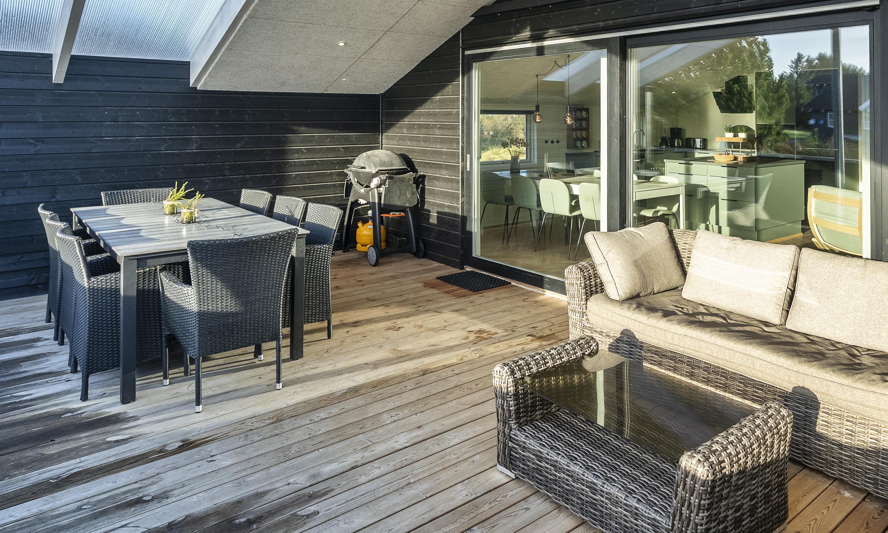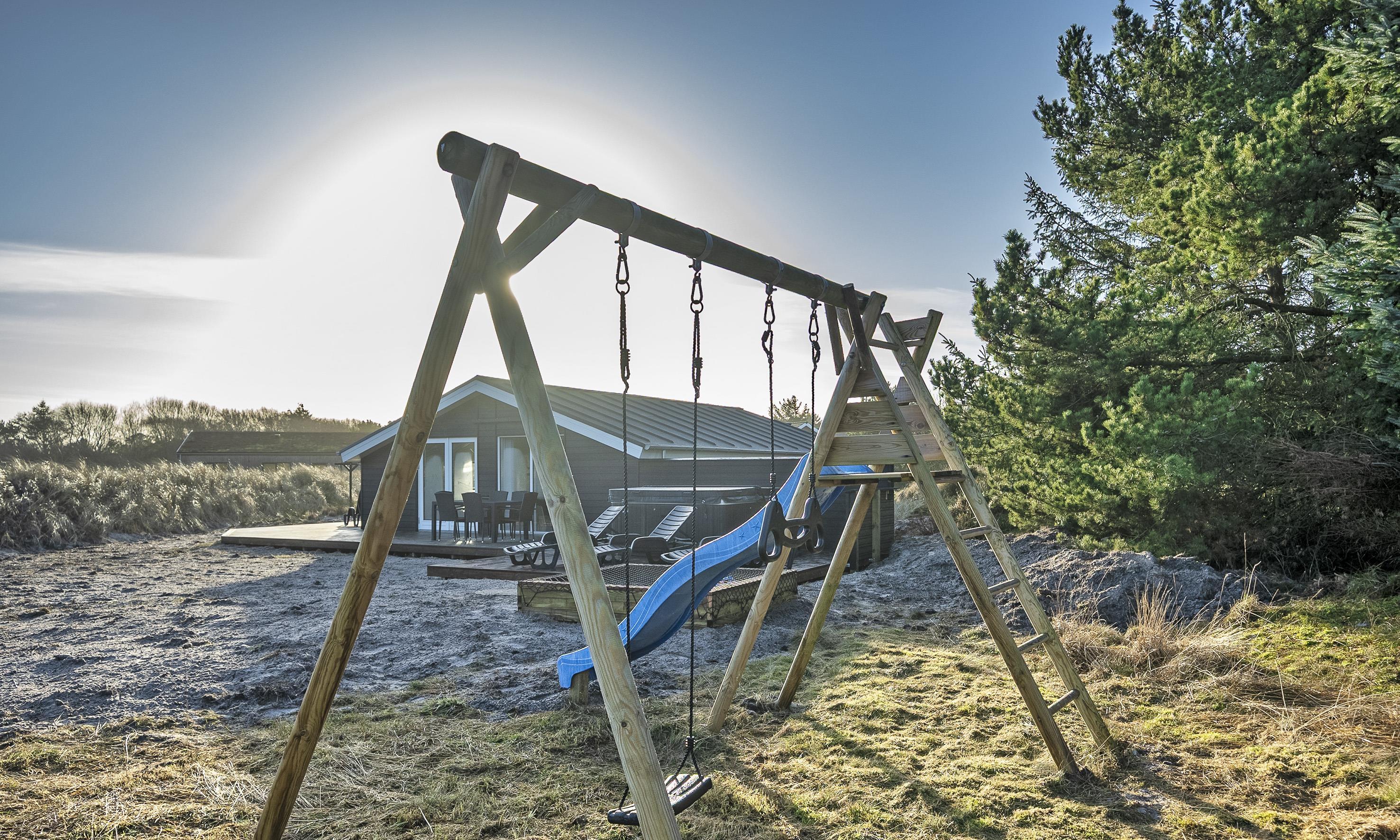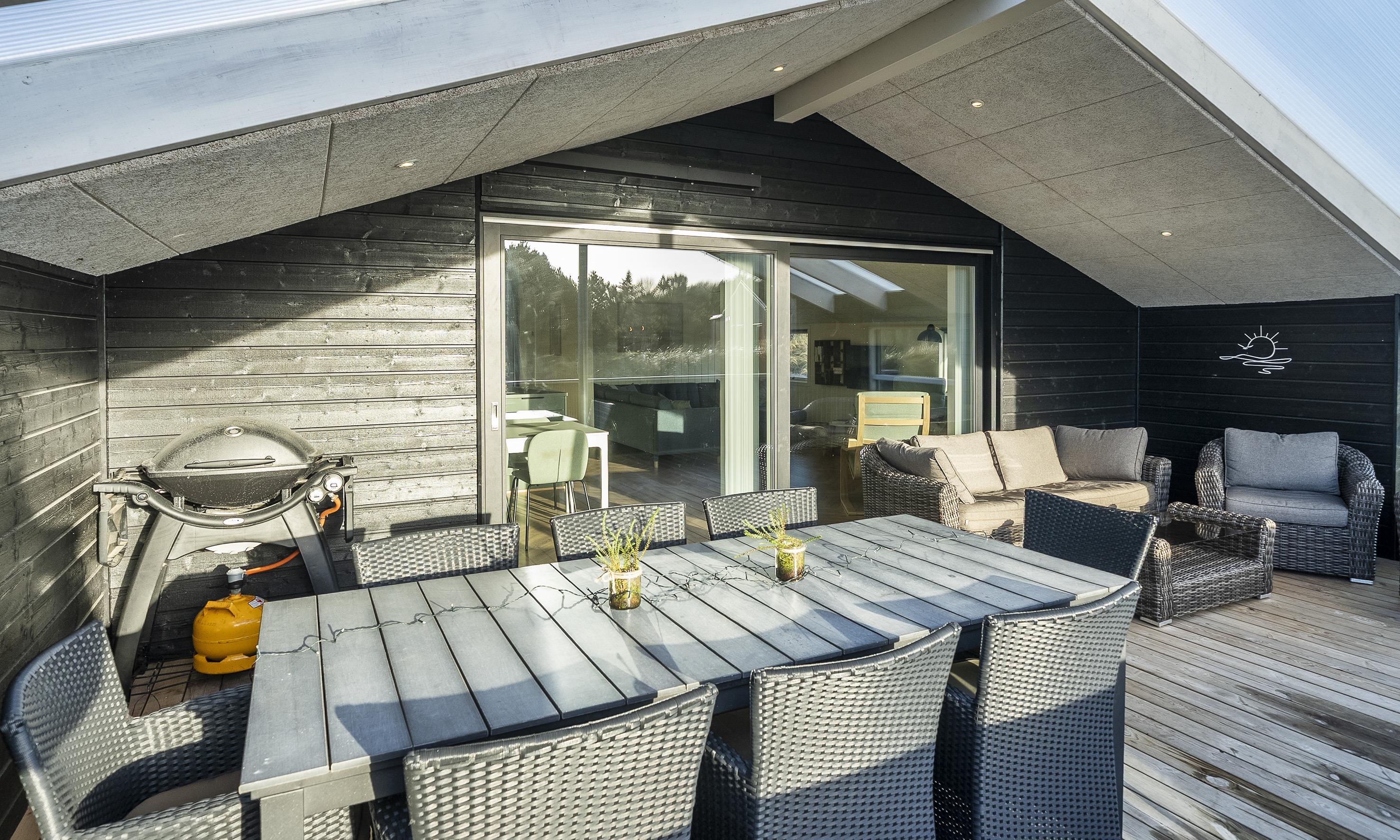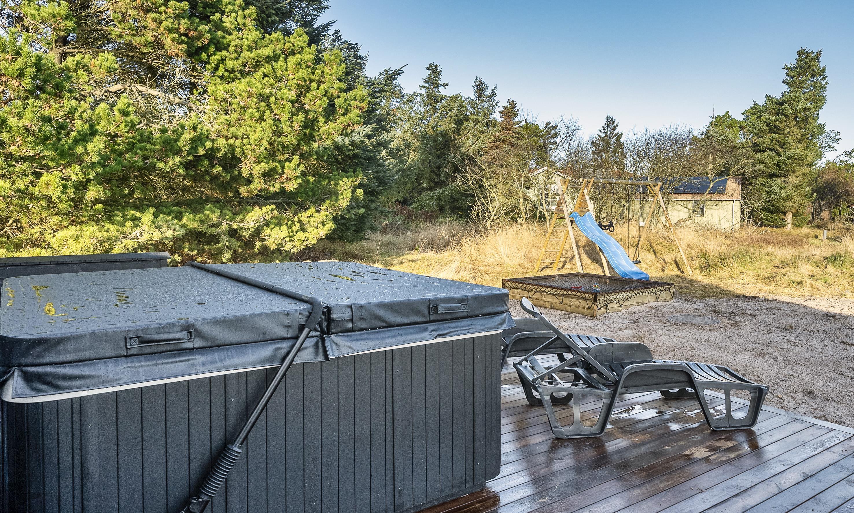 Auf der großzügigen Terrasse kann die Sonne bereits im frühen Frühjahr und bis weit in den Herbst hinein genossen werden. Auf einer der Terrassen steht ein Außenwhirlpool bereit. Ein Teil der südlich gelegenen Terrasse ist überdacht und lädt auch bei weniger gutem Wetter zum Verweilen ein. Ein Gasgrill steht ebenfalls zur Verfügung (Gas kann im örtlichen Supermarkt erworben werden). Für Kinder gibt es eine Schaukel mit Rutsche, einen Sandkasten und ein Trampolin – ideal zum Spielen und Austoben.