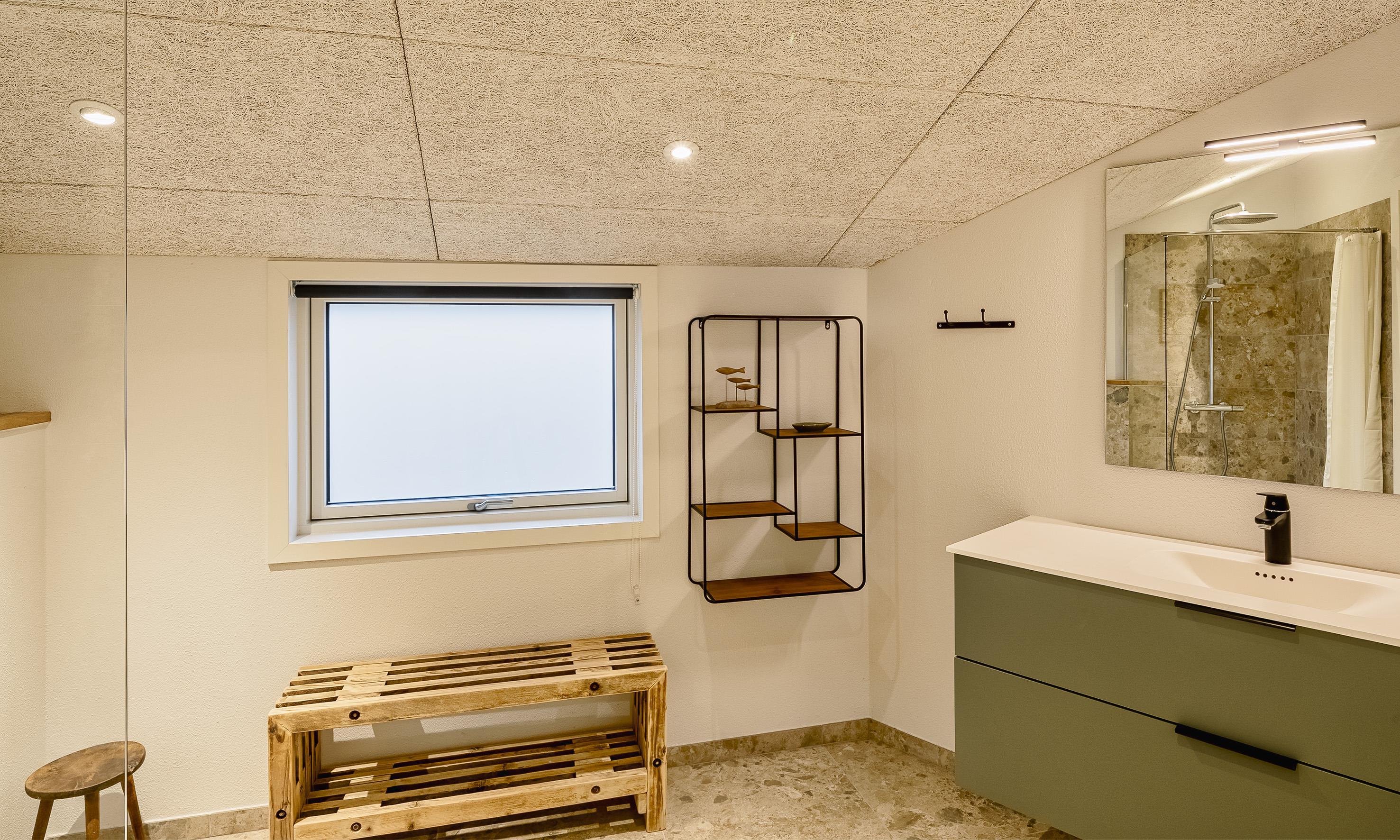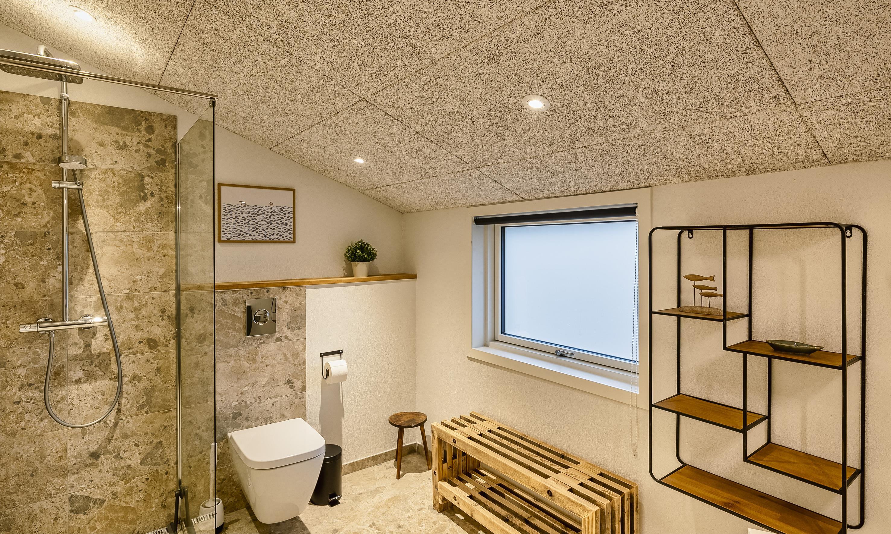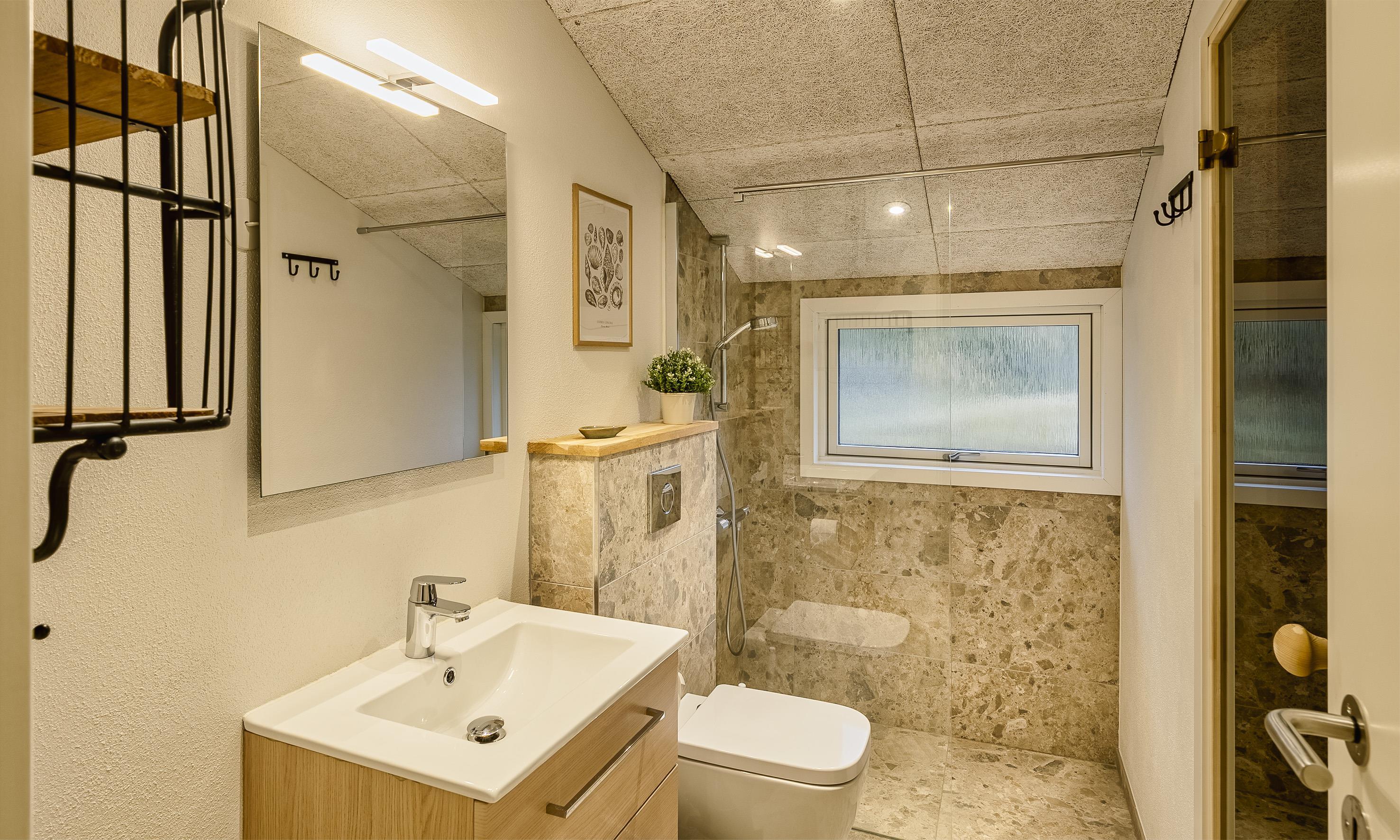 Das Haus verfügt über zwei moderne Badezimmer, beide mit Fußbodenheizung, WC, Handwaschbecken und Dusche. In einem der Badezimmer befindet sich zusätzlich eine Sauna. Insgesamt gibt es vier Schlafzimmer, alle mit Doppelbetten (180 cm).