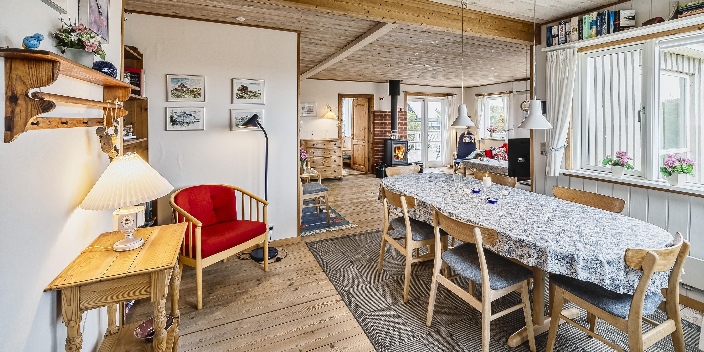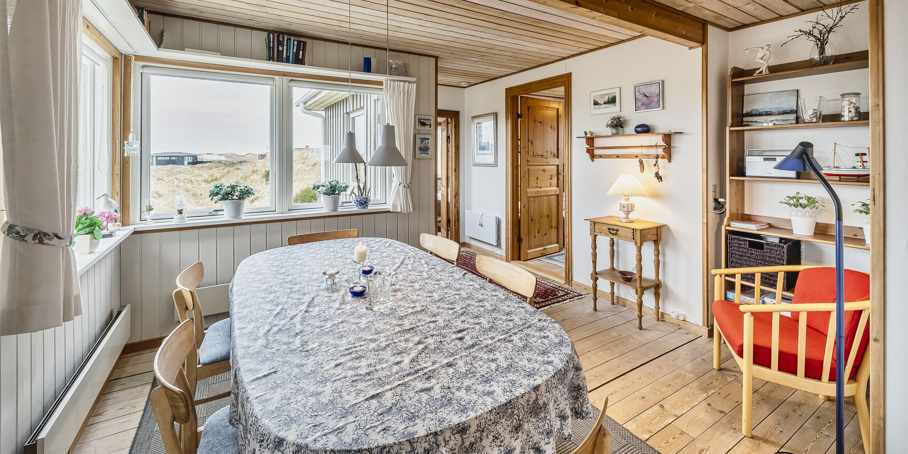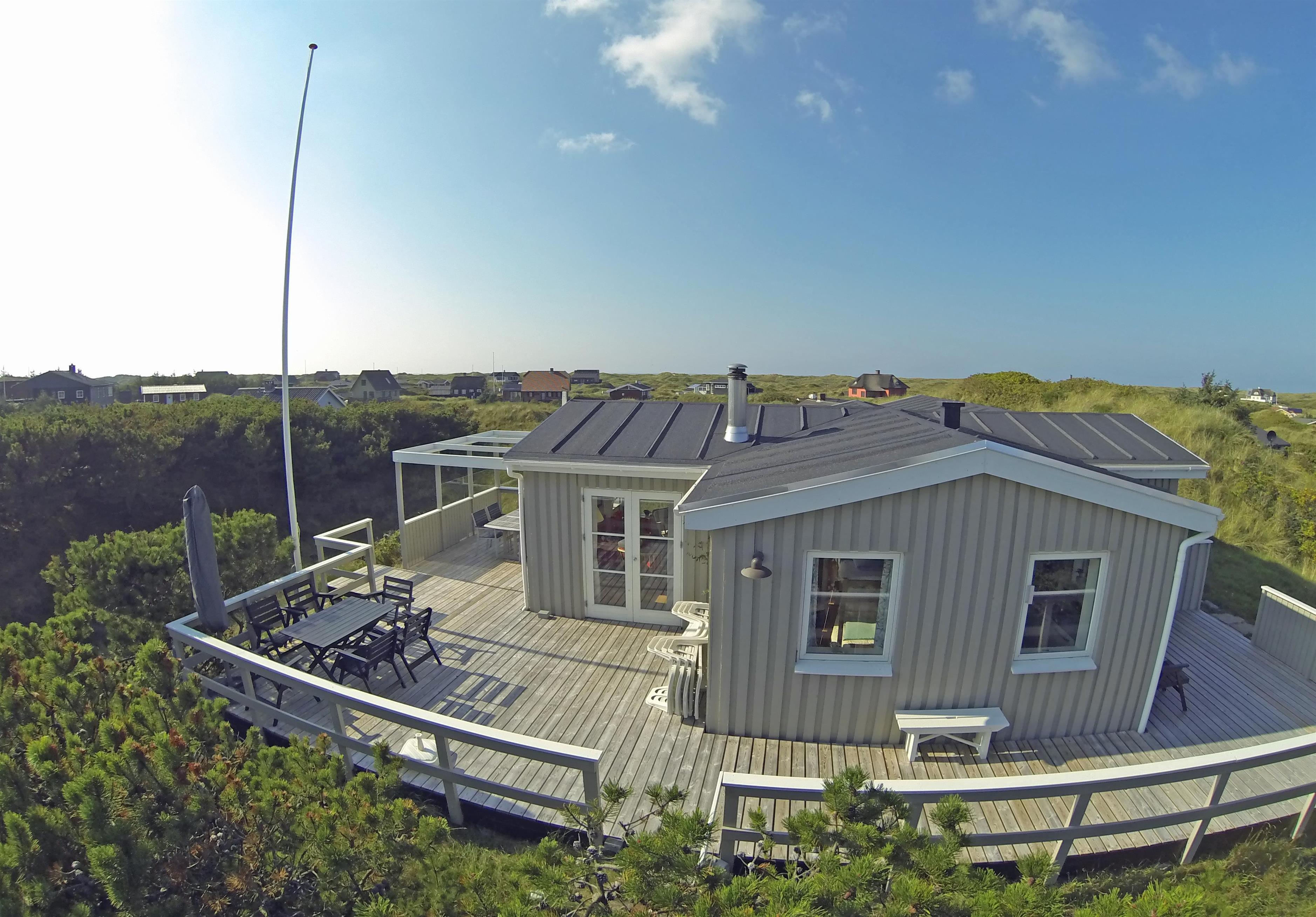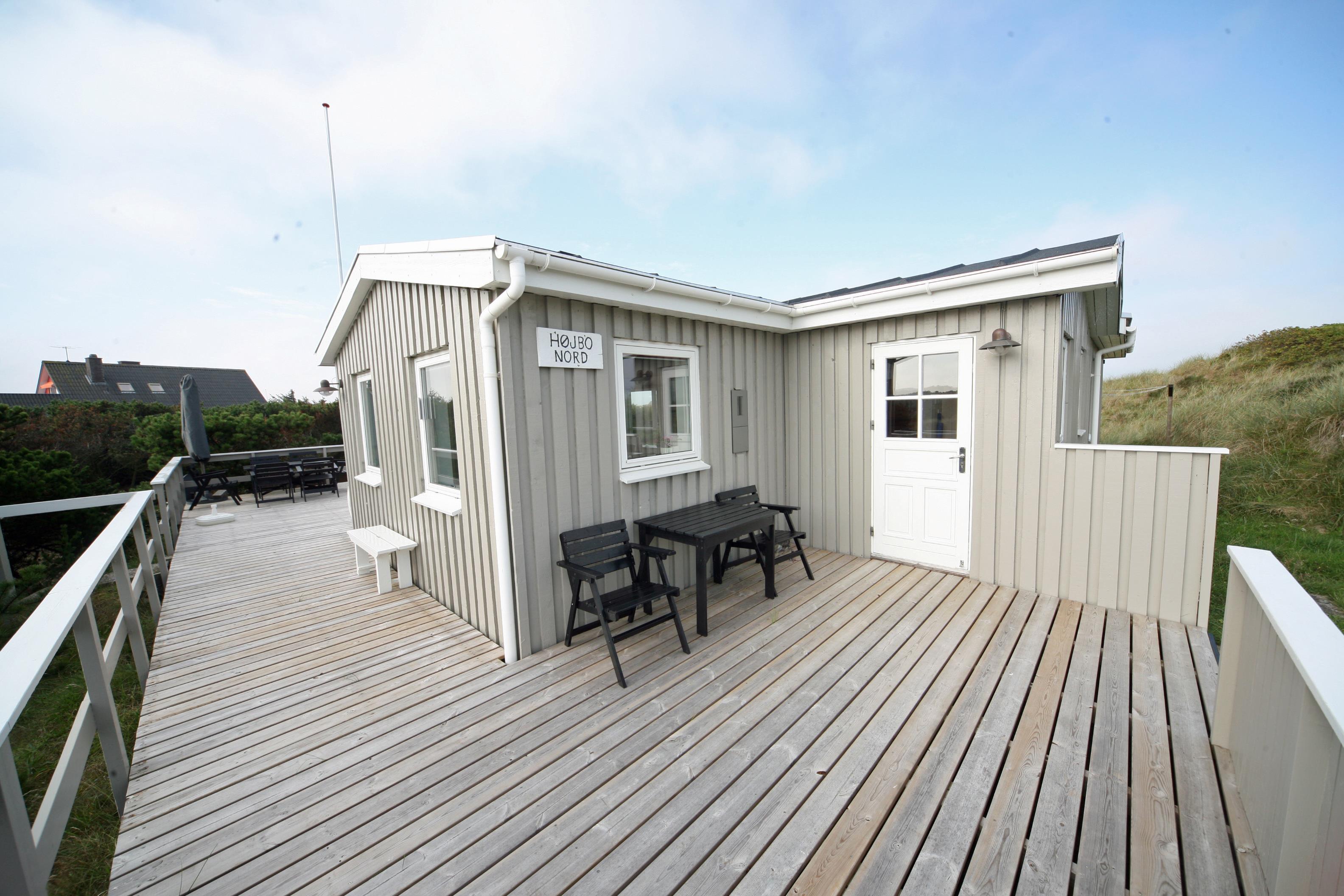 Helles und freundliches Ferienhaus mit Namen ”Højbo Nord” auf einer Düne in Mitten der Dünenlandshaft gelegen. Das Ferienhaus ist für 6 Personen ausgestattet und liegt ca. 400 Meter vom Strand entfernt. Der Wohn- und Essbereich, sowie die Schlafzimmer sind mit einem hübschen Holzfußboden verlegt. Dies bringt ein besonderes Wohlbefinden ins Haus. Im Wohnbereich ist der Kamin aufgestellt und ein Fernsehgerät. Das deutsche Fernsehprogramm empfangen Sie über eine Parabolantenne. Es gibt auch Chrome Cast. Der Essbereich ist in einer separaten Ecke untergebracht. Die Küche verfügt über einen Herd mit Cerankochfeld, einem Backofen in Arbeitshöhe, einer Geschirrspülmaschine, einer Mikrowelle und einer Kühl- und Gefrierkombination. Das Badezimmer ist gefliest und verfügt über ein WC, ein Handwaschbecken und eine Dusche. Die Waschmaschine ist hier im Badezimmer auch untergebracht. Es stehen den Gästen drei Schlafzimmer zur Verfügung: DB + 2B + 2B. Ein Schlafzimmer verfügt über ein Doppelbett, ein Schlafzimmer über zwei Einzelbetten und das Dritte Schlafzimmer verfügt über Etagenbetten. In dem separaten Eingangsbereich ist reichlich Platz für Jacken und Schuhe. Der Terrassenbereich ist hübsch angelegt mit einer Holzterrasse und gibt einen tollen Blick auf die Dünen und das Ferienhausgebiet. Das Ferienhaus verfügt über einen Internetanschluss (W-Lan). Es sind keine Haustiere erlaubt. Rauchen ist nicht erlaubt. Es befindet sich eine Warmepumpe im Ferienhaus. Mit dieser Warmepumpe haben sie die Möglichkeit die Stromkosten zu senken, denn die Warmepumpe ist energiesparend. Das Ferienhaus ist 1934 erbaut worden und in 1996 renoviert.