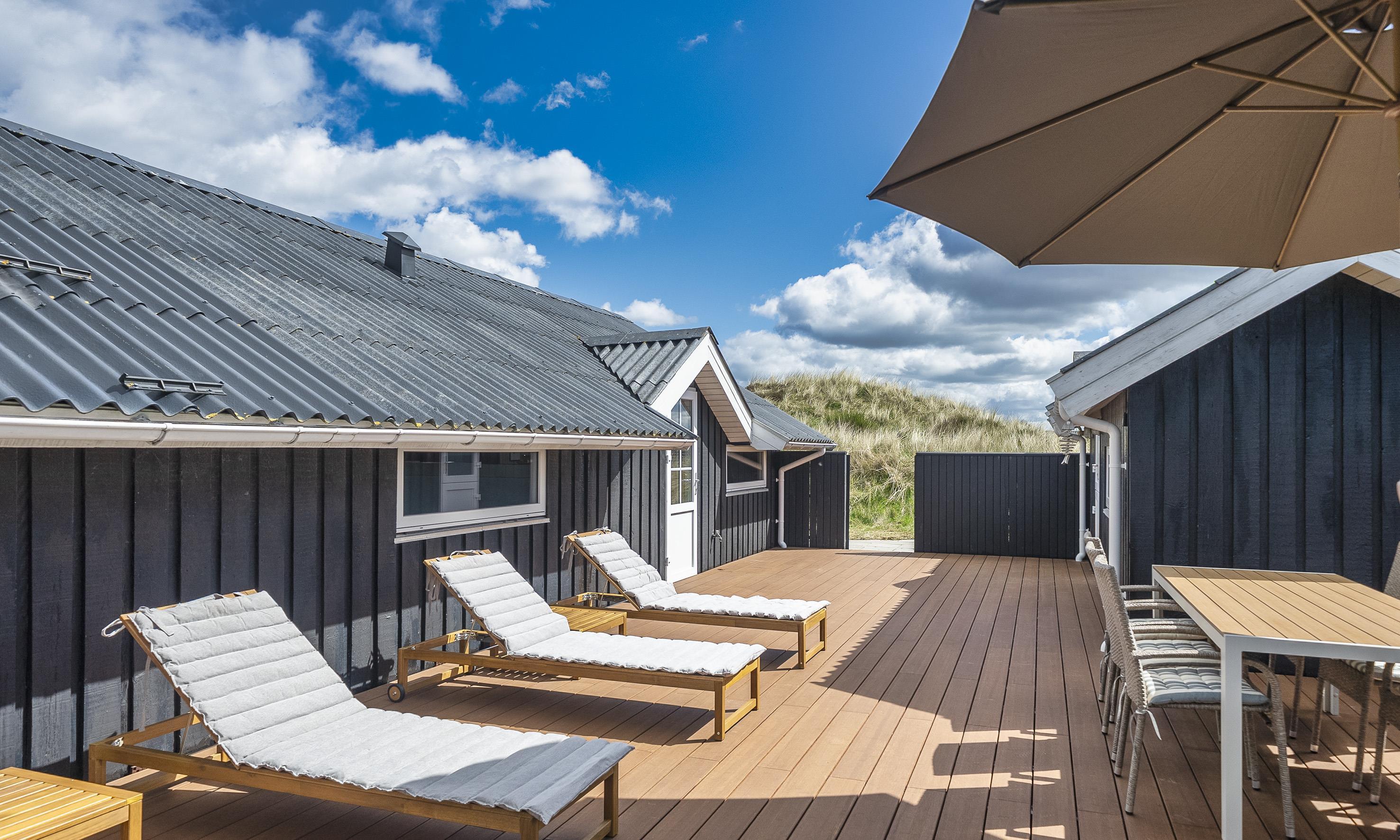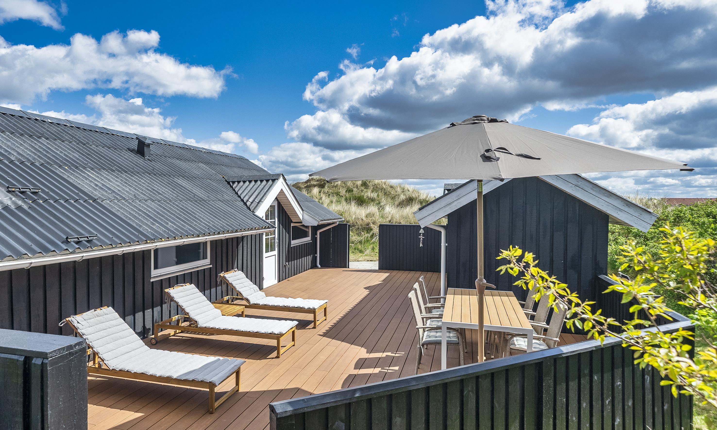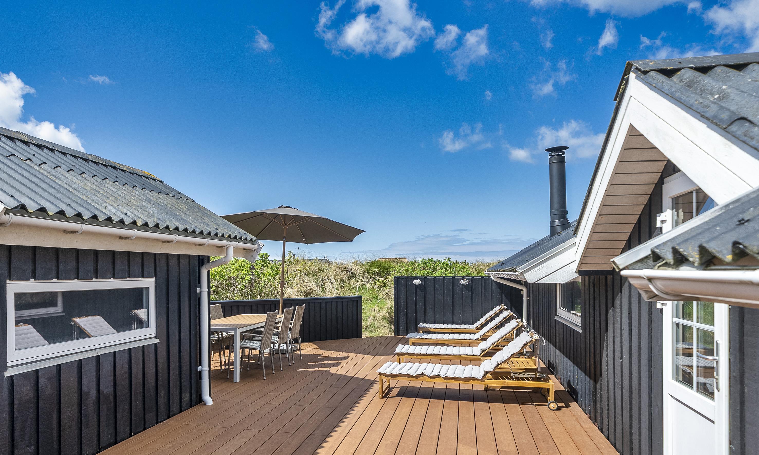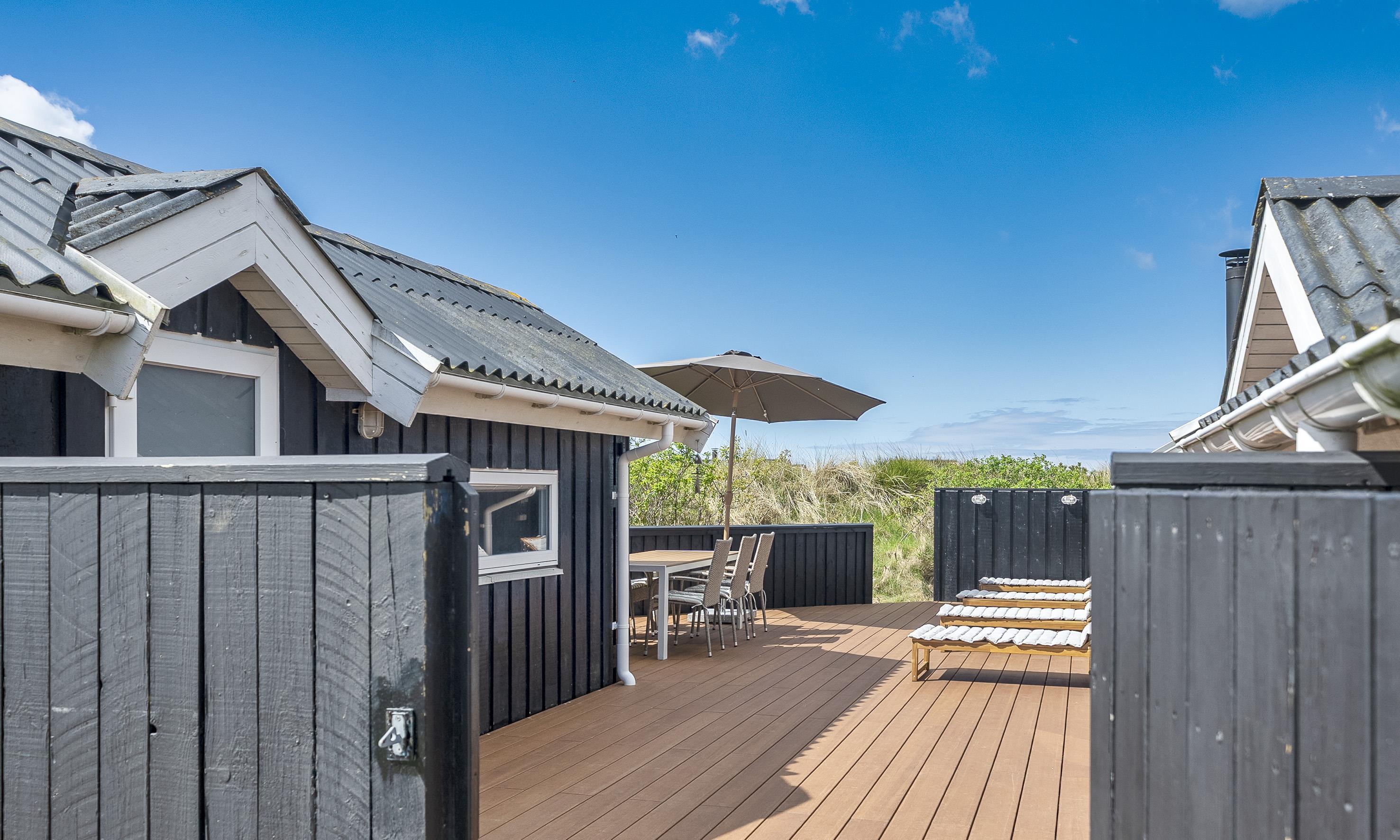 Von Dünen umgebenes kleines Ferienhaus für 5 Personen ausgestattet und auf einem relativ schönen Grundstück gelegen. Der Strand liegt nur 400 Meter vom Haus entfernt. Das Wohnzimmer ist nett eingerichtet und verfügt über einen Kamin. Das deutsche Fernsehprogramm empfangen Sie über eine Parabolantenne. Der Küchenbereich ist mit einem Herd mit Kochplatten, einem Backofen, einer Mikrowelle, einer Geschirrspülmaschine und einer Kühl- und Gefrierkombination ausgestattet. Von der Küche aus, haben Sie einen Ausgang zur Terrasse. Hier befindet sich ein kleiner Schuppen,wobei dort die Waschmaschine und der Trockner untergebracht sind. Das Badezimmer ist einfach gehalten und hat ein WC, ein Handwaschbecken und eine Dusche. Es gibt drei Schlafzimmer im Ferienhaus: DB + B + B. Neue Betten in 2024. Das Ferienhaus verfügt über einen Internetanschluss (W-Lan). Der Terrassenbereich am Ferienhaus ist sehr geschützt. Die Klimaanlage ist nicht für die Gäste zum Benutzen gedacht. Es sind keine Haustiere erlaubt. Das Rauchen im Ferienhaus ist nicht erlaubt. Das Ferienhaus wurde 1978 erbaut und in 2010 renoviert.
