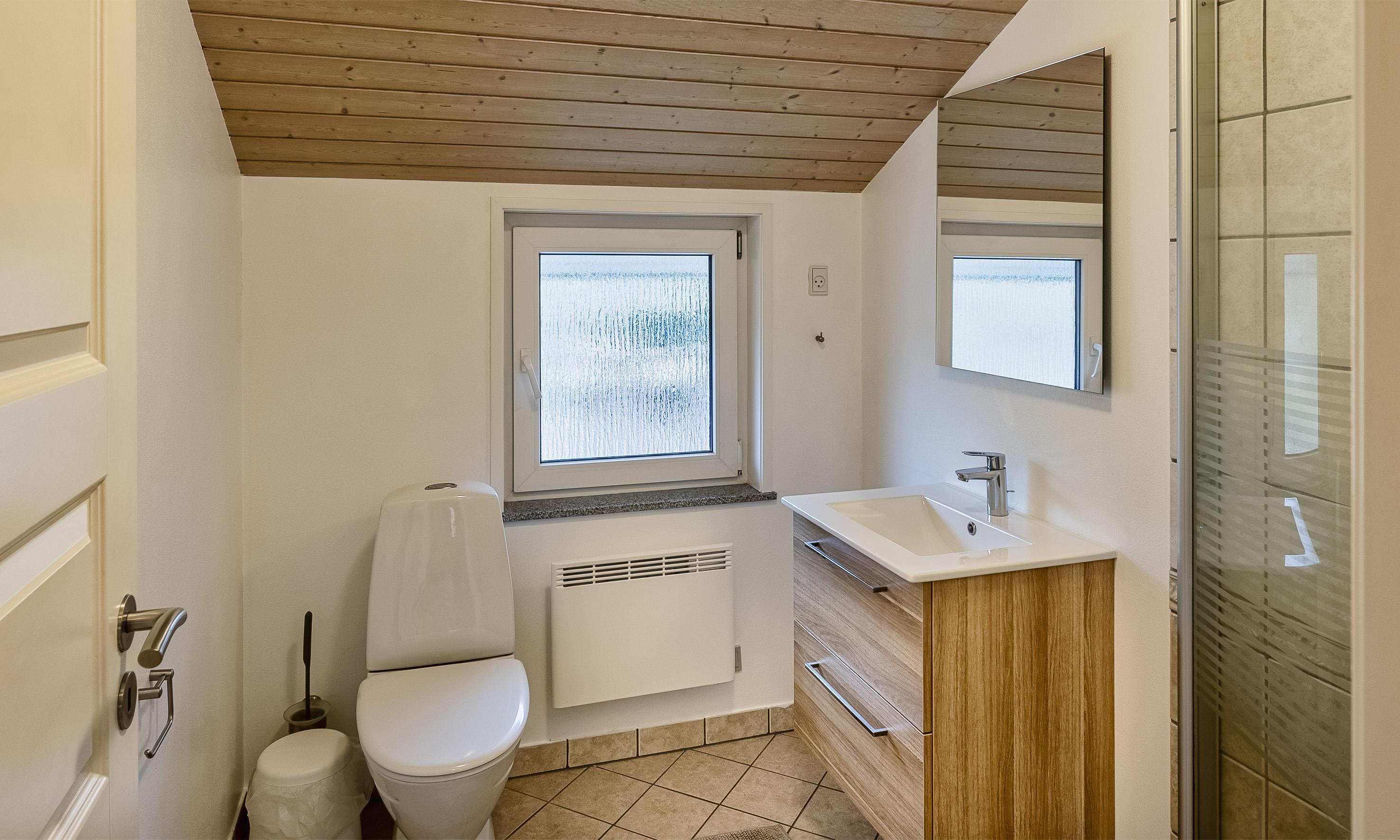 Badezimmer mit Toilette, Dusche und Waschbecken