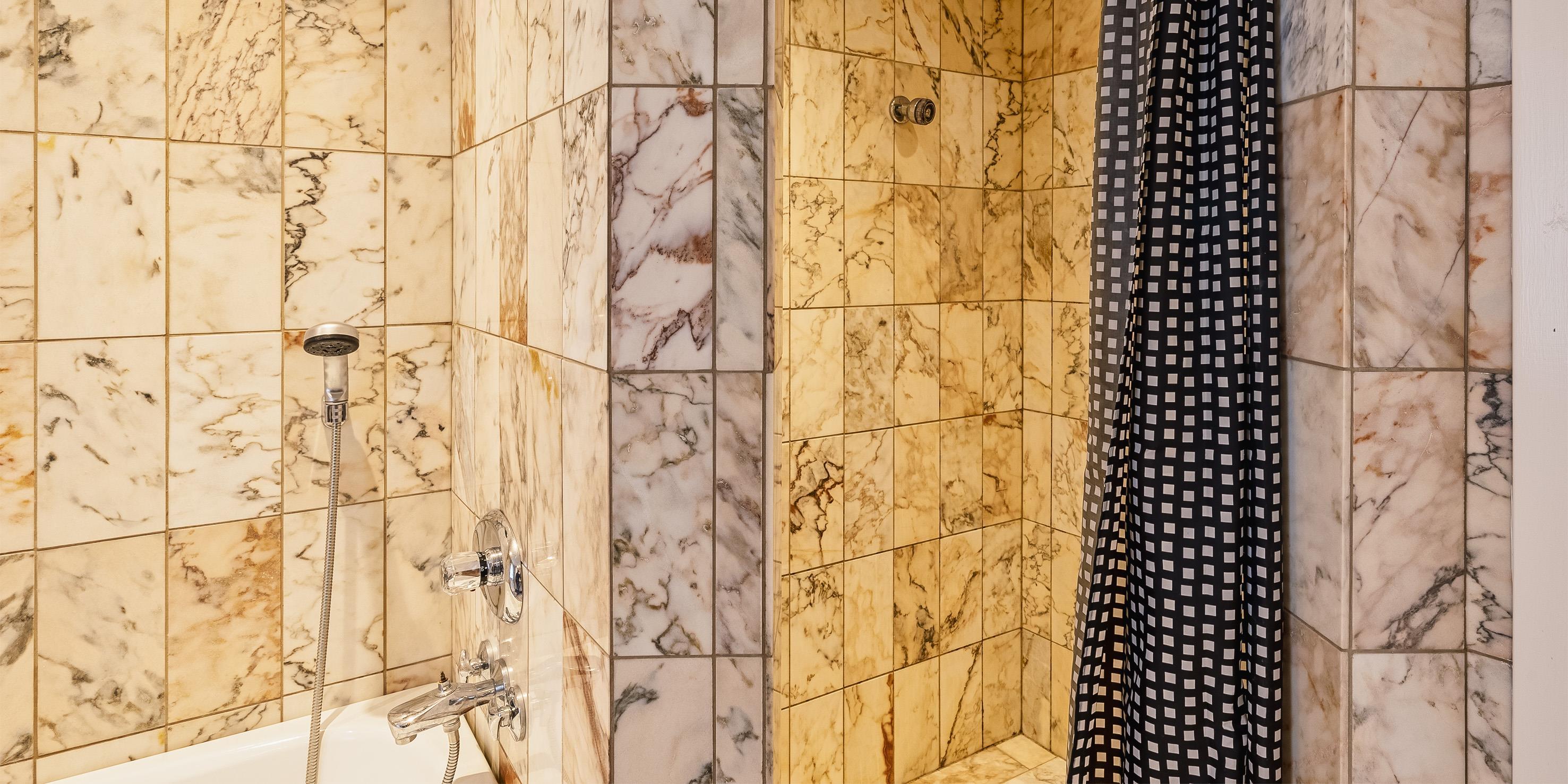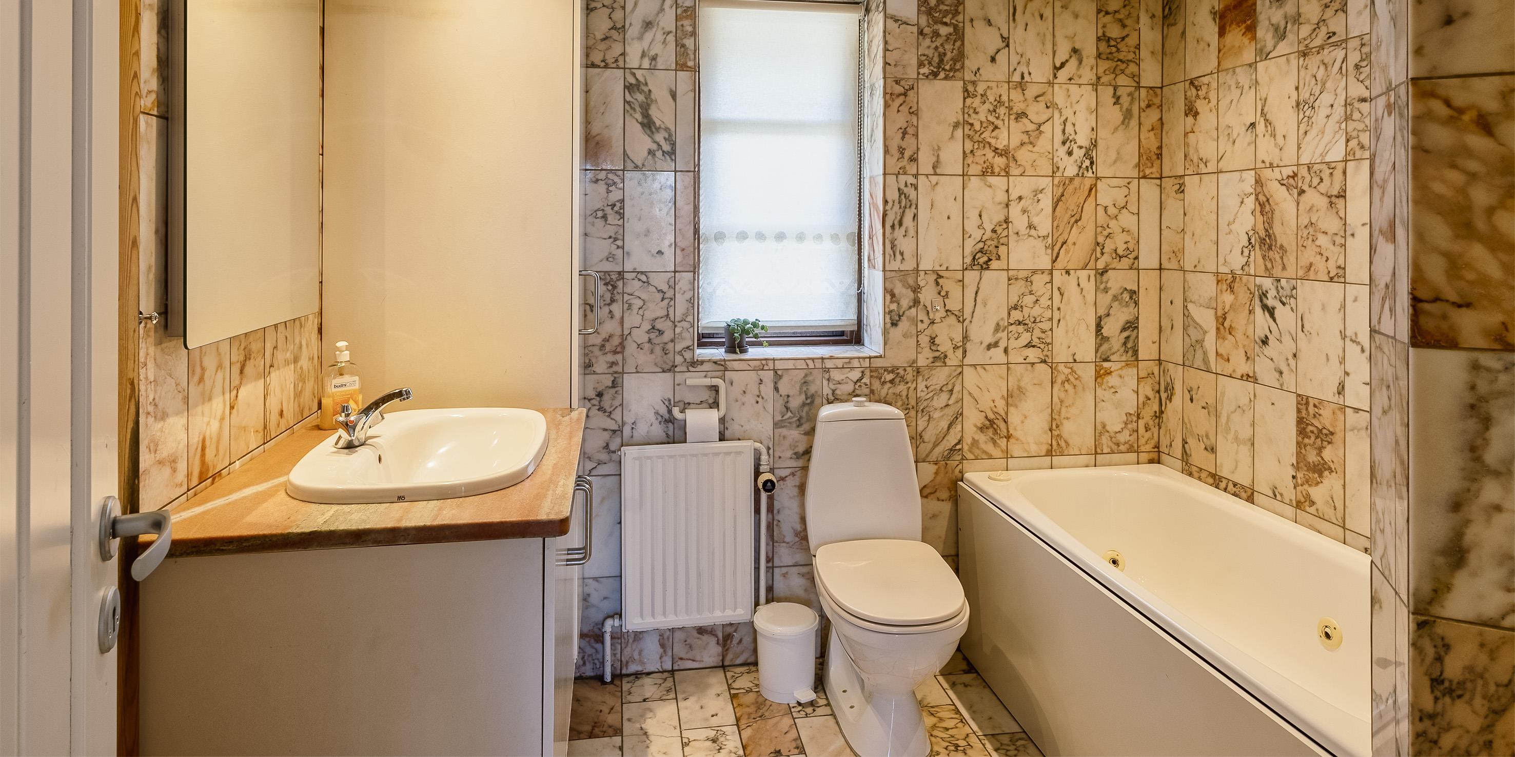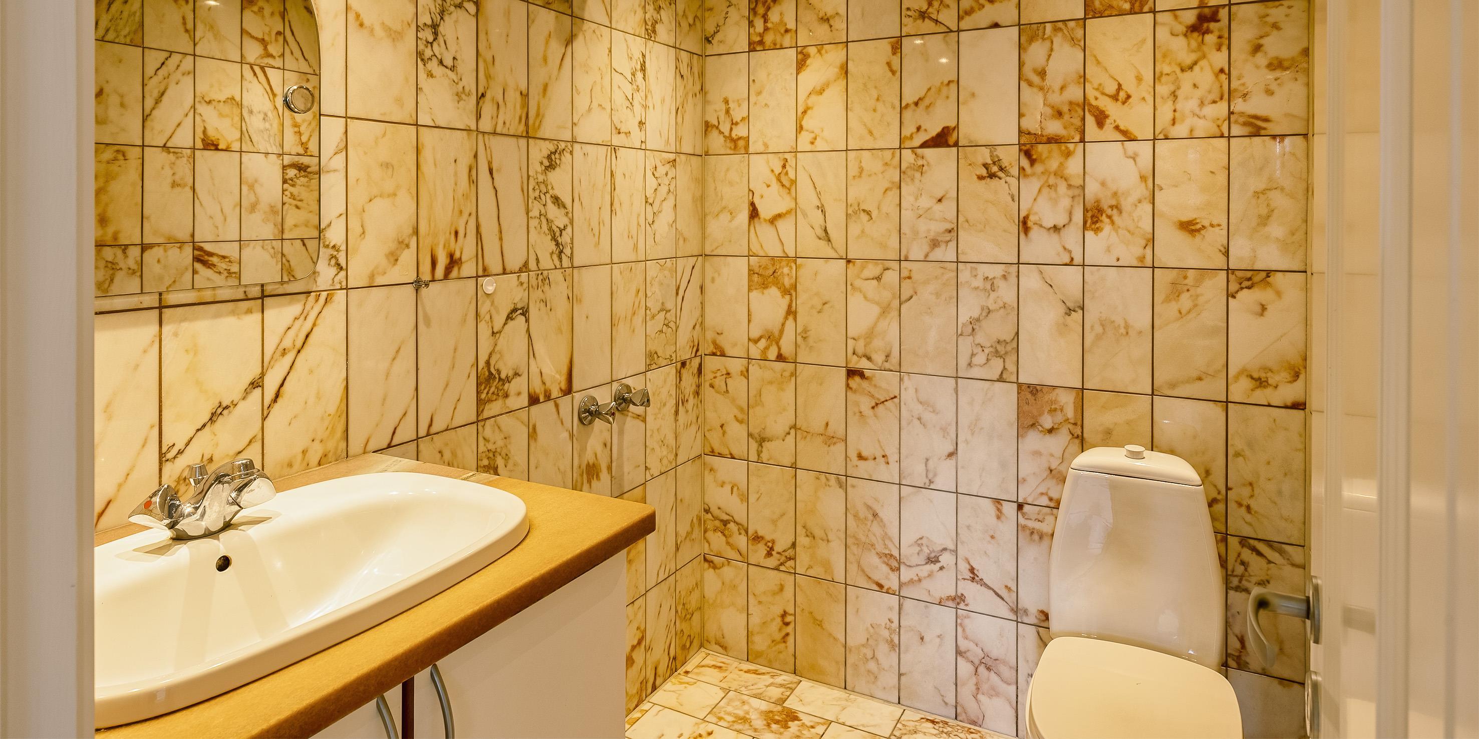 Badezimmer mit Toilette, Dusche und Waschbecken