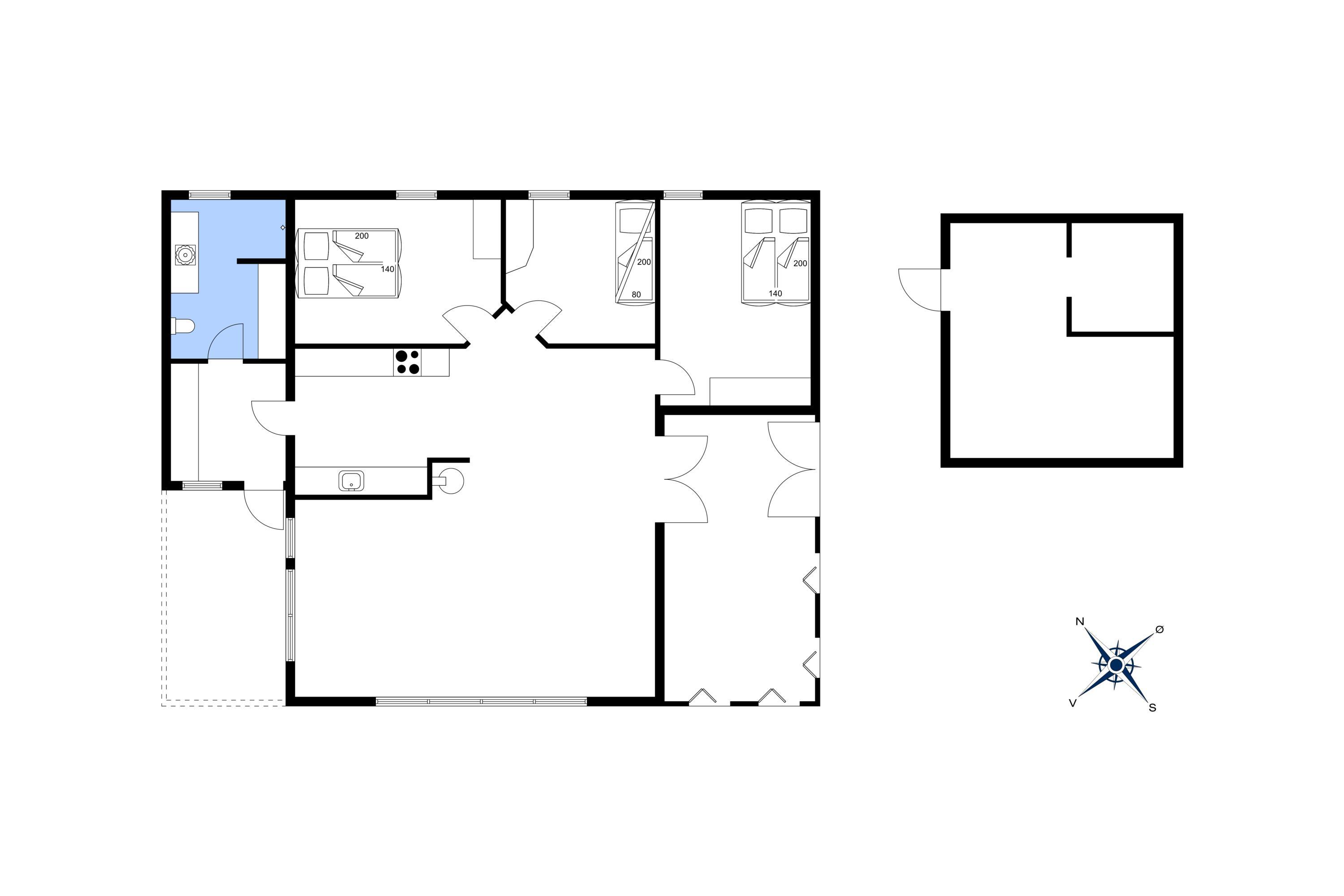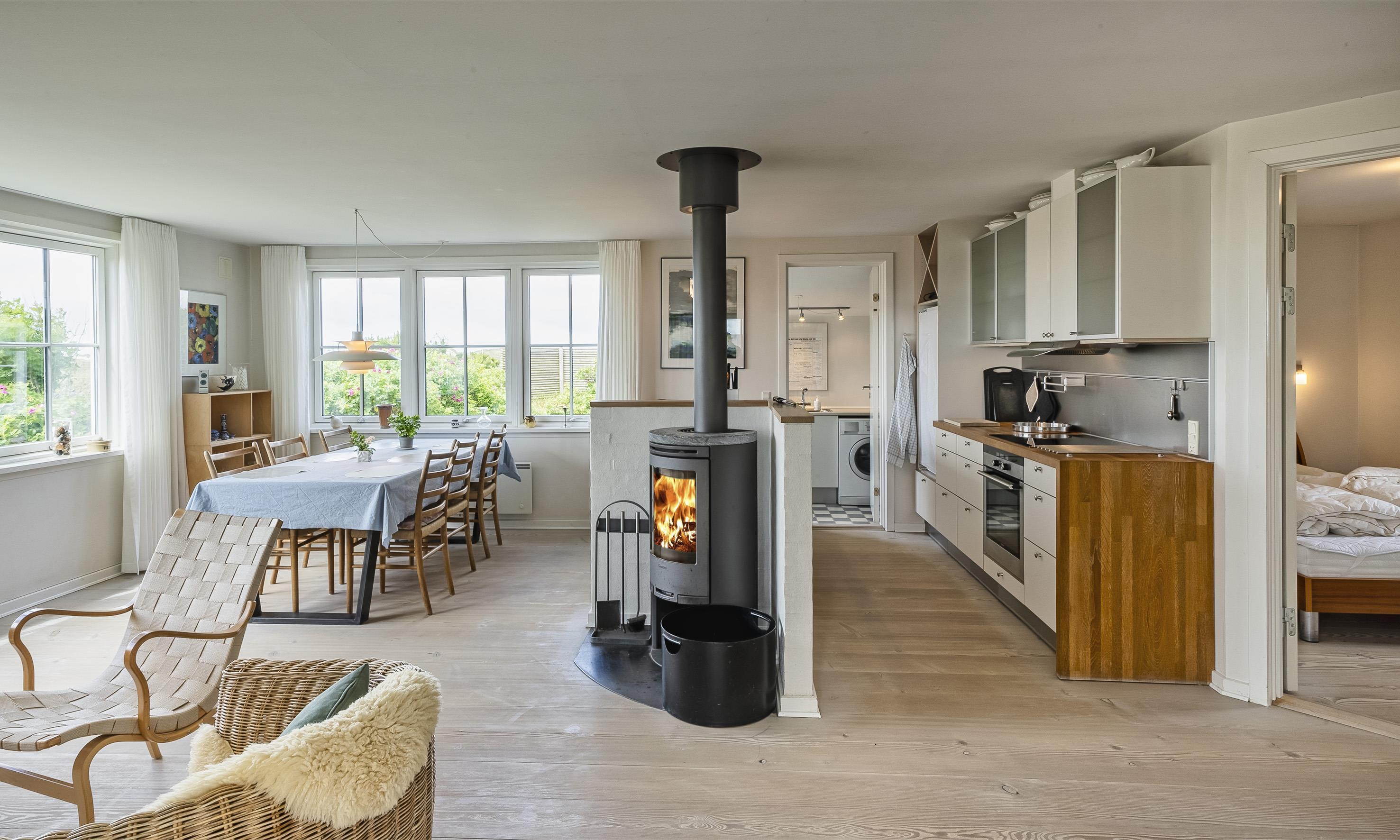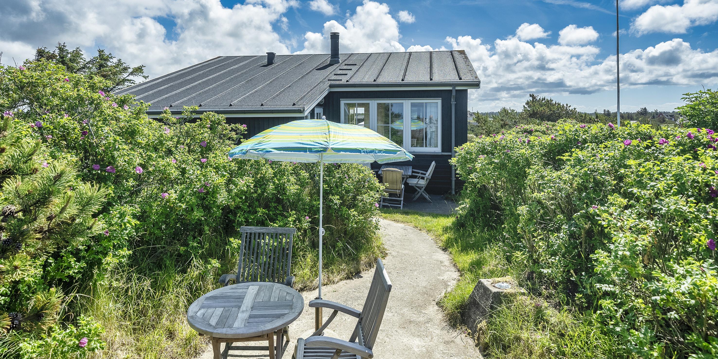 Auf einer Düne liegt dieses kleine dänisch eingerichtete Ferienhaus für 6 Personen und nur 150 Meter vom Strand entfernt. Das Ferienhaus liegt völlig ungestört und hier haben Sie vom Wohnzimmer aus einen wundervollen Meeresblick. Der Wintergarten, der noch mit schönen Holzdielen belegt ist, hat grosse Schiebetüren, wobei eine schöne warme Brise in lauer Sommernacht durch das Haus fluten kann. Die Wohnkücke ist mit dem grosszügige Wohn- und Esszimmer integriert. Vom Wohnbereich aus, kann man das Feuer im Kamin lodern sehen. Dies bringt eine wohlige Wärme ins Ferienhaus. Es befindet sich eine Warmepumpe im Ferienhaus. Mit dieser Warmepumpe haben sie die Möglichkeit die Stromkosten zu senken, denn die Warmepumpe ist energiesparend. Deutsche Fernsehprogramme werden über eine Parabol-Antenne empfangen sowie auch Chrome cash. Da ist ein Grammofon. Das Fernsehgerät hat einen HDMI-Empfang für einen Computer und Drucker. Die offene Wohnküche verfügt über einen Herd mit Cerankochfeld, einem Backofen, einen Geschirrspüler und einem Kühlschrank. Ein kleiner zusätzlicher Gefrierschrank befindet sich im Schuppen. 3 Schlafzimmer: DB + DB + 2B. Hinter dem Essbereich gelangen Sie durch eine Tür zum Hauswirtschaftsraum und dem Ausgang zur Terrasse. Die Waschmaschine befindet sich hier im Hauswirtschaftsraum. Von hier gelangen Sie dann auch in das Badezimmer, mit Dusche, WC, und einem Handwaschbecken. Hinter dem Haus befindet sich dann die Terrasse und eine gemütliche Sitzgruppe zwischen den Hagebutten-Sträuchern. Über einen weiteren Auskuck können Sie das Meer erblicken und auch über einen Teil des Ferienhausgebietes. Desweiteren befindet sich ein Gästehaus auf dem Grundstück das mit einer Sauna mit ca. 17 qm, dem Trockner und als Abstellraum gedacht ist. Zusätzliche befindet sich dort eine aussen gelegene Dusche (nur mit kaltes Wasser). Rauchen ist nicht erlaubt. Internetanschluss (W-Lan) auch verfügbar. Es sind max. 2 Haustiere erlaubt.Es stehen den Gästen 2 Fahrräder am Ferienhaus zur Verfügung, wobei wir keine Haftung übernehmen bezüglich der Benutzung und Brauchbarkeit. Ferienhaus ist 2007 erbaut worden.