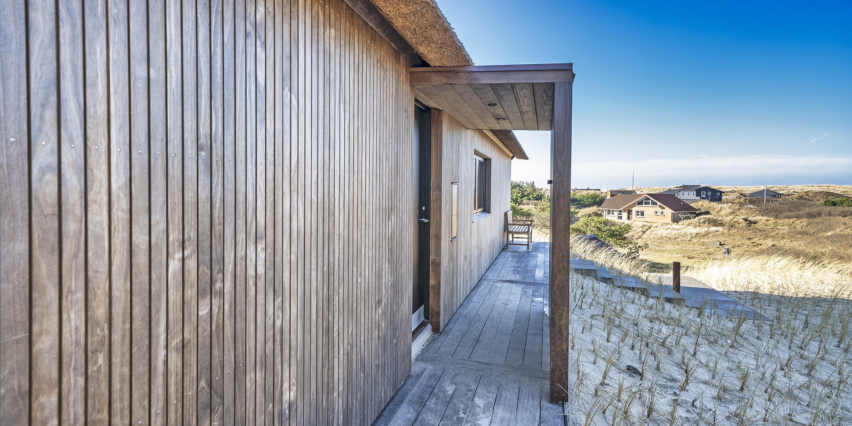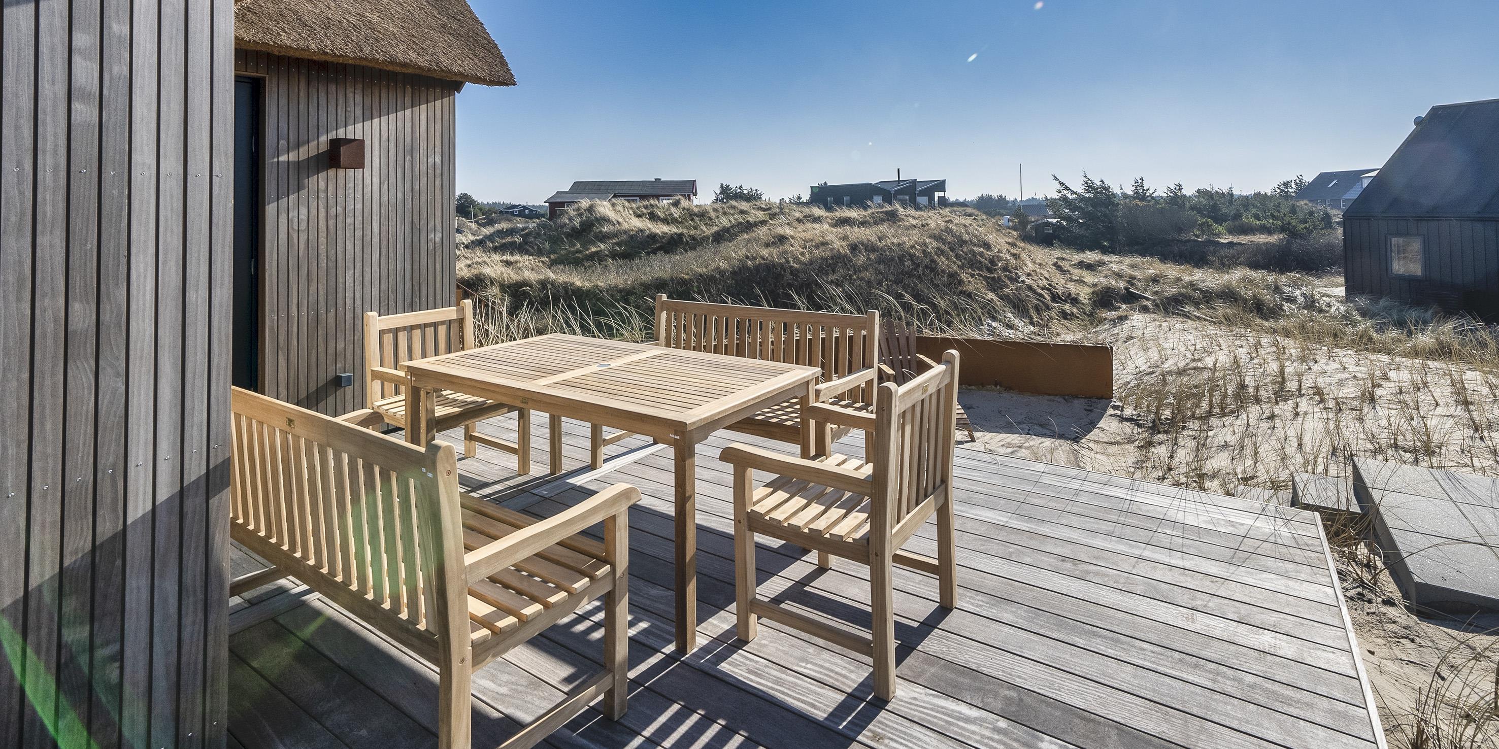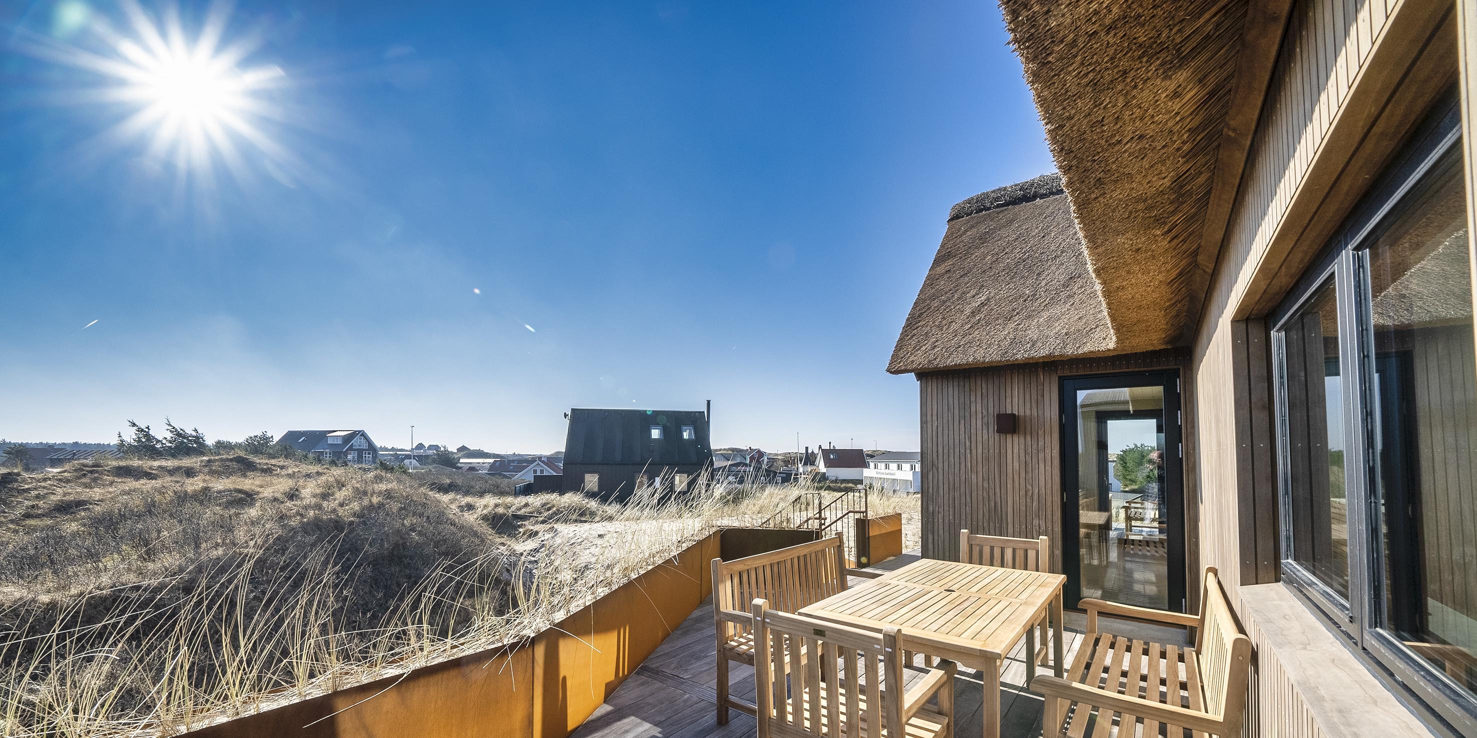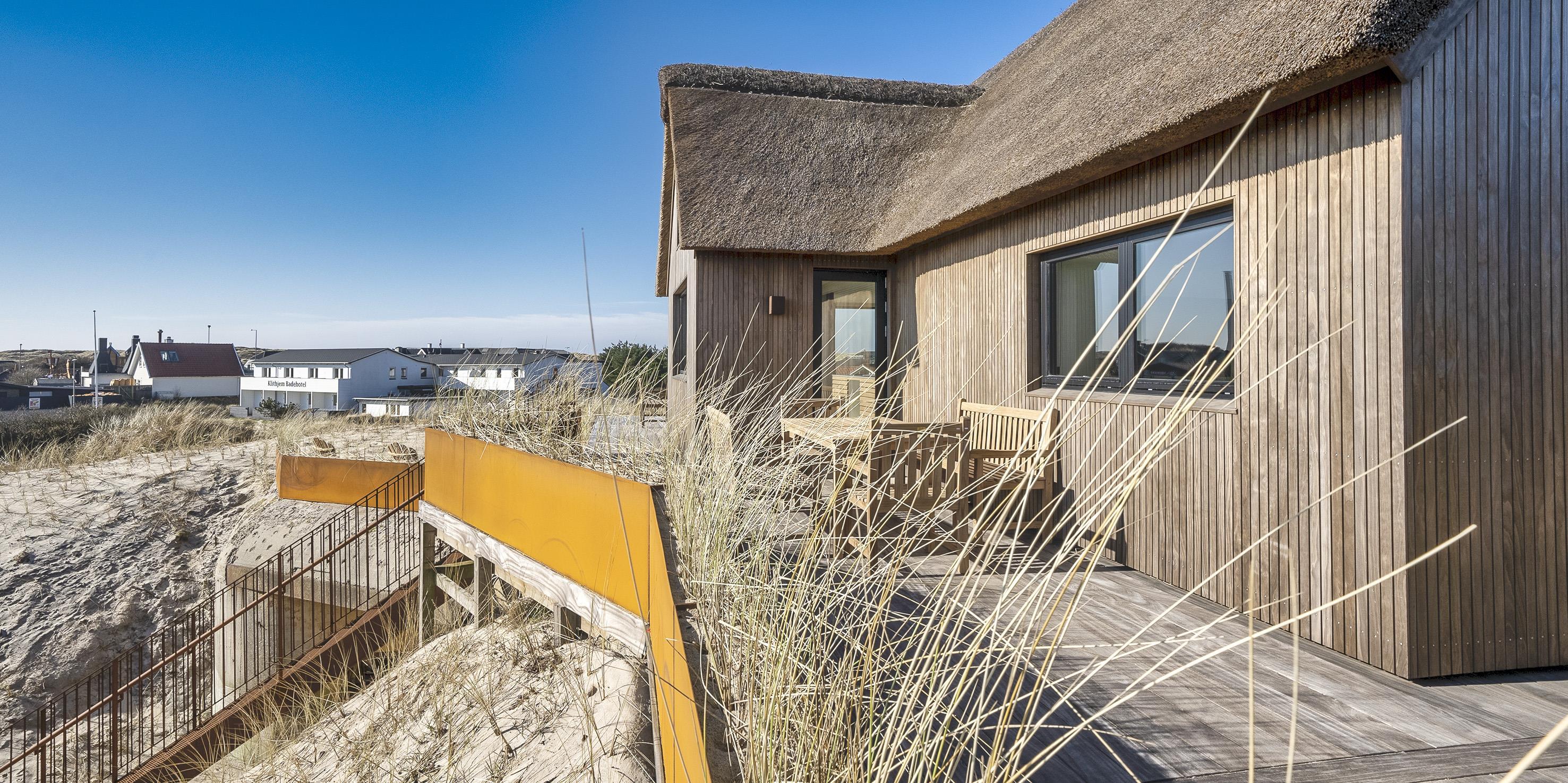 Die Außenanlagen bieten wunderschöne Sonnenuntergänge, die von der großen umlaufenden Holzterrasse aus genossen werden können. Das Ferienhaus liegt auf einem hohen Dünengrundstück, ca. 200 Meter vom Strand entfernt und in kurzer Entfernung zu Einkaufsmöglichkeiten und Restaurants.