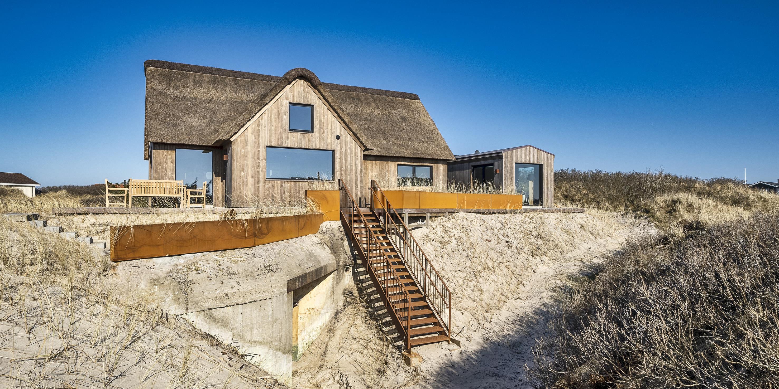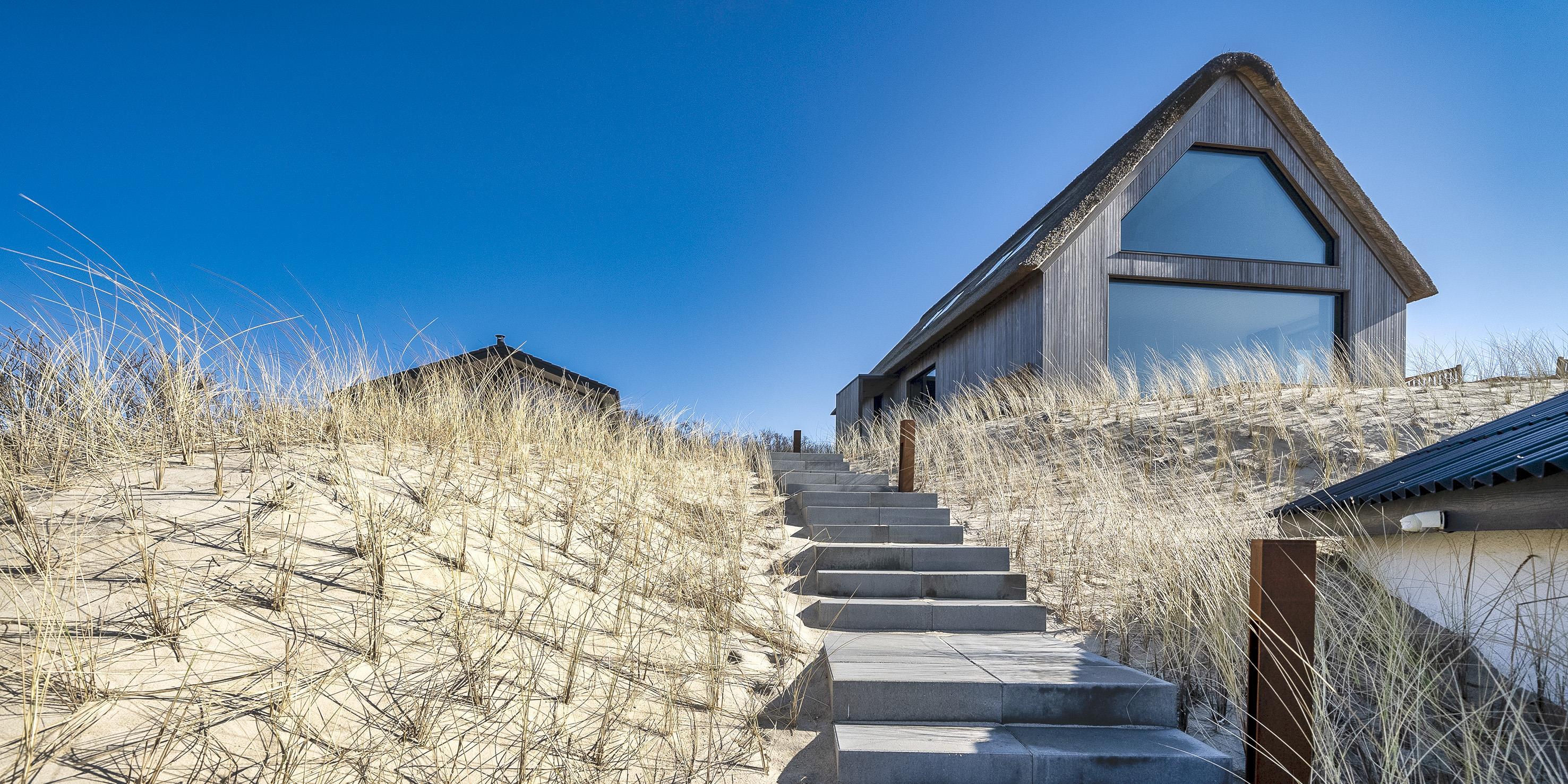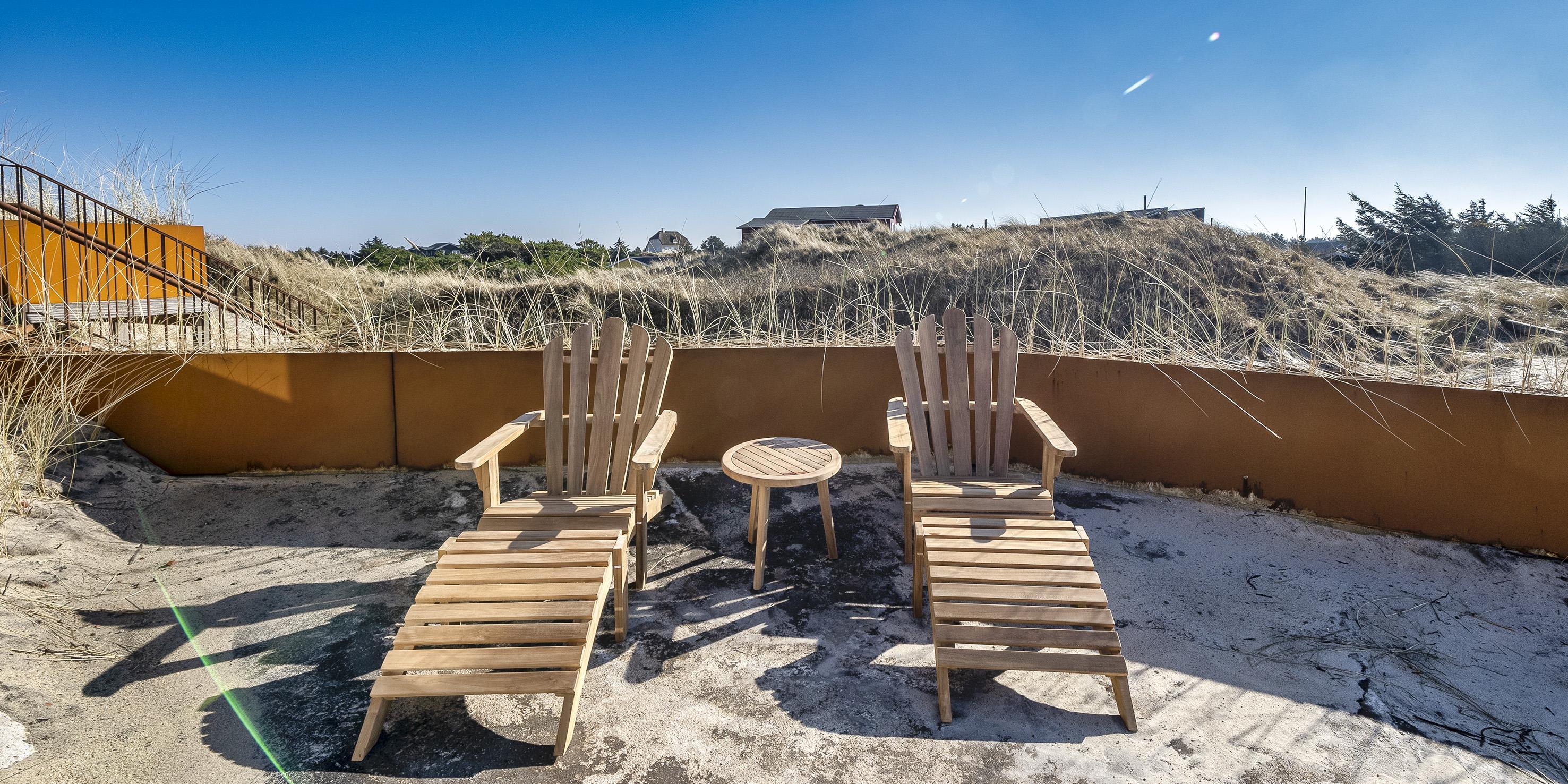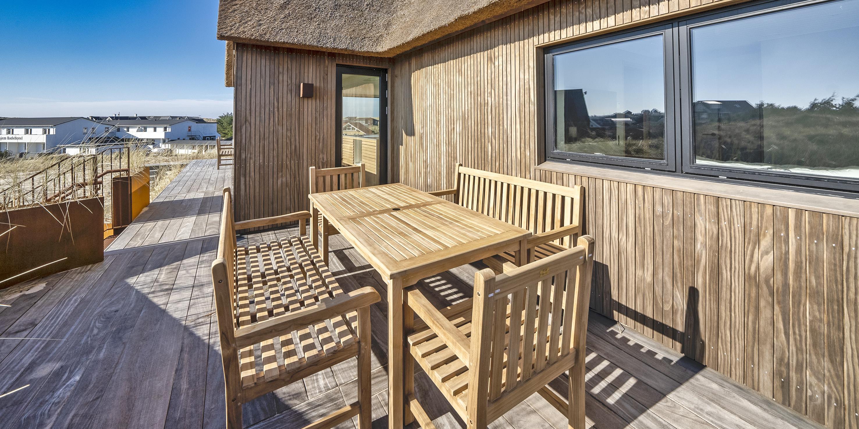Die Außenanlagen bieten wunderschöne Sonnenuntergänge, die von der großen umlaufenden Holzterrasse aus genossen werden können. Das Ferienhaus liegt auf einem hohen Dünengrundstück, ca. 200 Meter vom Strand entfernt und in kurzer Entfernung zu Einkaufsmöglichkeiten und Restaurants.