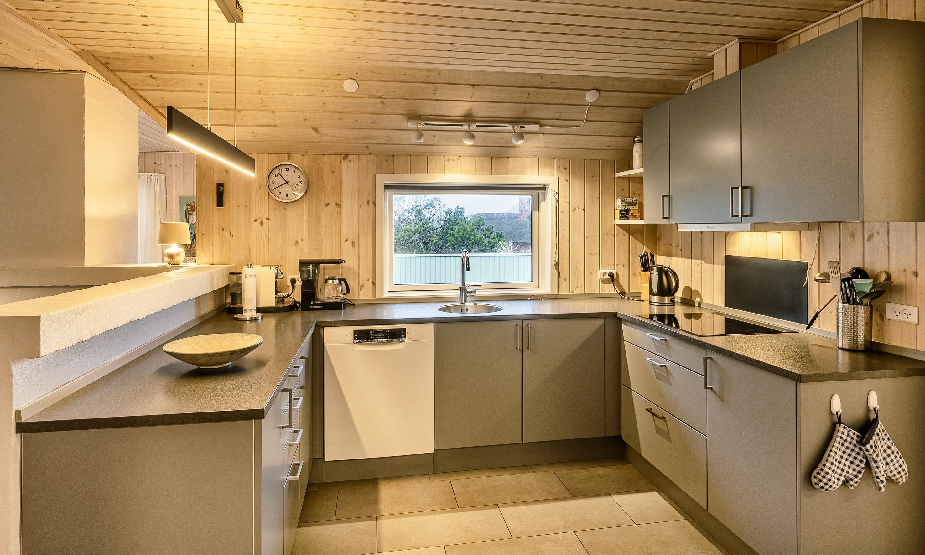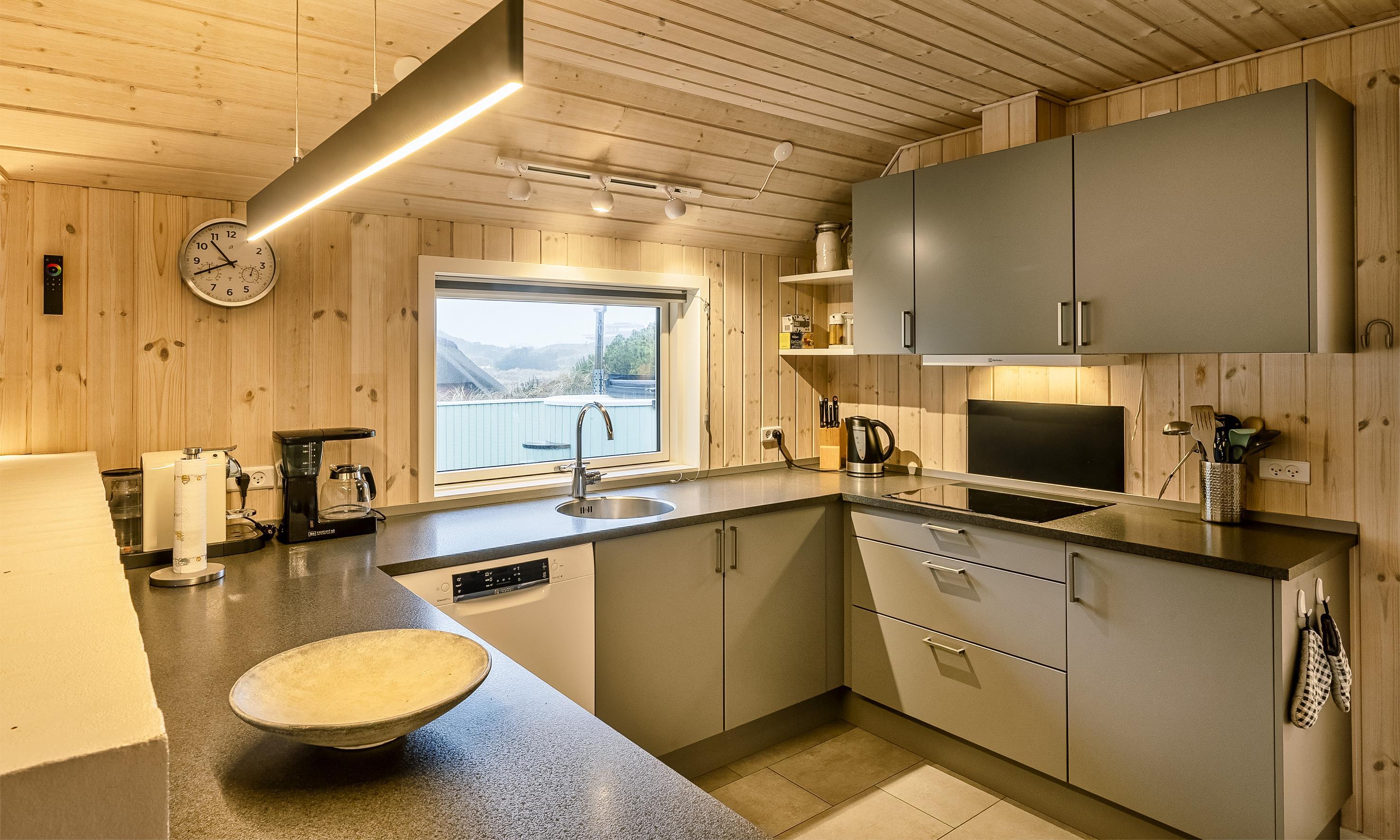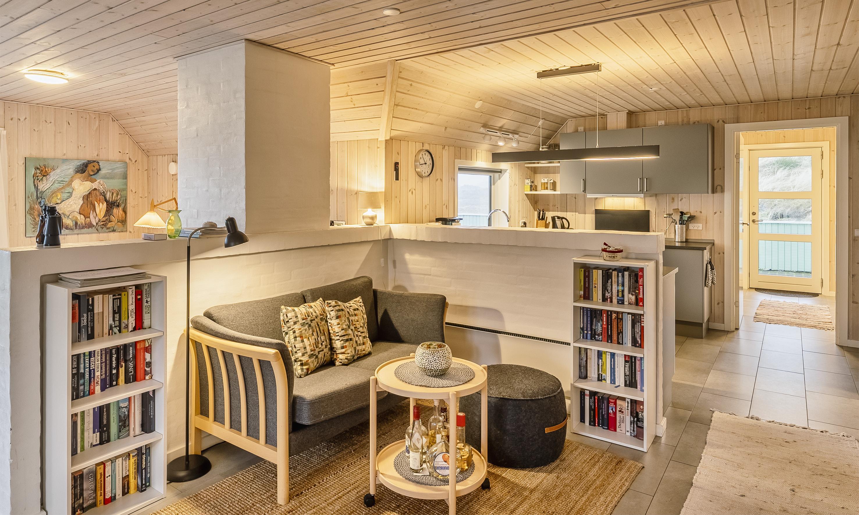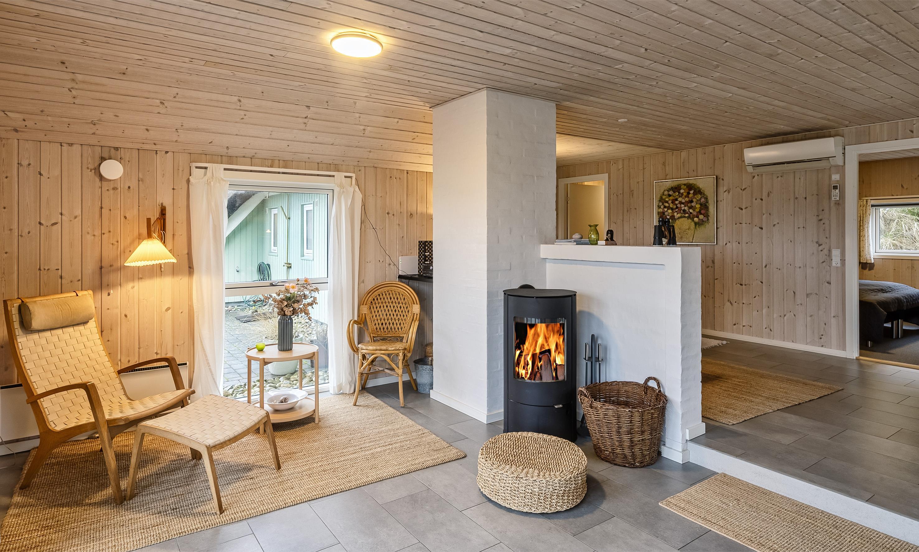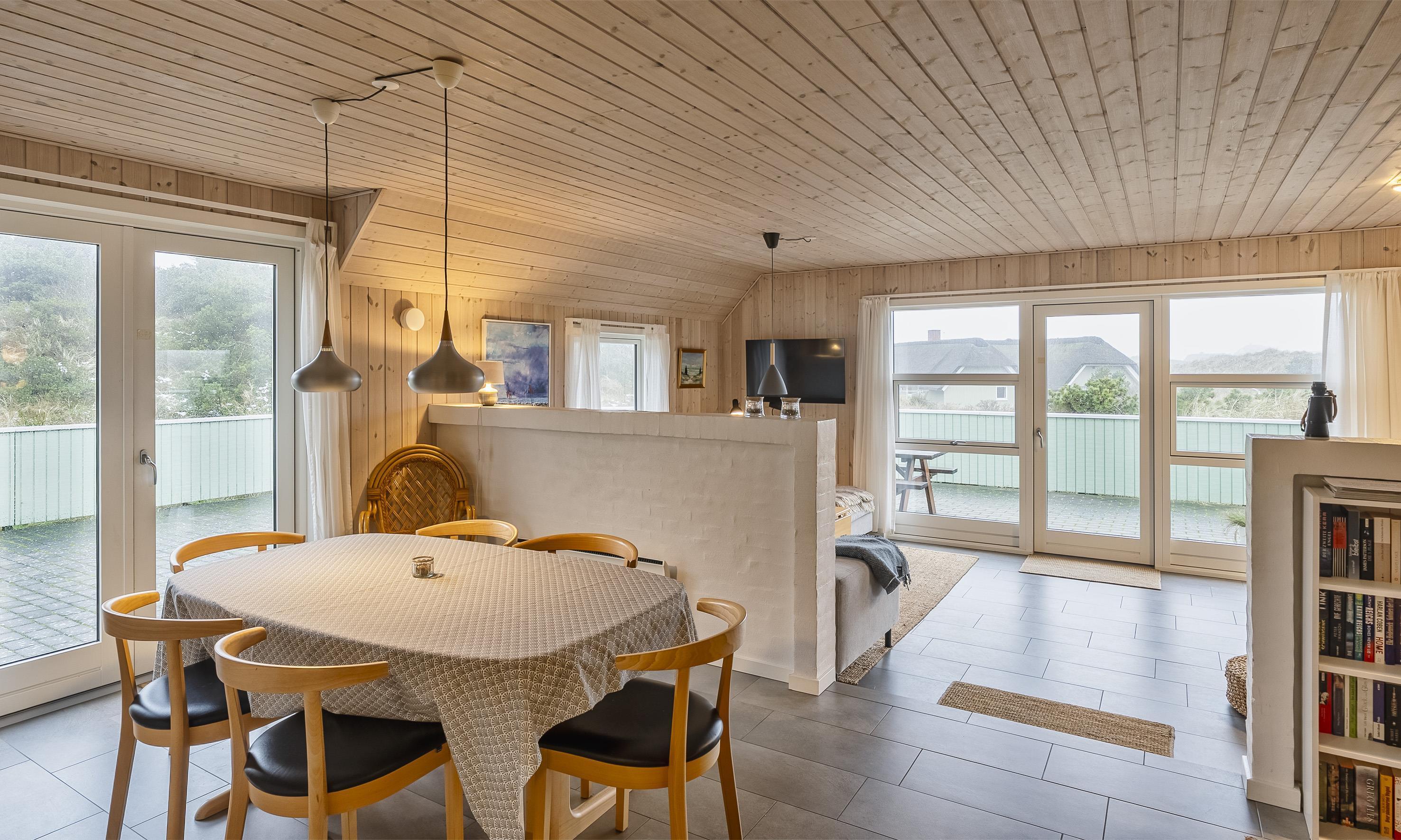 Der Wohnbereich geht mit eine Stufe nach unten, wo sich auch dann der Kamin befindet. Hier steht Ihnen tolles Mobilar, mit gemütlichen Sesseln am Kamin und einem Ecksofa zur Gemütlichkeit zur Verfügung. Es gibt dutsche Fernsehprogramme und dänische (DR Kanäle) im Hause. Ein kleine gemütliche Ecke mit einem kleinen Extra-Sofa für gemütliche Lesestunden und einem Ausgang zum Terrassenbereich befindet sich auch wieder im Hause. Vom Eingangsbereich gelangt man in den hellen Küchenbereich. In der Küche befindet sich ein Herd mit Cerankochfeld, ein Backofen, eine Geschirrspülmaschine und eine Kühl- und Gefrierkombination. Die Küche ist mit einer halbhohen Mauer zum Essbreich getrennt und trotzalledem offen gehalten. Es gibt insgesamt drei Schlafzimmer im Ferienhaus: DB + DB + 2B. Das 4. Schlafzimmer befindet sich im isoliertem und aufwärmbaren Anneks/Gätehaus. Dort befinden sich dann die weitrern 2 Schlafplätze. Das ist ein Etagenbett. Vom Eingangsbereich gelangen Sie in ein Gäste WC, ausgestattet mit WC und Handwaschbecken. Eine Waschmaschine und ein Trockner stehen den Gästen auch zur Verfügung. Ein grosses neues Badezimmer steht den Gästen ebenfalls zur Verfügung. Es verfügt über ein Handwaschbecken, ein WC, eine Dusche, einem Eck-Whirlpool und einer Sauna. Auf der großen und geschlossenen Terrasse können Sie bei einer Tasse Kaffee dem Meeresrauschen zuhören, dies ist Enstspannung pur und Balsam für die Seele. Das Ferienhaus verfügt über einen Internetanschluss (W-Lan). Das Baujahr des Hauses ist von 2019. Hinter dem Gästehaus wird ein kleiner Schuppen gebaut für die Gartenmöbel.