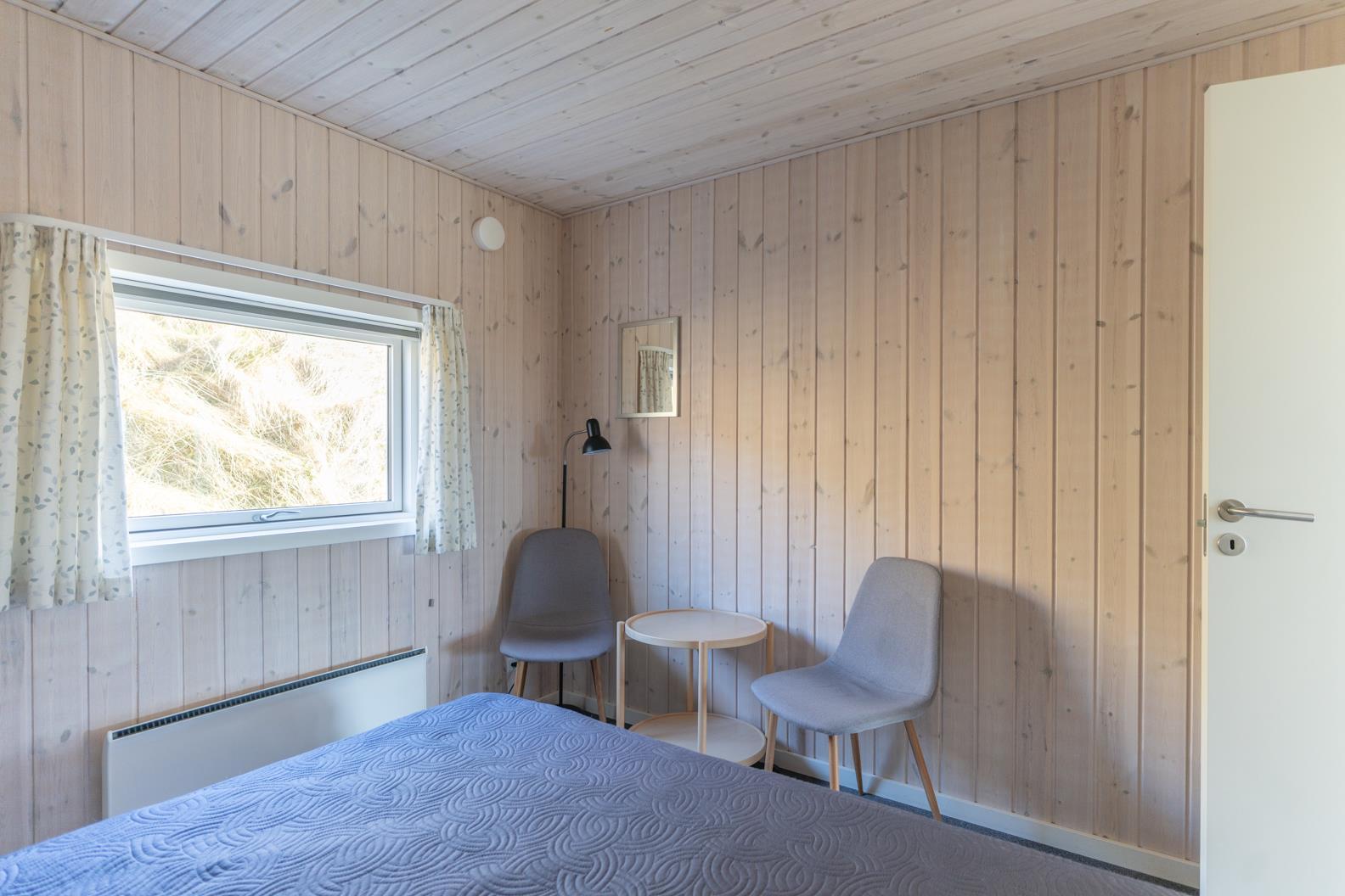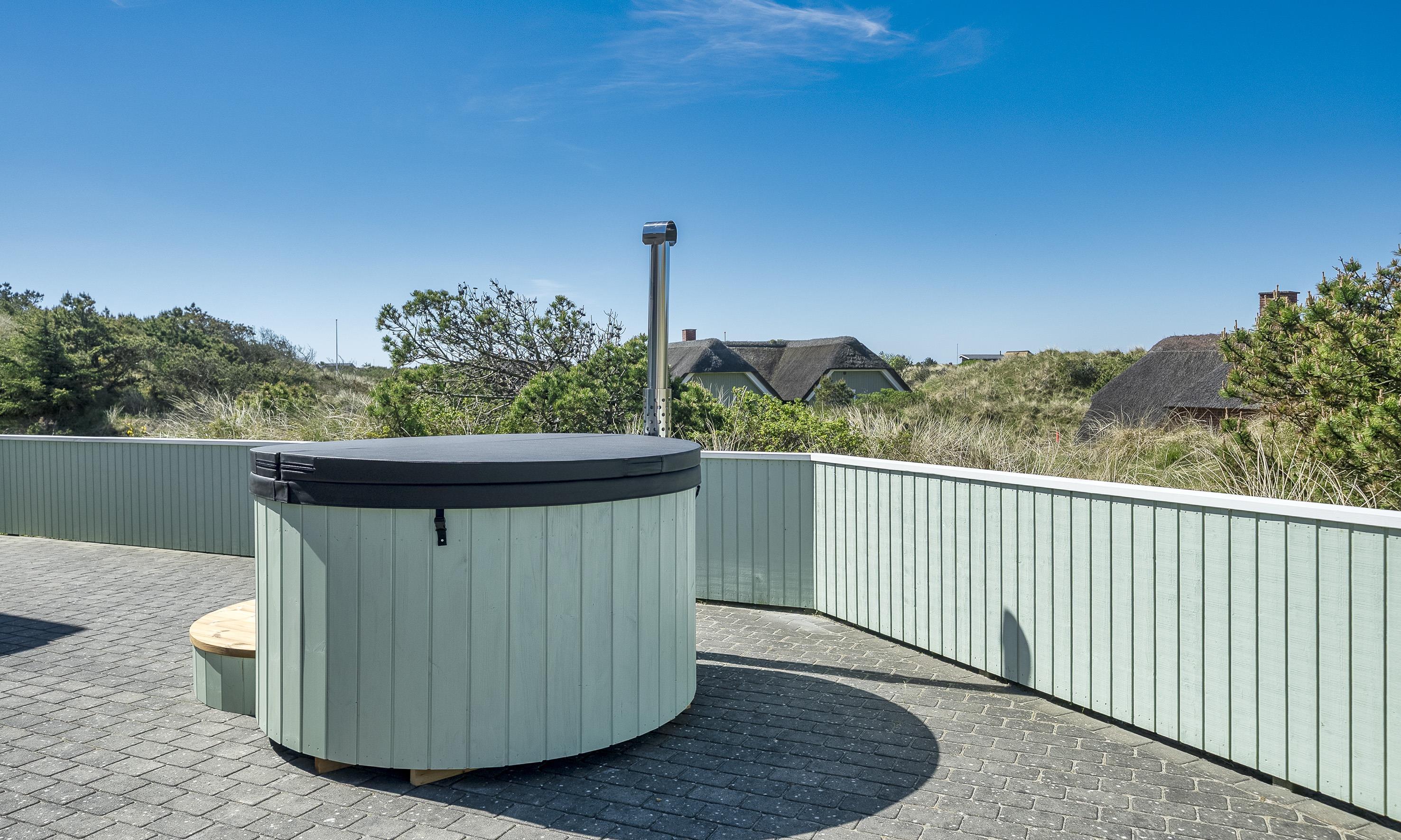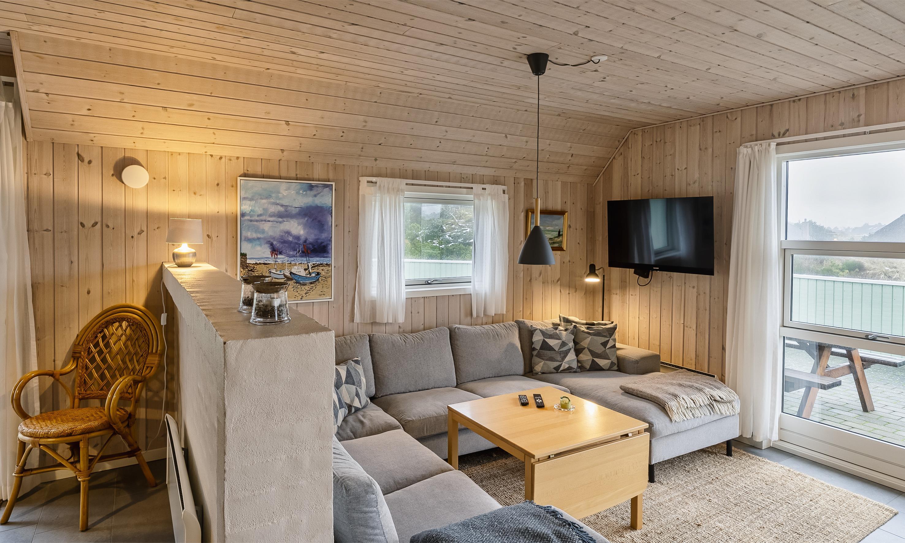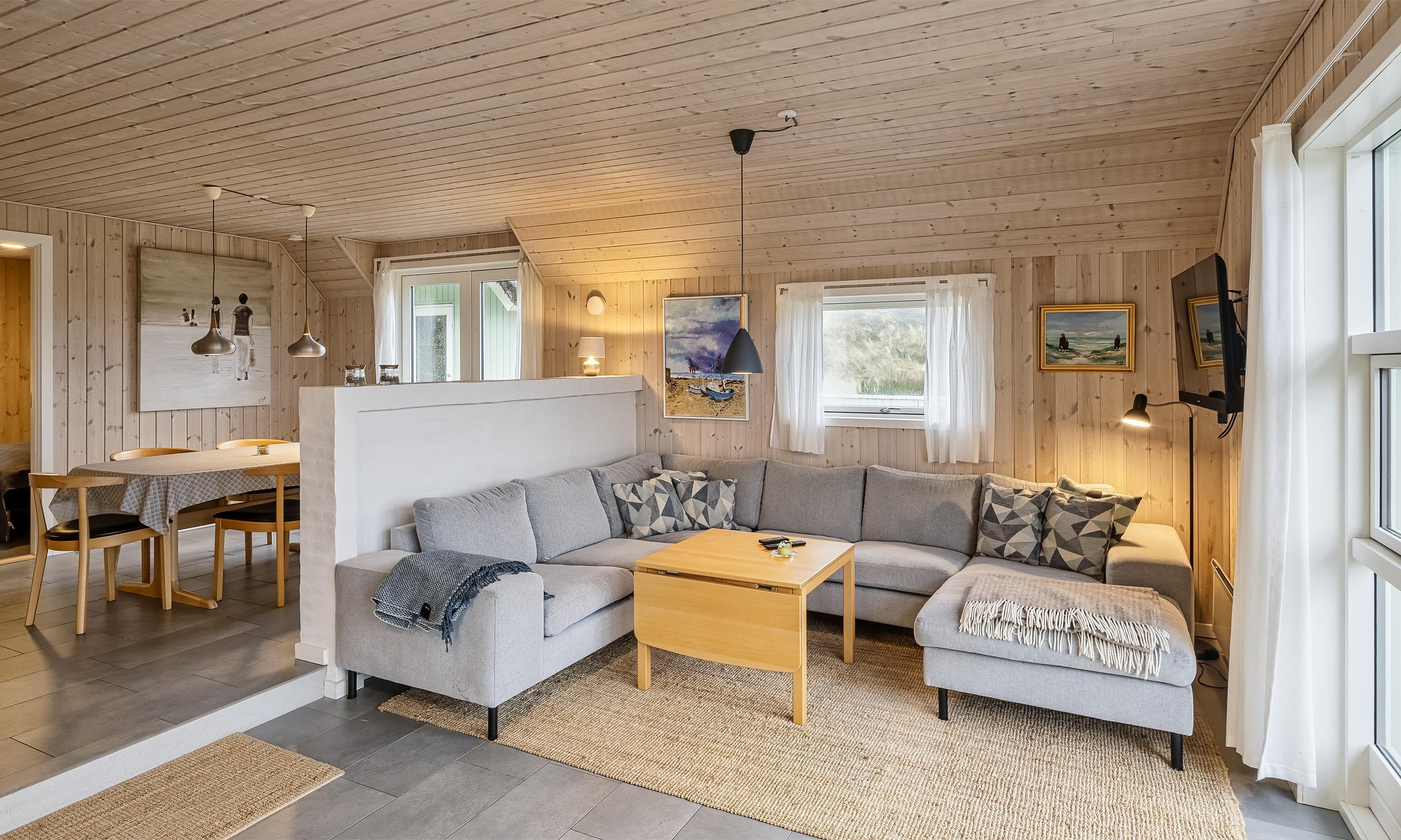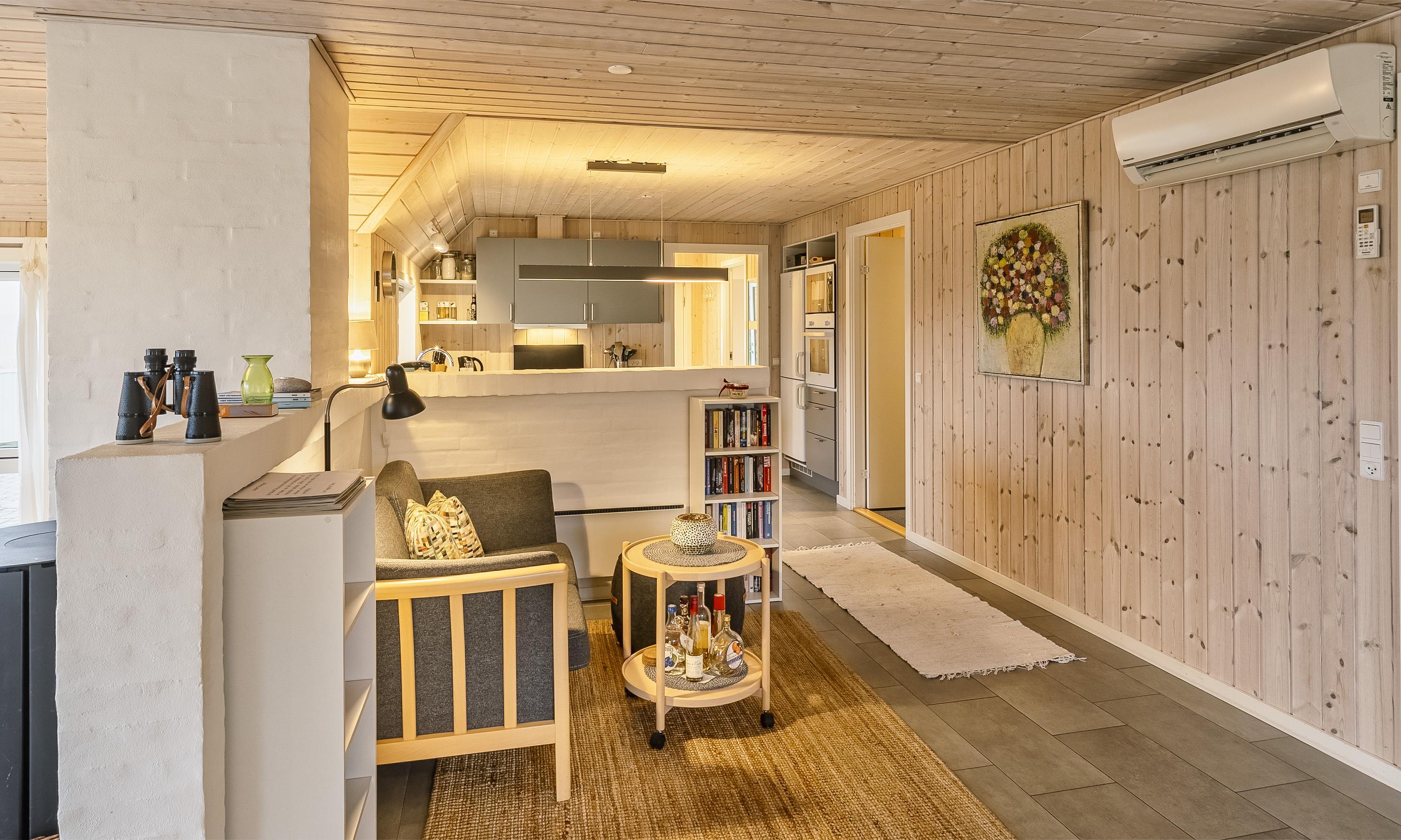 Der Wohnbereich geht mit eine Stufe nach unten, wo sich auch dann der Kamin befindet. Hier steht Ihnen tolles Mobilar, mit gemütlichen Sesseln am Kamin und einem Ecksofa zur Gemütlichkeit zur Verfügung. Es gibt dutsche Fernsehprogramme und dänische (DR Kanäle) im Hause. Ein kleine gemütliche Ecke mit einem kleinen Extra-Sofa für gemütliche Lesestunden und einem Ausgang zum Terrassenbereich befindet sich auch wieder im Hause. Vom Eingangsbereich gelangt man in den hellen Küchenbereich. In der Küche befindet sich ein Herd mit Cerankochfeld, ein Backofen, eine Geschirrspülmaschine und eine Kühl- und Gefrierkombination. Die Küche ist mit einer halbhohen Mauer zum Essbreich getrennt und trotzalledem offen gehalten. Es gibt insgesamt drei Schlafzimmer im Ferienhaus: DB + DB + 2B. Das 4. Schlafzimmer befindet sich im isoliertem und aufwärmbaren Anneks/Gätehaus. Dort befinden sich dann die weitrern 2 Schlafplätze. Das ist ein Etagenbett. Vom Eingangsbereich gelangen Sie in ein Gäste WC, ausgestattet mit WC und Handwaschbecken. Eine Waschmaschine und ein Trockner stehen den Gästen auch zur Verfügung. Ein grosses neues Badezimmer steht den Gästen ebenfalls zur Verfügung. Es verfügt über ein Handwaschbecken, ein WC, eine Dusche, einem Eck-Whirlpool und einer Sauna. Auf der großen und geschlossenen Terrasse können Sie bei einer Tasse Kaffee dem Meeresrauschen zuhören, dies ist Enstspannung pur und Balsam für die Seele. Das Ferienhaus verfügt über einen Internetanschluss (W-Lan). Das Baujahr des Hauses ist von 2019. Hinter dem Gästehaus wird ein kleiner Schuppen gebaut für die Gartenmöbel.