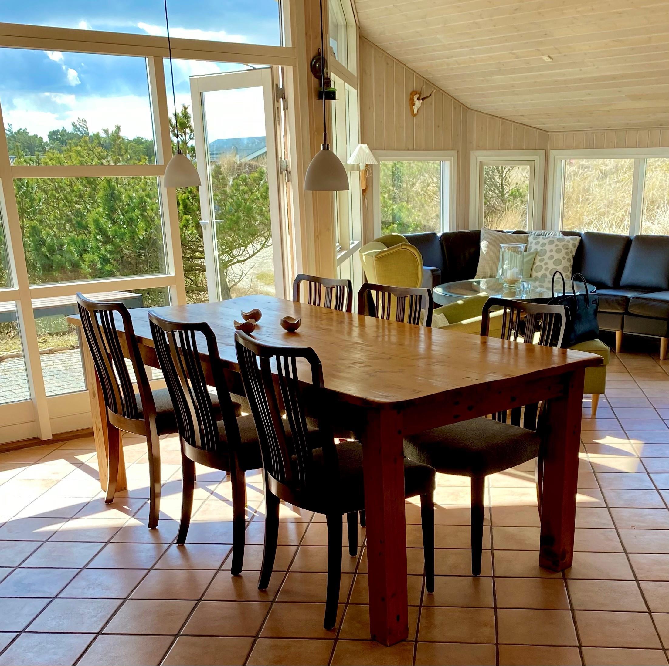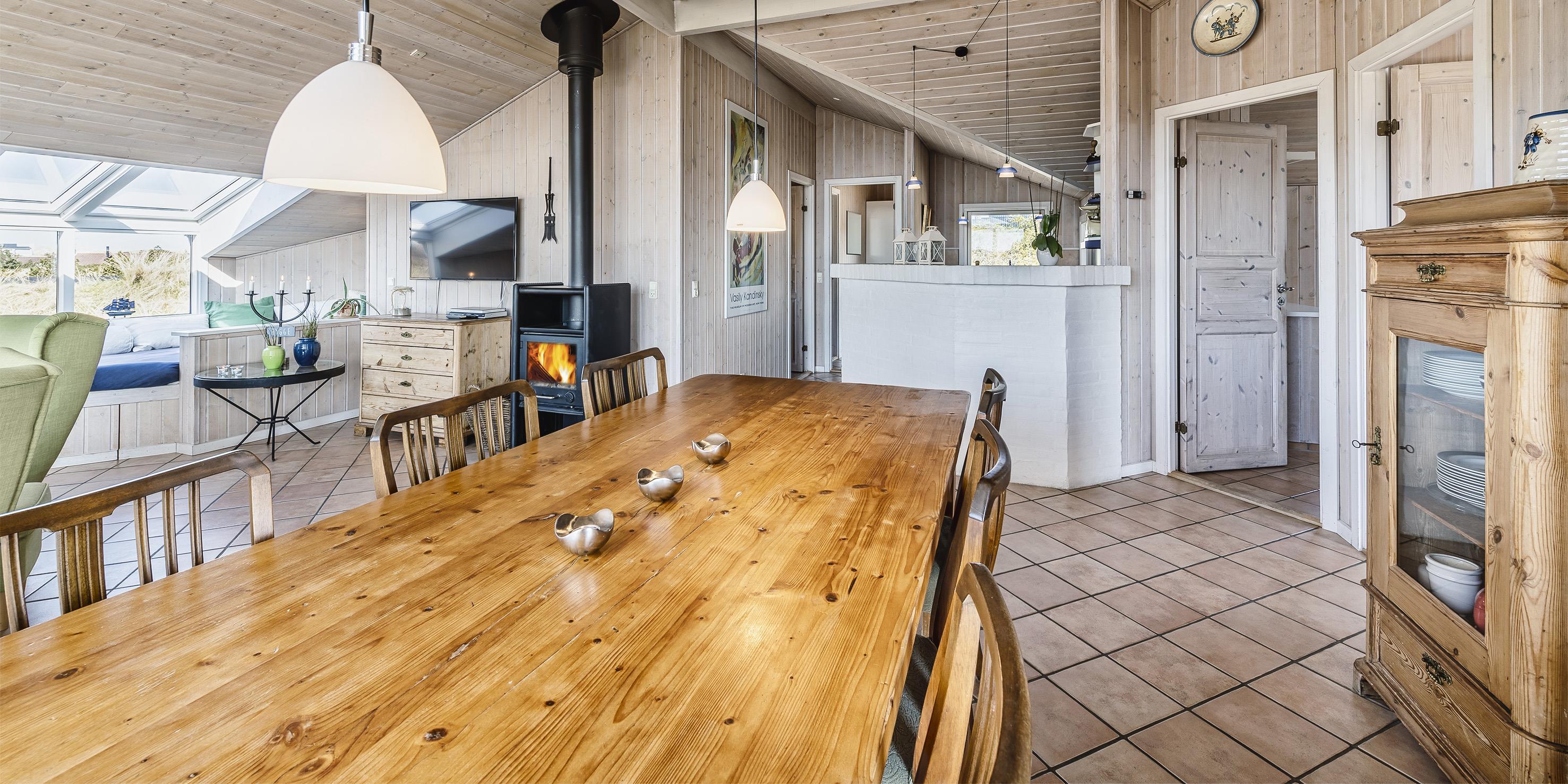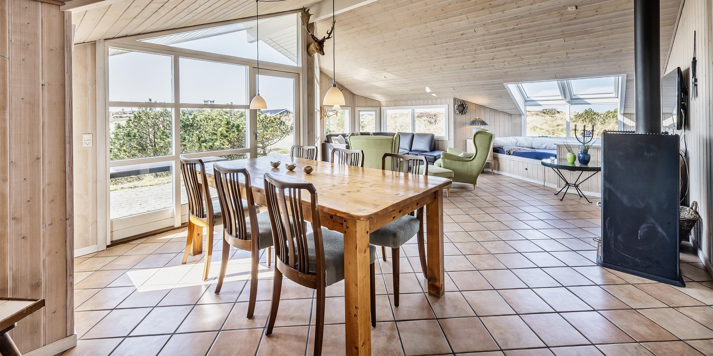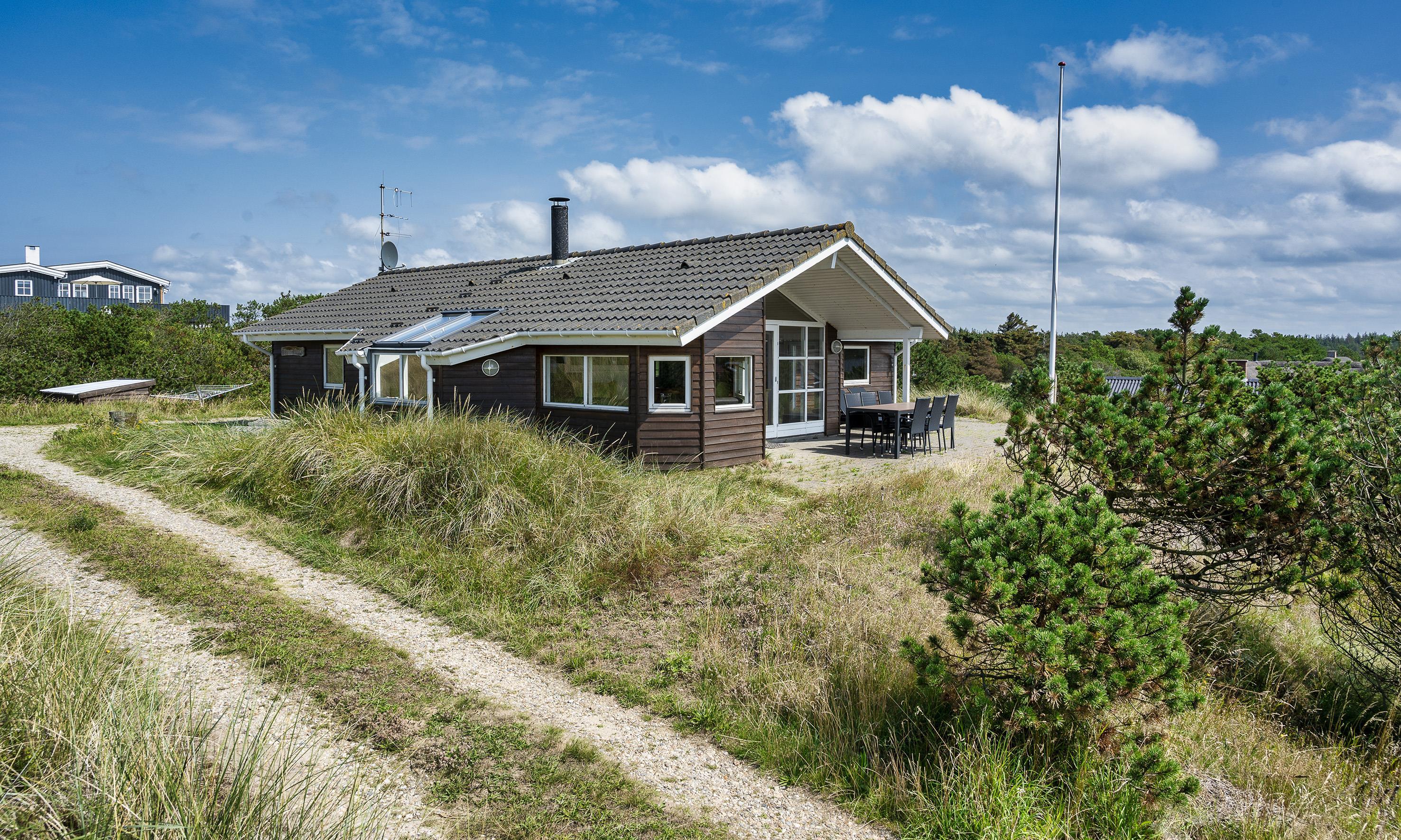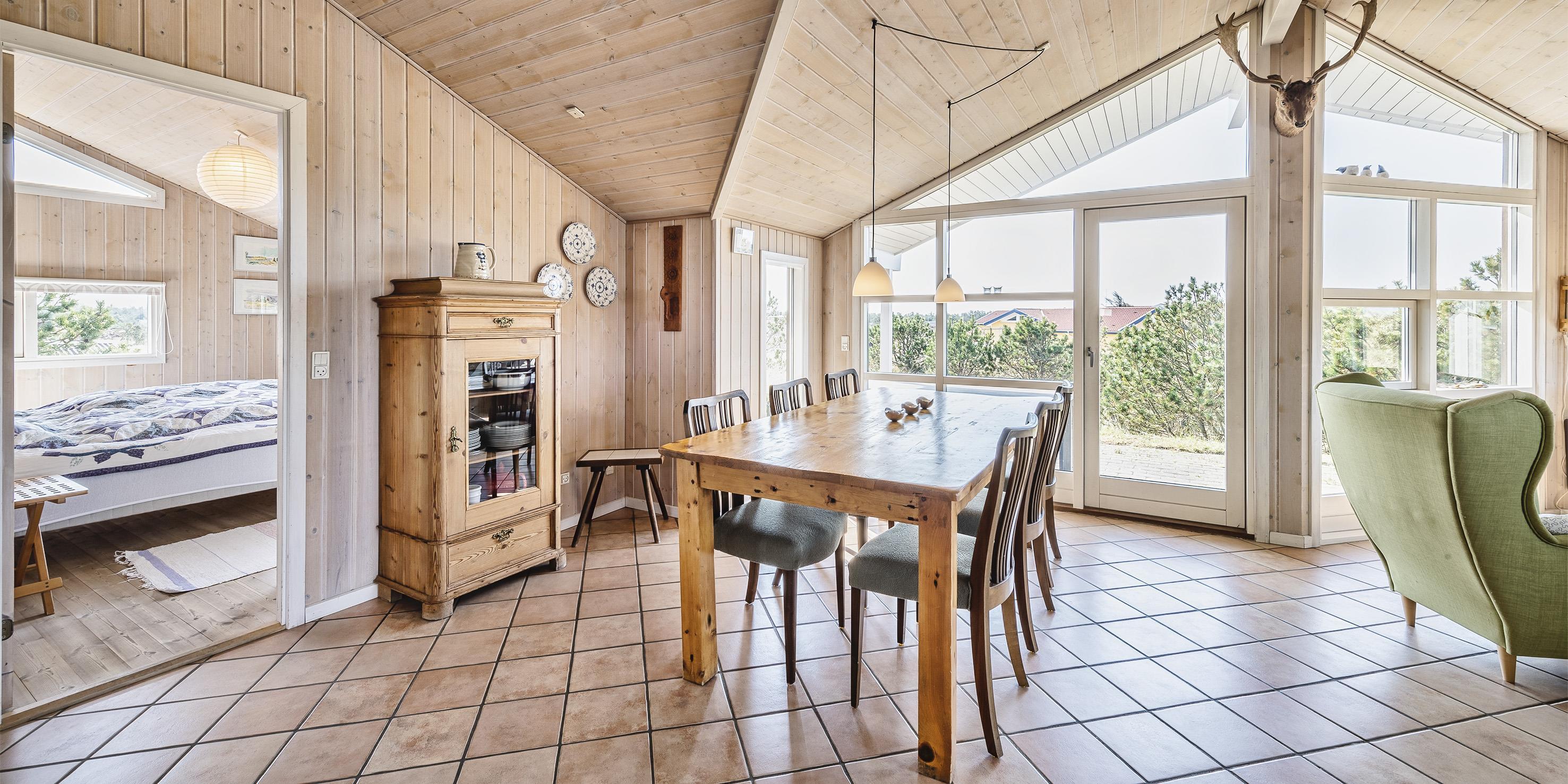 Dieses geschmackvoll eingerichtetes Ferienhaus mit Panoramaaussicht über die Dünenlandschaft liegt in einer bevorzugten Lage von Vejers Strand und ist für 6 Personen ausgestattet. Der Strand ist ca. 400 Meter vom Ferienhaus entfernt. Der Wohn- und Essbereich ist mit einer hübschen mediterranen Bodenfliese verlegt worden und strahlt Gemütlichkeit aus. Neben der Wohnzimmergarnitur ist ein Alkoven. Durch die eingebauten Oberlichter kommt viel Licht rein und Sie können hier einfach nur entspannen oder auch ein Buch lesen. Dazu den daneben stehenden Kamin angezündet strahlt es eine besondere Gemütlichkeit bzw. besonderen Flair aus.Es befindet sich eine Warmepumpe ab Januar 2023 im Ferienhaus. Mit dieser Warmepumpe haben sie die Möglichkeit die Stromkosten zu senken, denn die Warmepumpe ist energiesparend. Der Wohn- und Essreich ist licht durchflutet durch die großzügige Fensterfront im Wohnzimmerbereich Das deutsche Fernsehprogramm empfangen Sie über Stofa, daher sind es nur 5-8 Kanäle die Sie empfangen können. Die offen gehaltene Küche verfügt über einen Herd mit Cerankochfeld, einem Backofen, einer Geschirrspülmaschine und einer Kühl- und Gefrierkombination, alles in Edelstahloptik gehalten. Eine Mikrowelle steht auch zur Verfügung. Das Badezimmer verfügt über ein WC, ein Handwaschbecken, eine Dusche und einer Sauna. Es gibt drei Schlafzimmer im Ferienhaus: DB + DB + 2B. Zwei davon sind mit einem Doppelbett ausgestattet und das Dritte verfügt über zwei Einzelbetten. Eine Waschmaschine und ein Trockner stehen zur Benutzung bereit. Auf der großzügige Terrasse haben Sie genügend Platz für Ihre Grillabende oder für eine Kaffeetafel mit wundervollen Blick. Ein Teil davon ist sogar überdacht. Oder genießen Sie einfach mal Ihre Sonnenbad auf der Terrasse. Das Ferienhaus verfügt über einen Internetanschluss (W-Lan). Das Rauchen im Ferienhaus ist nicht erlaubt. Es sind keine Haustiere erlaubt, mit Ausnahme ein kleiner Hund mit max. Rückenhöhe von 30 cm. Ladestation für Elektroautos. Das Ferienhaus ist 1997 erbaut worden und laufend renoviert.