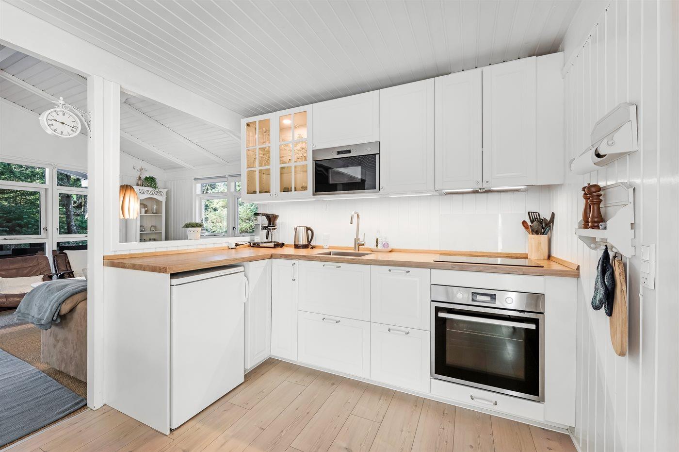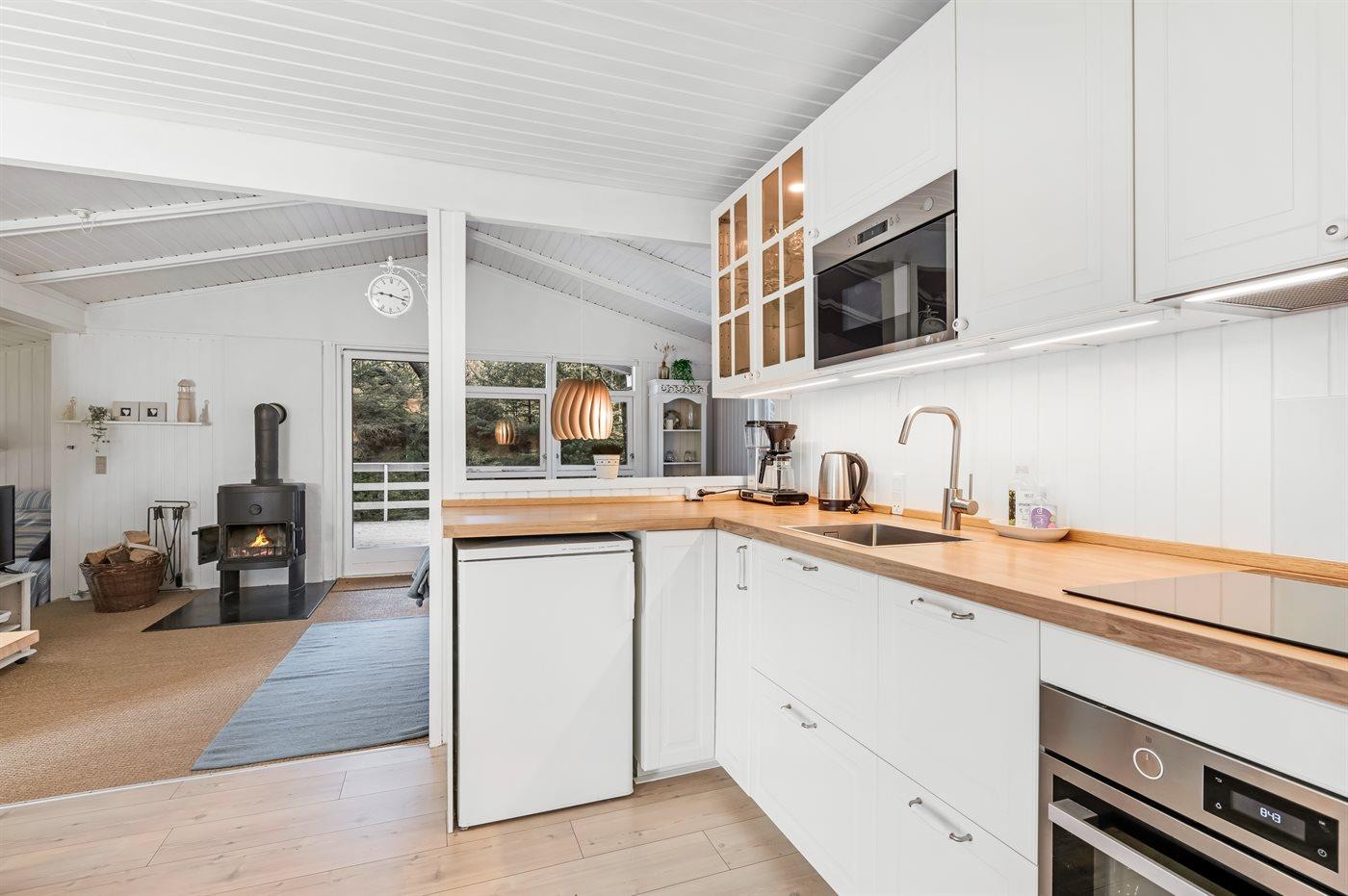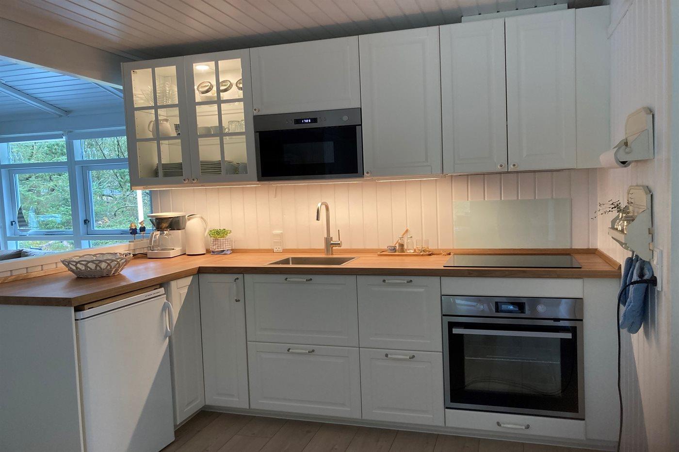 Die Küche (aus dem Jahr 2021) ist unter anderem mit einem Kühlschrank, einem Gefrierfach mit 10 Litern Gefrierkapazität, einem Induktionsherd, einem Backofen und einer Mikrowelle ausgestattet.