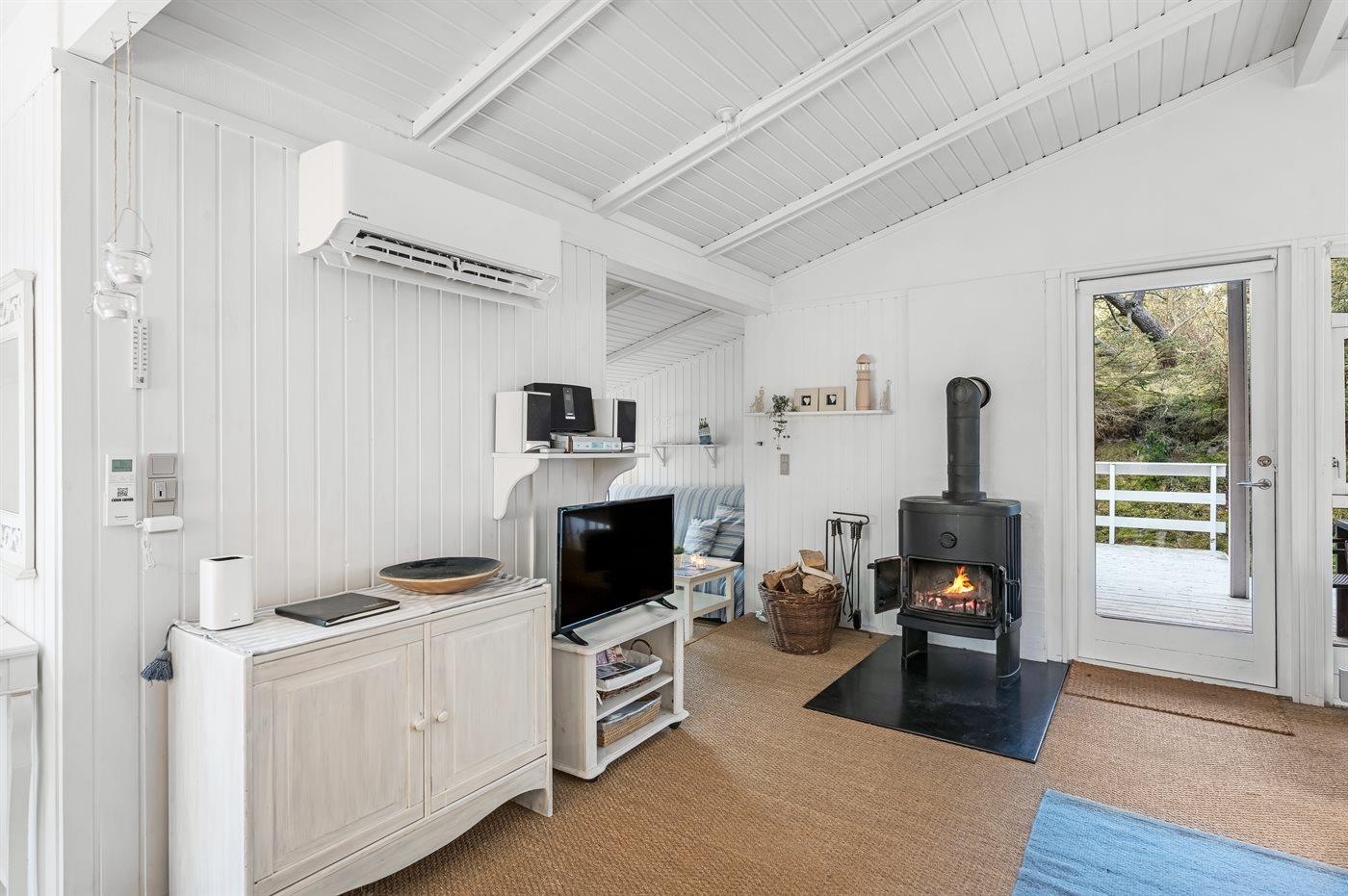 Im Wohnzimmer gibt es einen benutzerfreundlichen Kaminofen (aus dem Jahr 2024) und eine energieeffiziente Luft-Luft-Wärmepumpe. Es gibt einen Fernseher mit Chromecast, ein Radio und einen Bluetooth-Lautsprecher, und es ist eine kabellose Internetverbindung installiert.