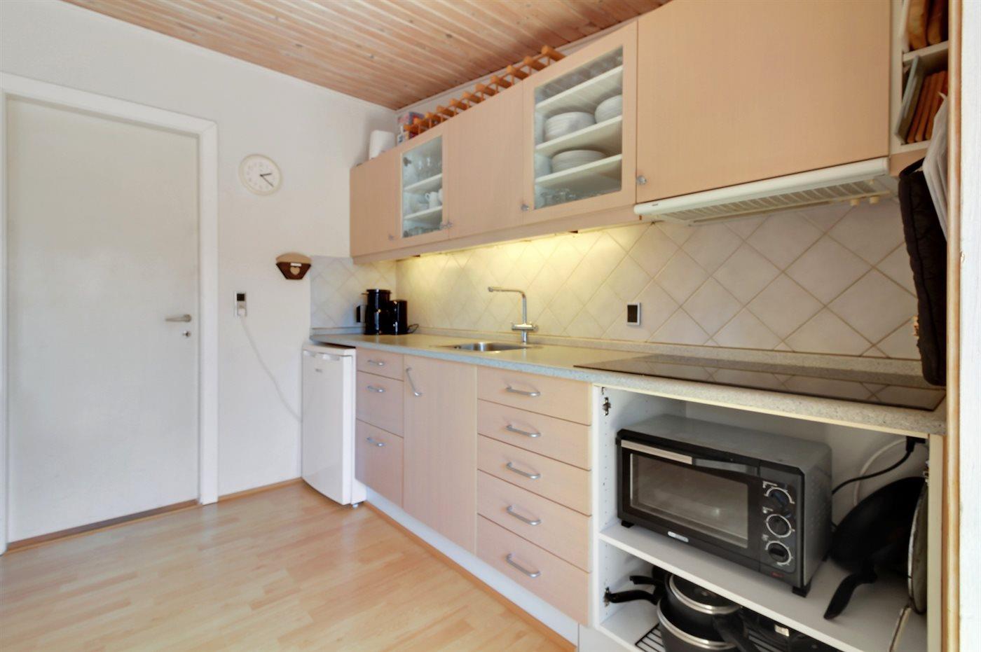 Die Küche ist mit Kühlschrank ausgestattet. Außerdem gibt es 4 Keramik-Kochfelder, Backofen, Mikrowelle.