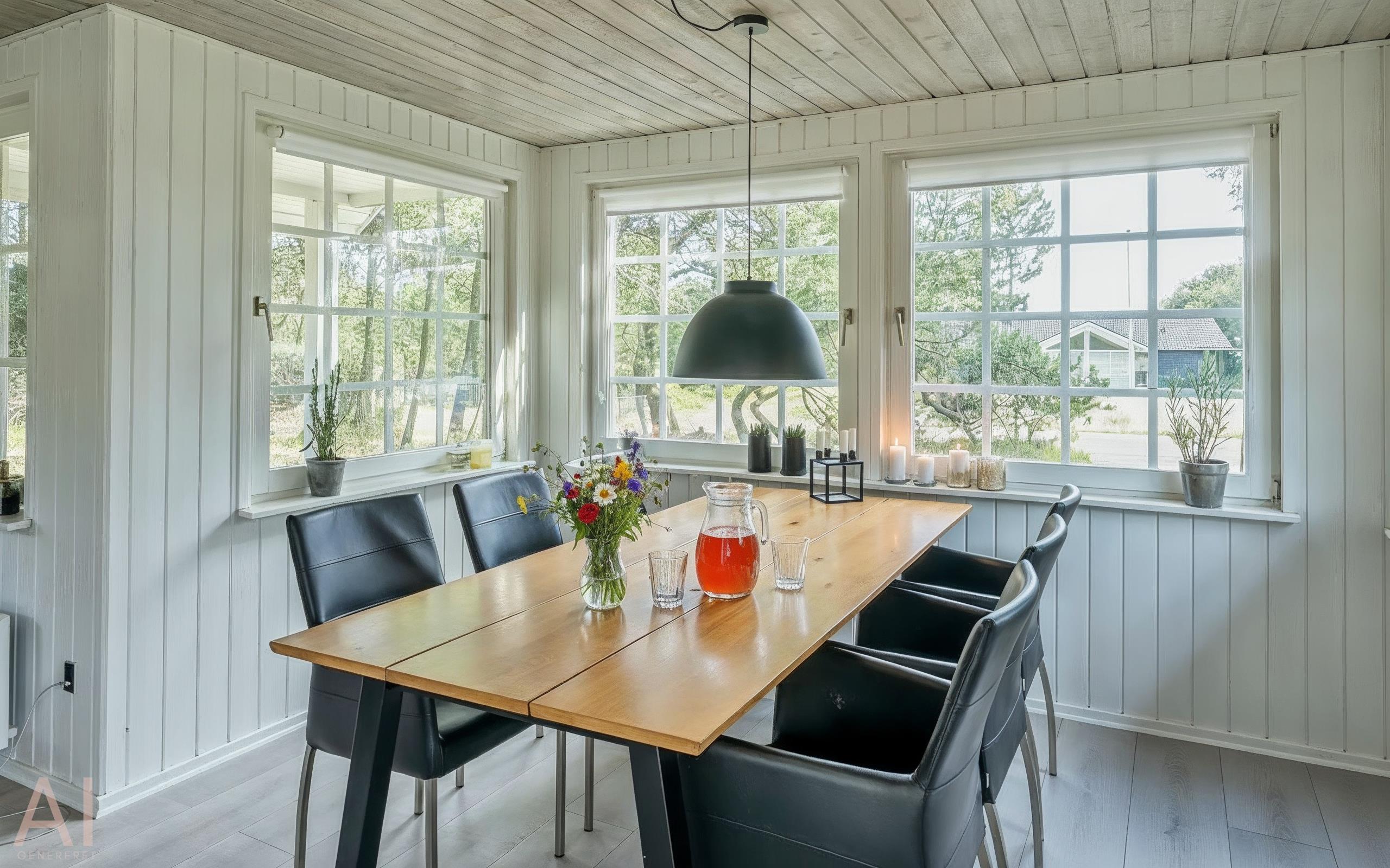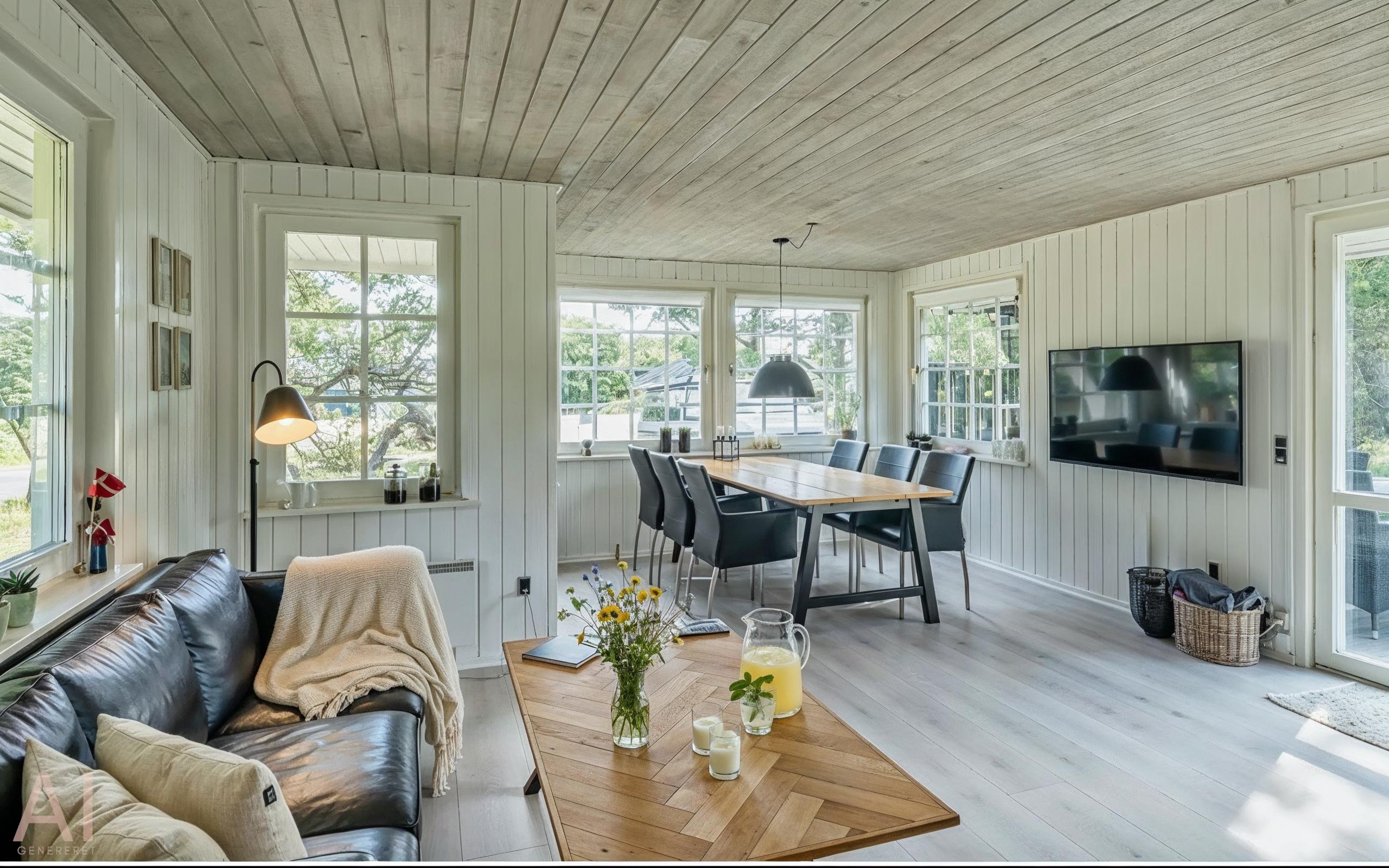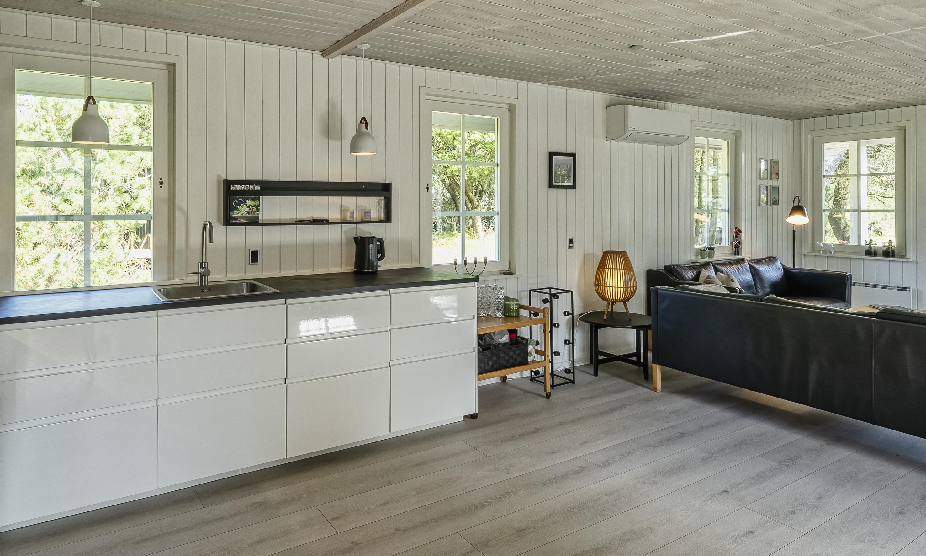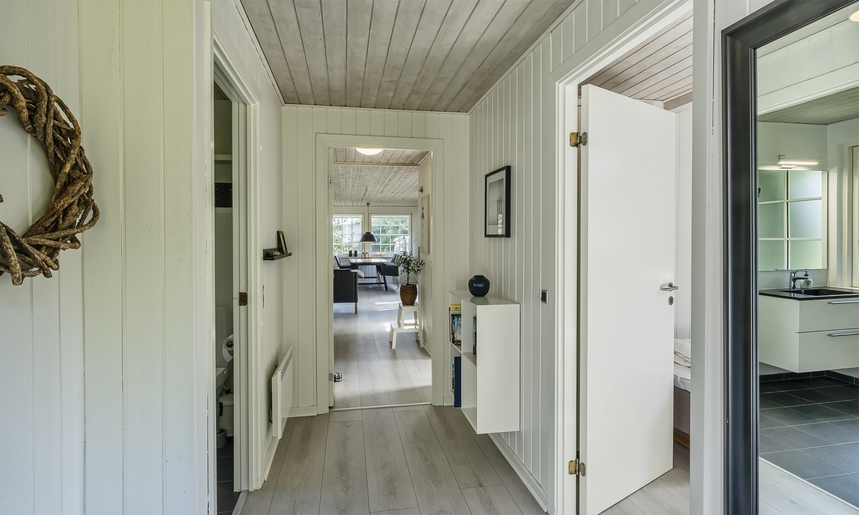 Das Haus ist gut eingerichtet mit einem schönen Lichteinfall und umfasst einen Eingangs-/Hintereingangsbereich mit viel Platz für Oberbekleidung und Schuhe. Gut ausgestattete Küche, Essbereich und Wohnzimmer mit Zugang zur Terrasse. Es gibt einen Kaminofen und eine Wärmepumpe. Das Badezimmer verfügt über eine Toilette, ein Waschbecken, eine Dusche, eine Waschmaschine und einen Trockner sowie Fliesen mit Fußbodenheizung. Zwei Schlafzimmer mit Schrankplatz. In einem Schlafzimmer gibt es ein Doppelbett, im anderen zwei Einzelbetten (DB + 2EB).