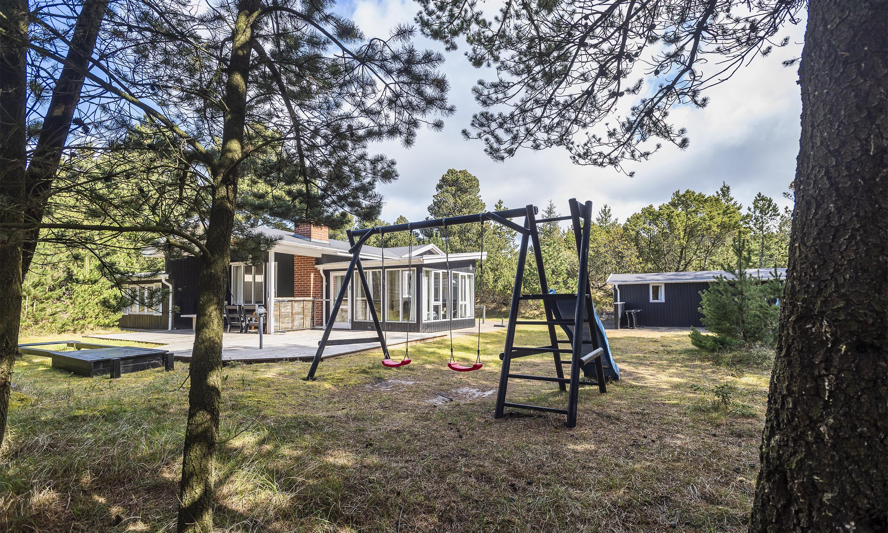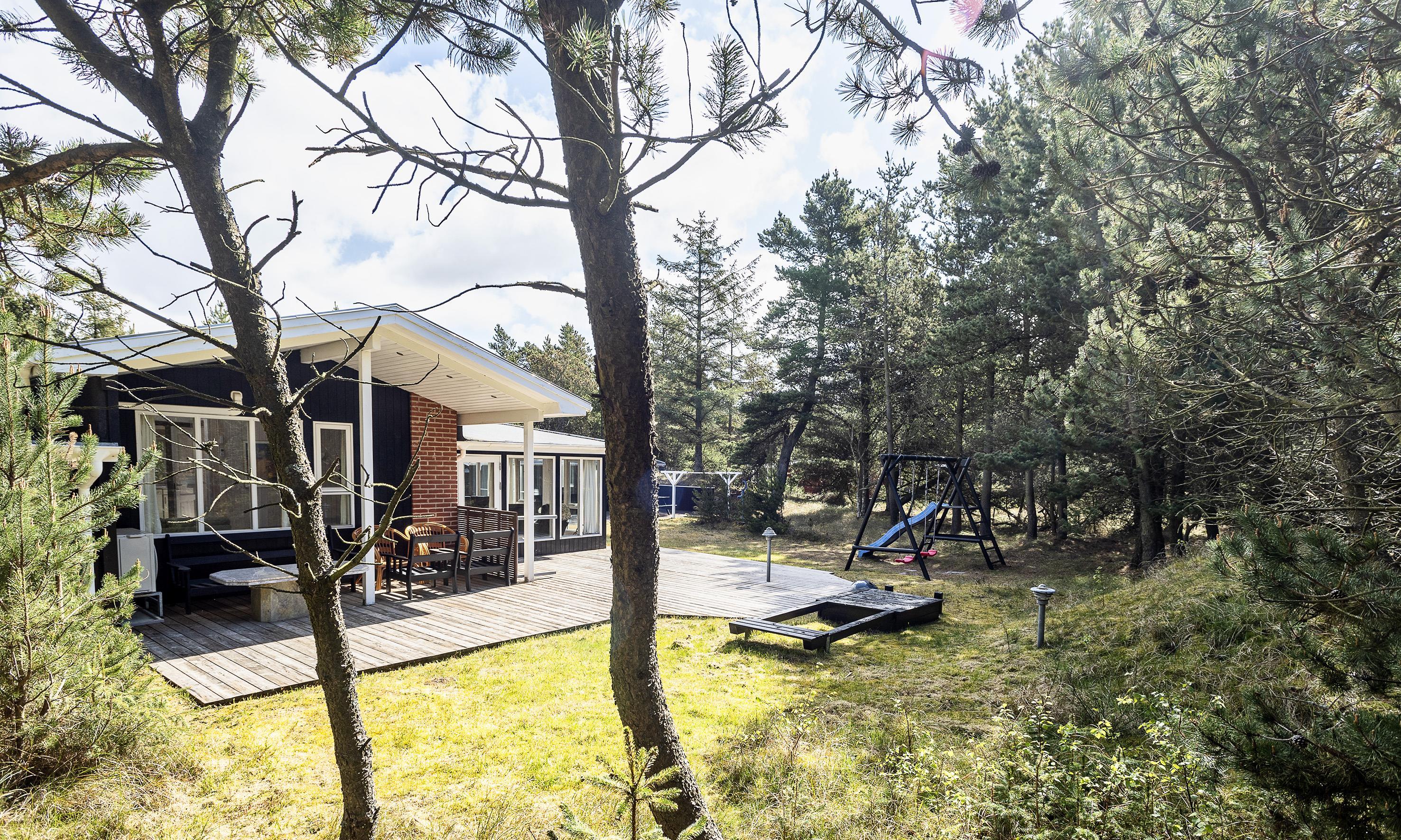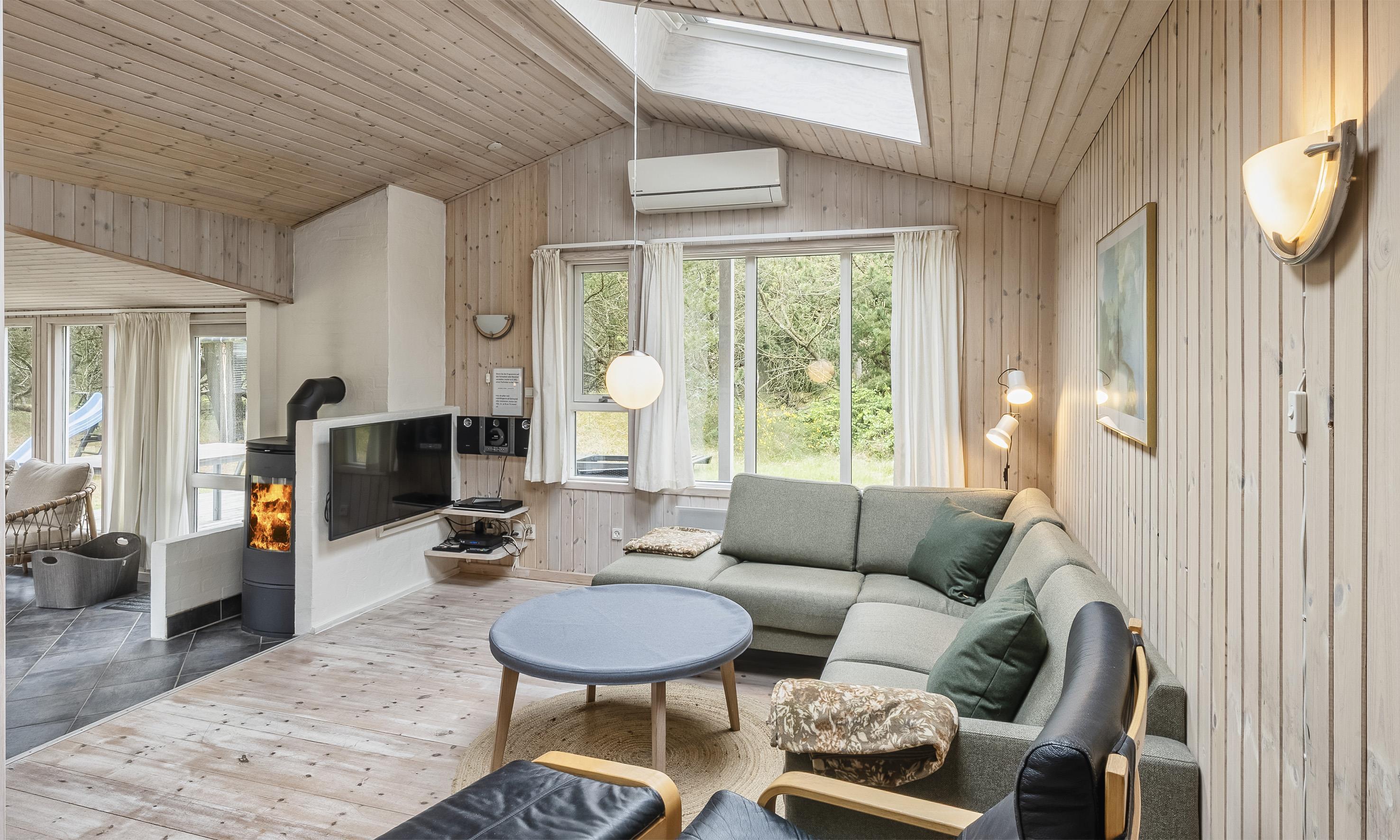 Hübsche eingerichtetes und freundliches Ferienhaus, mit Namen ”Solglimt” auf einem geschlossenen Waldgrundstück gelegen und für 6 Personen ausgestattet. Es liegt nur 1 Km vom Strand entfernt. Das Wohnzimmer ist mit gemütlichen Ledermöbeln und tollem Holzfußboden ausgestattet und durch das Oberlicht kommt zusätzlich viel Helligkeit in diesen Bereich. Das deutsche Fernsehprogramm empfangen Sie über eine Parabolantenne. Über eine Stufe nach unten kommen Sie dann in den gefliesten Wintergarten, wo auch der Kamin aufgestellt ist. Es befindet sich eine Warmepumpe im Ferienhaus. Mit dieser Warmepumpe haben sie die Möglichkeit die Stromkosten zu senken, denn die Warmepumpe ist energiesparend. Die offene Küche verfügt über einen Herd mit Cerankochfeld, einem Backofen in Arbeitshöhe, eine Geschirrspülmaschine, eine Mikrowelle und einer Kühl- und Gefrierkombination. Das Badezimmer ist mit einem WC, einem Handwaschbecken und einer Dusche ausgestattet. Es gibt drei Schlafzimmer im Ferienhaus: DB + DB + 2B. Das Ferienhaus verfügt über einen Internetanschluss (W-Lan). Die Sauna, die Waschmaschine und der Trockner befinden sich im Nebengebäude auf dem Grundstück. Das Ferienhaus verfügt über mehrere Terrassen, die eine krosse Holzterrasse ist zum Teil auch überdacht. Auf dem Grundstück befindet sich für die ”Kleinen Gäste” auch ein Spiel- und Klettergerüst mit Rutsche und Schaukel. Auch eine Sandkiste ist aufgestellt. Es sind keine Haustiere erlaubt, mit Ausnahme ein kleiner Hund mit max. Rauchen ist nicht erlaubt im Ferienhaus. Rückenhöhe von 30 cm. Der Hund darf nicht in die Möbeln oder Betten. Das Ferienhaus ist 1955 erbaut und in 2010 renoviert worden. Für dieses Ferienhaus entstehen Zusatzkosten für den Wasserverbrauch.