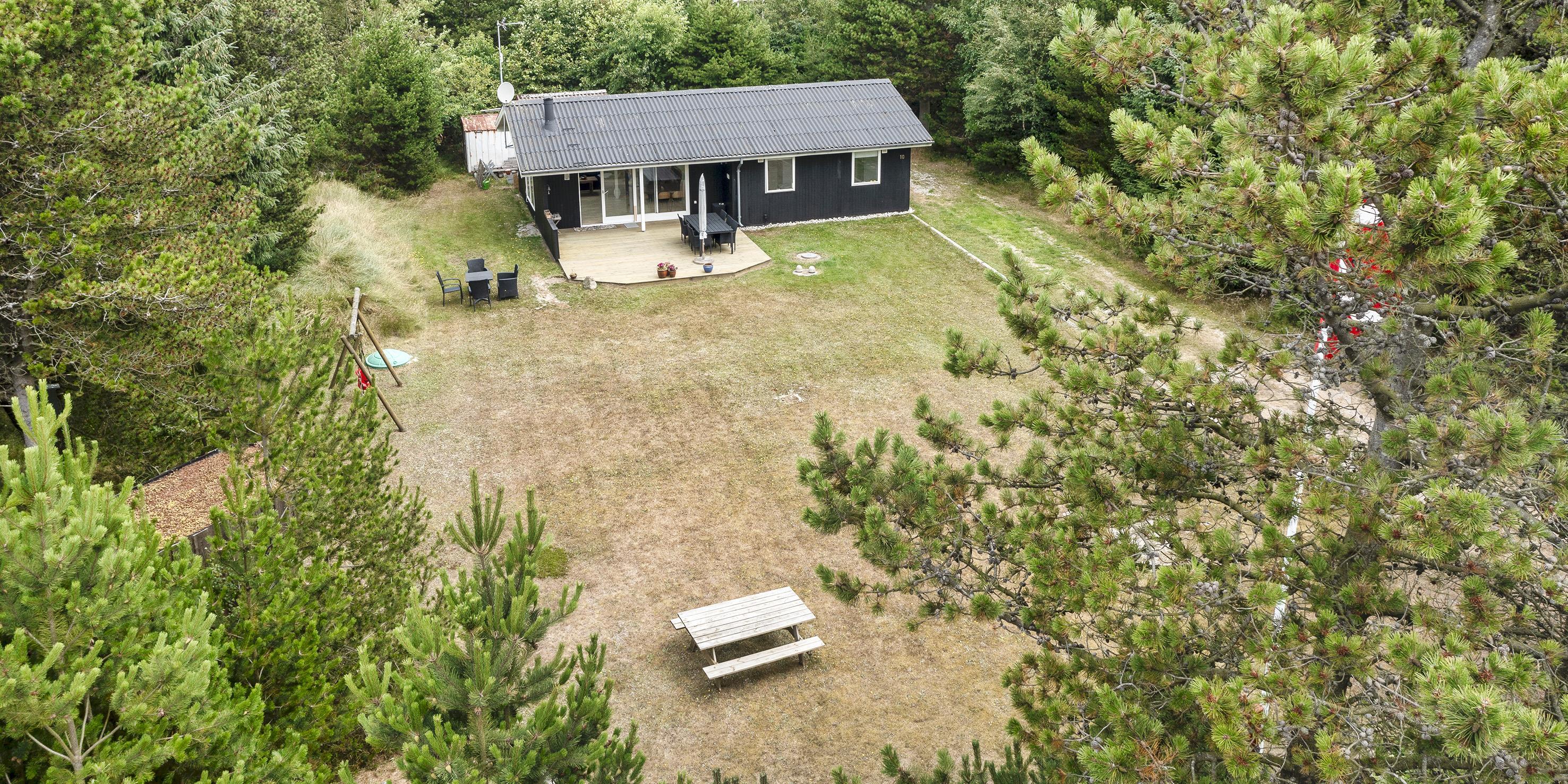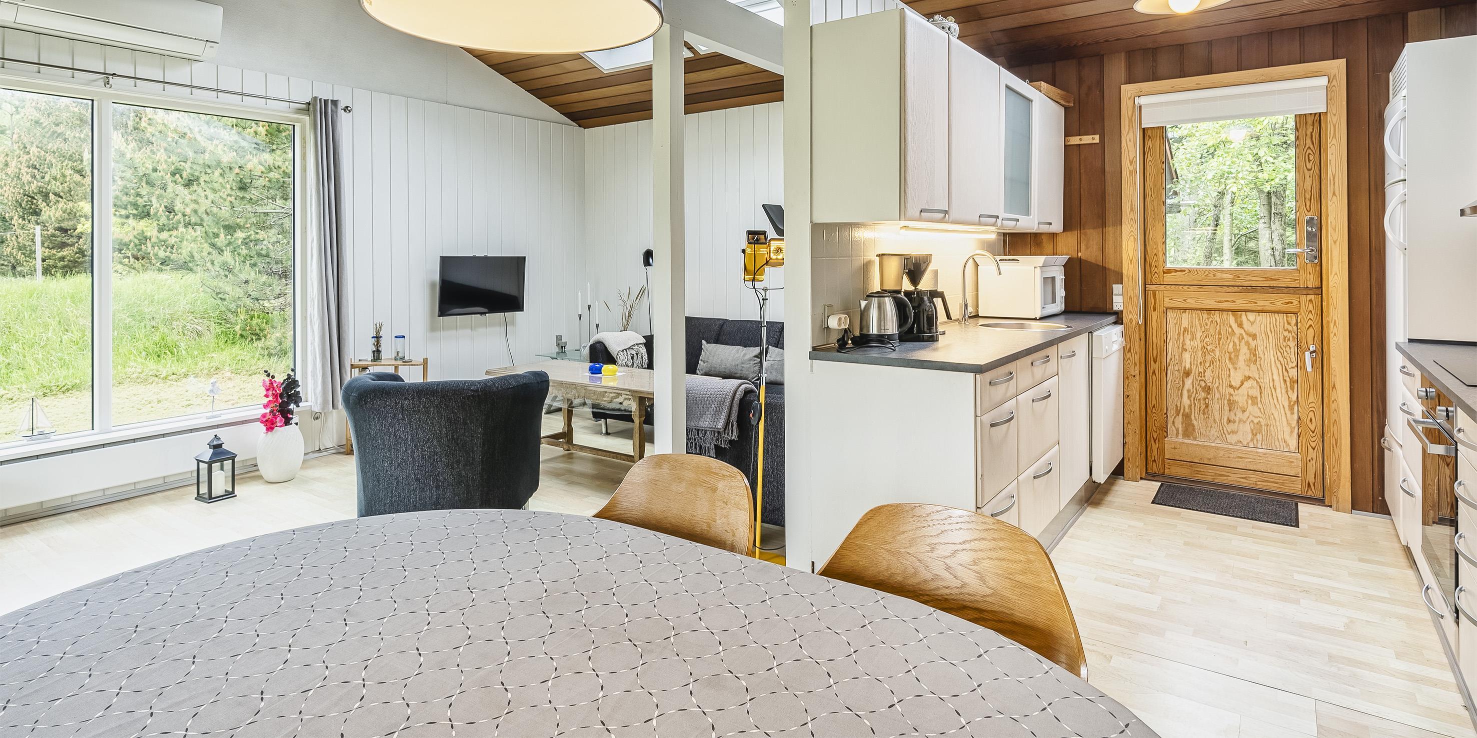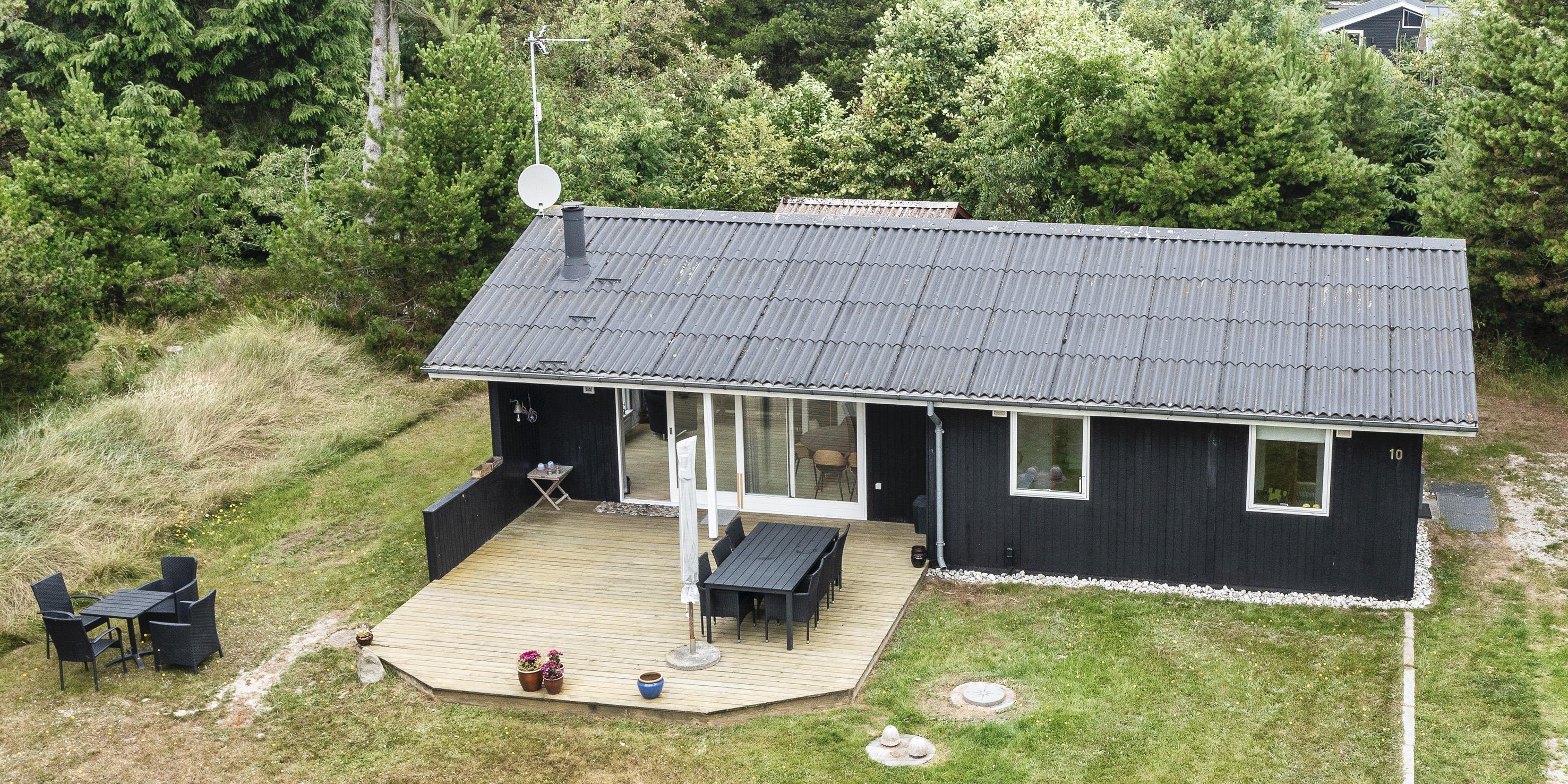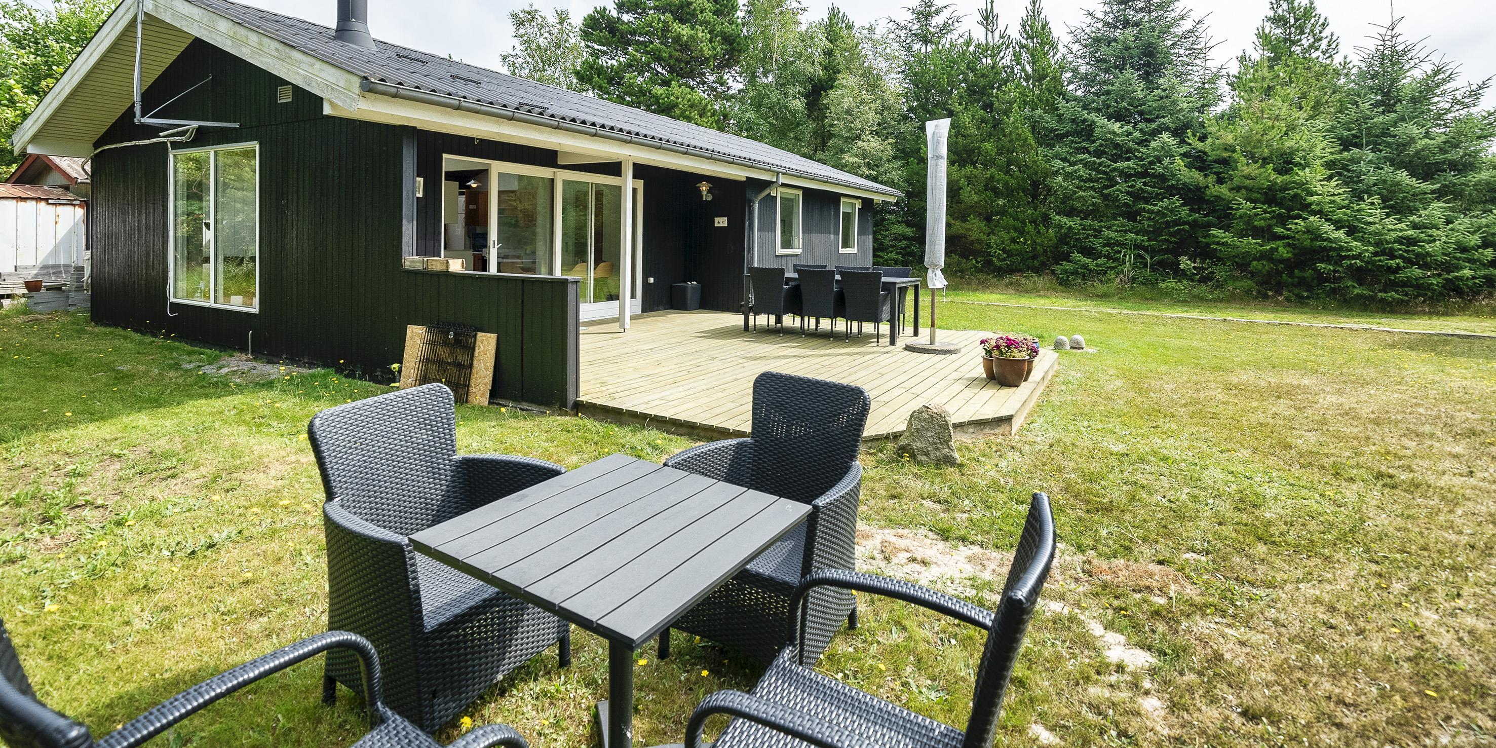 Nett eingerichtetes Ferienhaus auf einem großen grosszügigen Rasengrundstück gelegen. Das Ferienhaus ist für 6 Personen ausgestattet. Der Strand ist ca. 1,8 Km vom Ferienhaus entfernt. Der Wohn-, Ess- und Küchenbereich ist an den Wänden getäfelt und der Fußboden ist mit einem Laminat versehen. Auf der gemütlichen Rundsitzecke haben Sie einen direkten Blick auf den Kamin. Es befindet sich eine Warmepumpe im Ferienhaus. Mit dieser Warmepumpe haben sie die Möglichkeit die Stromkosten zu senken, denn die Warmepumpe ist energiesparend. Das deutsche Fernsehprogramm empfangen Sie über eine Parabolantenne. Im Wohnbereich ist auch ein offener Balken zu sehen. Desweiteren sind im Wohnbereich zwei Oberlichter und in der Küche ist ein Oberlicht im Dach eingebaut. Dadurch scheint viel Licht in diese Bereiche. Gegenüber dem Küchenbereich ist die Essgruppe platziert. In der Küche befindet sich ein Herd mit Cerankochfeld, ein Backofen, eine Geschirrspülmaschine, eine Mikrowelle und eine Kühl- und Gefrierkombination. Das neu renovierte Badezimmer ist mit einem WC, einem Handwaschbecken und einer Dusche ausgestattet. Die Waschmaschine ist hier im Badezimmer untergebracht. Insgesamt stehen den Bewohnern des Hauses drei Schlafzimmer zur Verfügung: DB + 2B + 2B. Alle Schlafzimmer sind mit je zwei Einzelbetten ausgestattet. Eine Terrasse am Ferienhaus gibt Ihnen die Möglichkeit Ihren Kaffee im Trockenen zu geniessen, da ein Teil der Terrasse überdacht ist. Das Ferienhaus verfügt über einen Internetanschluss (W-Lan). Auf dem Grundstück befindet sich ein Schaukelstativ und eine Sandkiste für die Kleinen Gäste sowie ein Schelter (Übernachtungshütte) für "hygge" oder Übernachtung. Es sind max. 1 Haustiere erlaubt. Rauchen ist nicht erlaubt. Das Ferienhaus ist in 1979 erbaut worden.