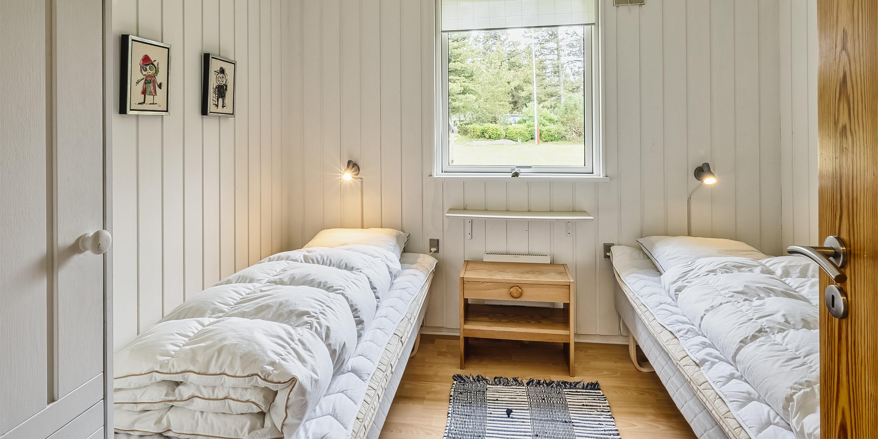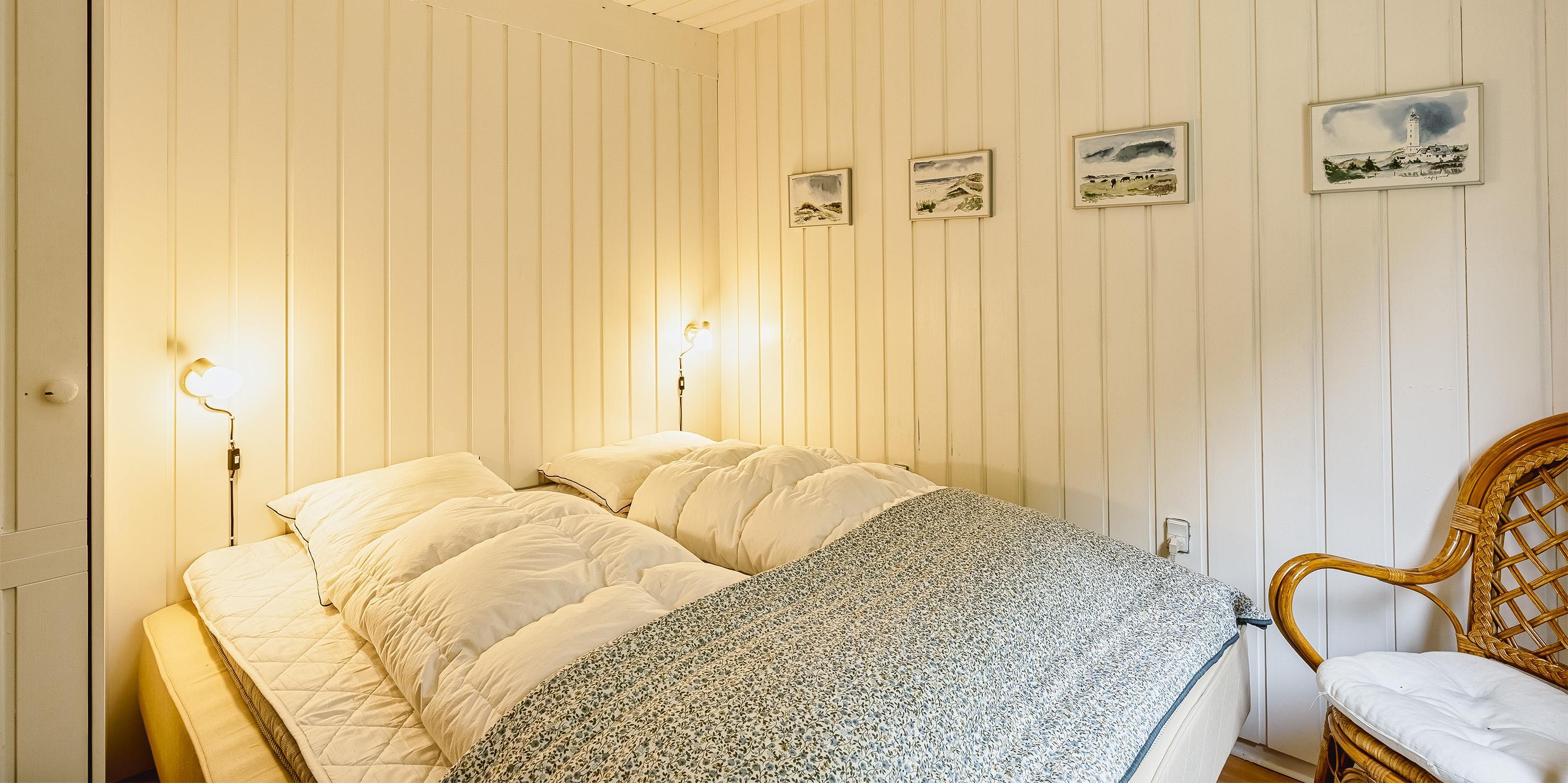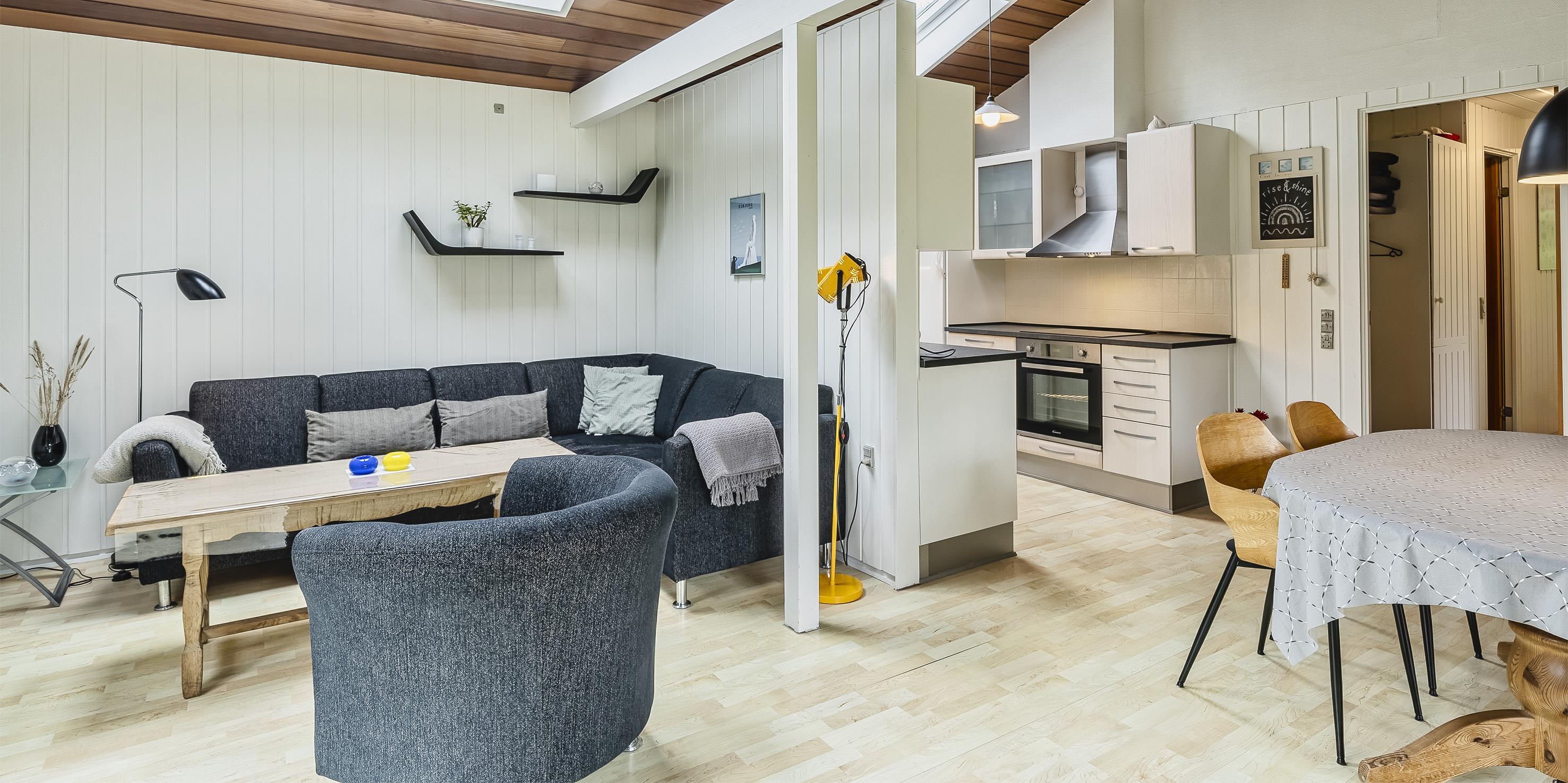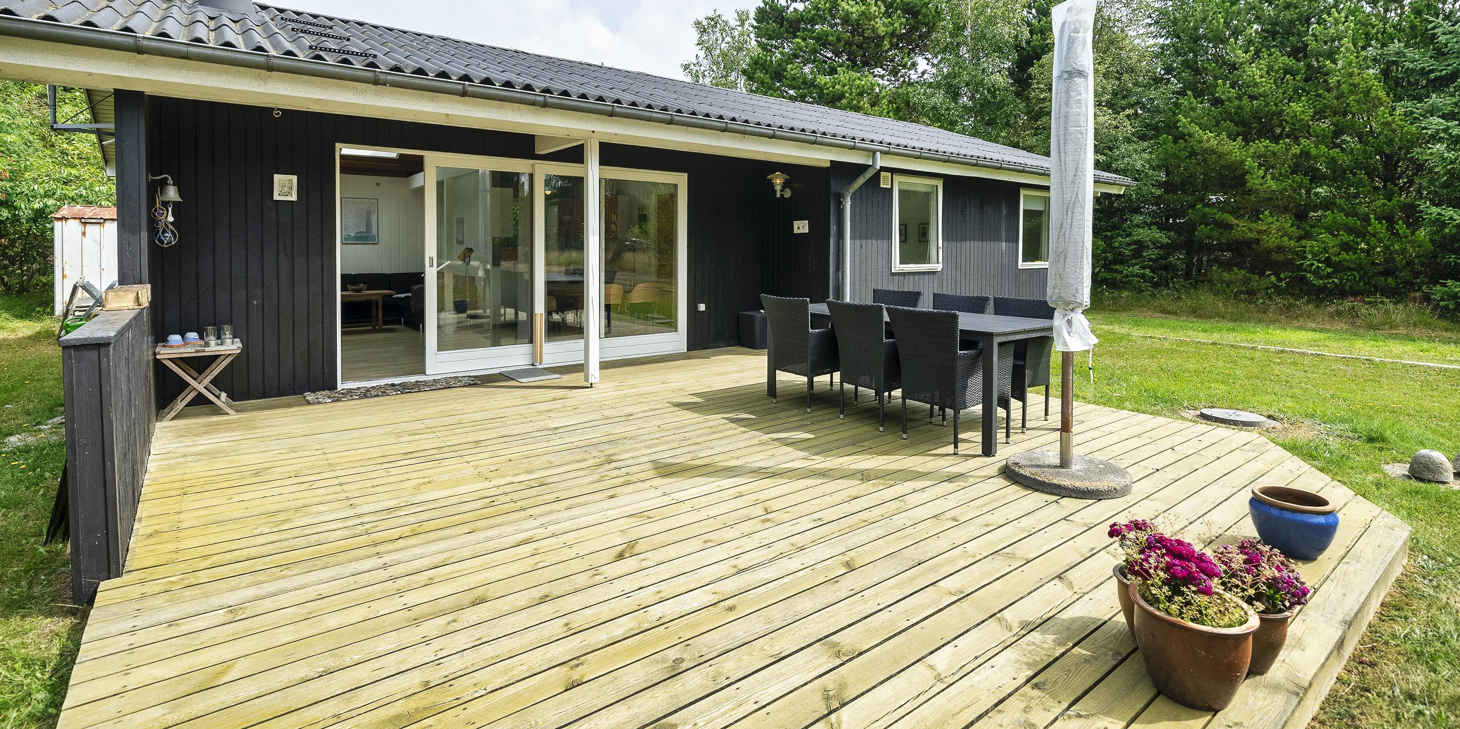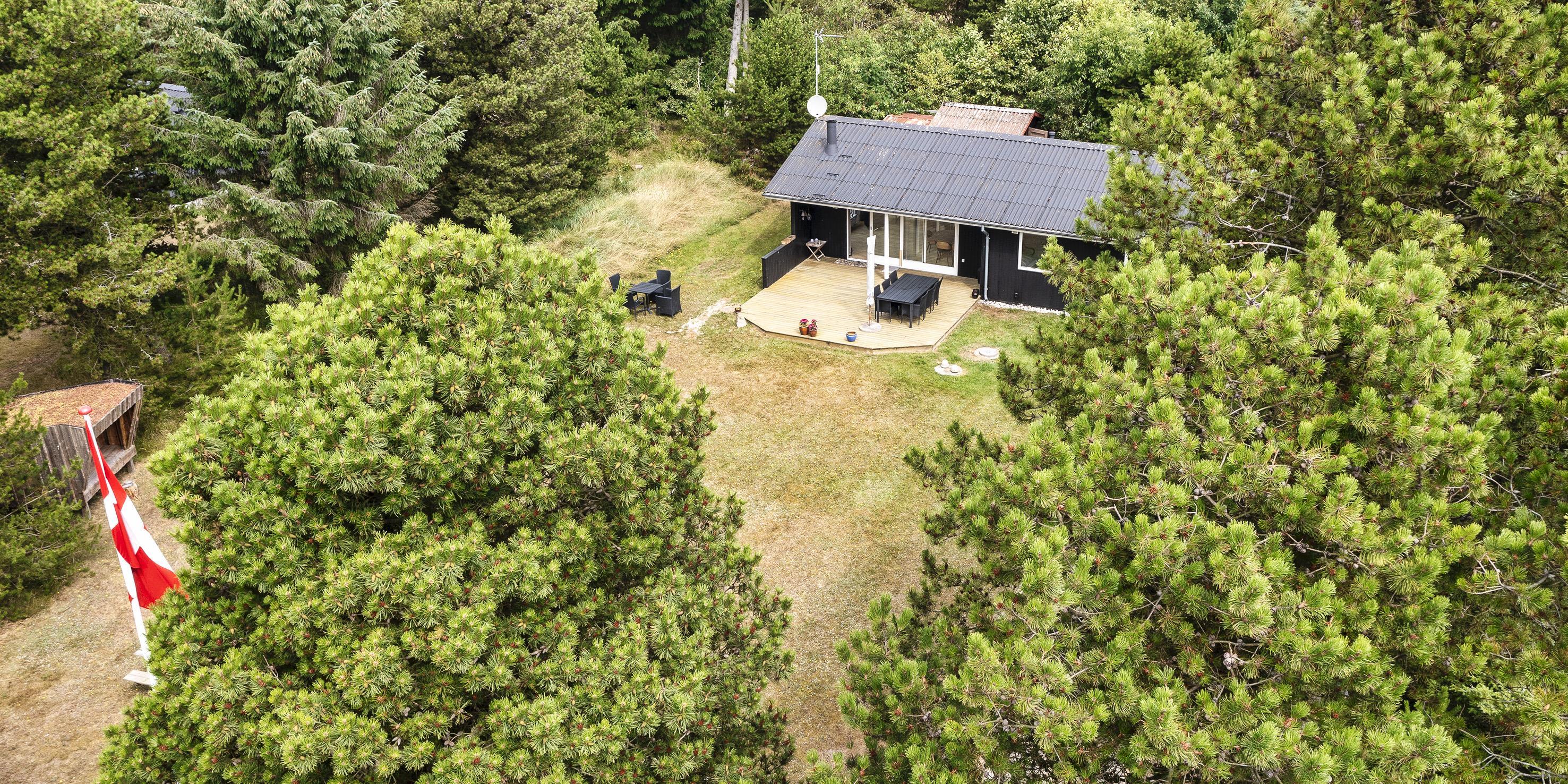Nett eingerichtetes Ferienhaus auf einem großen grosszügigen Rasengrundstück gelegen. Das Ferienhaus ist für 6 Personen ausgestattet. Der Strand ist ca. 1,8 Km vom Ferienhaus entfernt. Der Wohn-, Ess- und Küchenbereich ist an den Wänden getäfelt und der Fußboden ist mit einem Laminat versehen. Auf der gemütlichen Rundsitzecke haben Sie einen direkten Blick auf den Kamin. Es befindet sich eine Warmepumpe im Ferienhaus. Mit dieser Warmepumpe haben sie die Möglichkeit die Stromkosten zu senken, denn die Warmepumpe ist energiesparend. Das deutsche Fernsehprogramm empfangen Sie über eine Parabolantenne. Im Wohnbereich ist auch ein offener Balken zu sehen. Desweiteren sind im Wohnbereich zwei Oberlichter und in der Küche ist ein Oberlicht im Dach eingebaut. Dadurch scheint viel Licht in diese Bereiche. Gegenüber dem Küchenbereich ist die Essgruppe platziert. In der Küche befindet sich ein Herd mit Cerankochfeld, ein Backofen, eine Geschirrspülmaschine, eine Mikrowelle und eine Kühl- und Gefrierkombination. Das neu renovierte Badezimmer ist mit einem WC, einem Handwaschbecken und einer Dusche ausgestattet. Die Waschmaschine ist hier im Badezimmer untergebracht. Insgesamt stehen den Bewohnern des Hauses drei Schlafzimmer zur Verfügung: DB + 2B + 2B. Alle Schlafzimmer sind mit je zwei Einzelbetten ausgestattet. Eine Terrasse am Ferienhaus gibt Ihnen die Möglichkeit Ihren Kaffee im Trockenen zu geniessen, da ein Teil der Terrasse überdacht ist. Das Ferienhaus verfügt über einen Internetanschluss (W-Lan). Auf dem Grundstück befindet sich ein Schaukelstativ und eine Sandkiste für die Kleinen Gäste sowie ein Schelter (Übernachtungshütte) für "hygge" oder Übernachtung. Es sind max. 1 Haustiere erlaubt. Rauchen ist nicht erlaubt. Das Ferienhaus ist in 1979 erbaut worden.