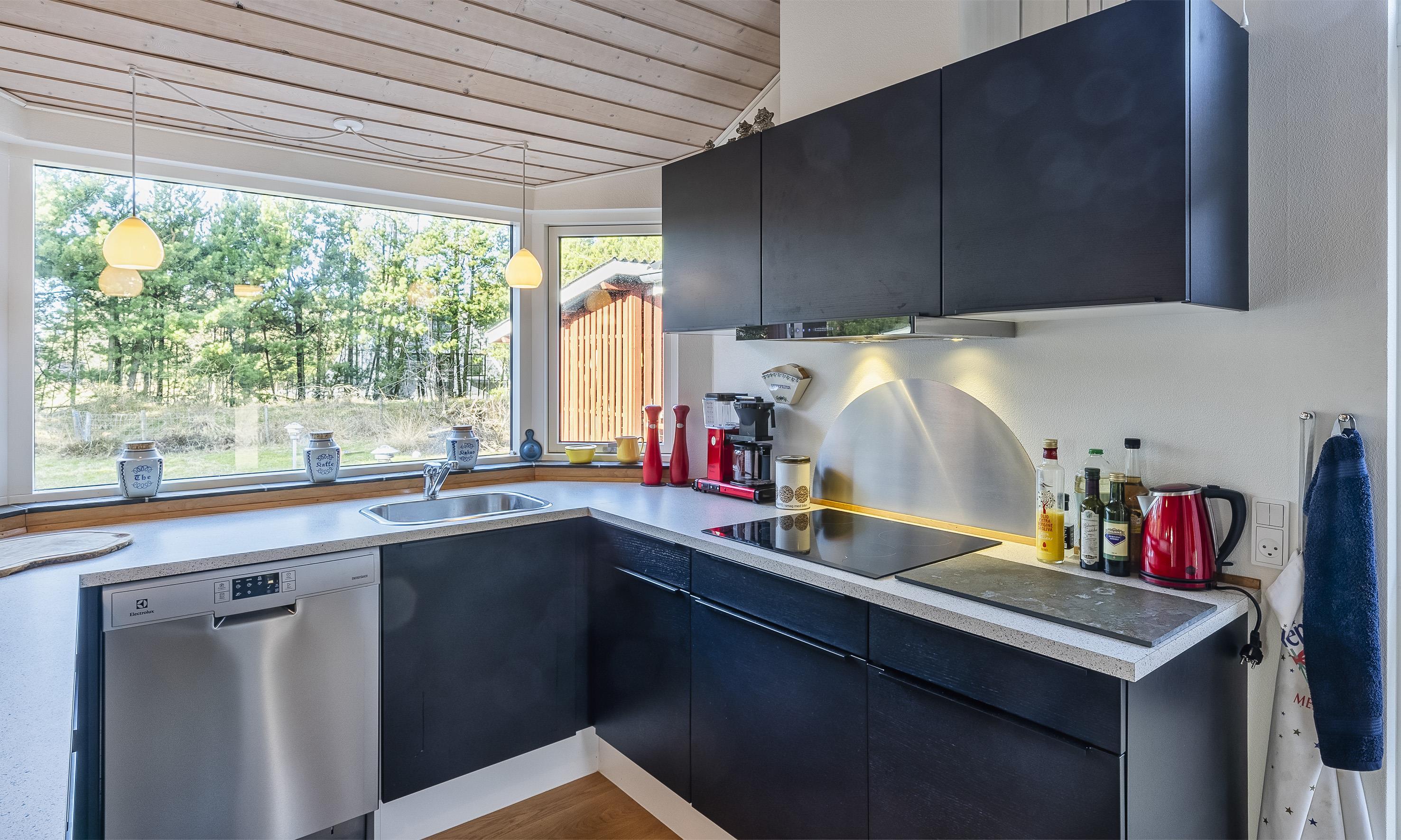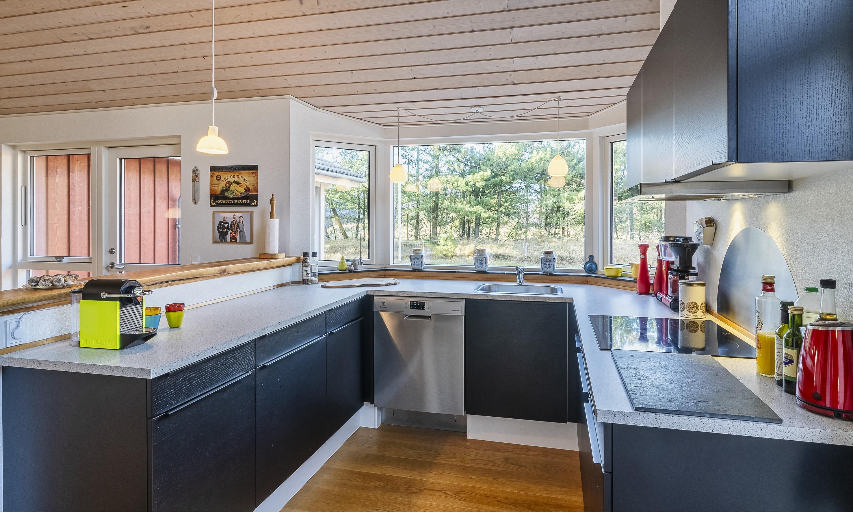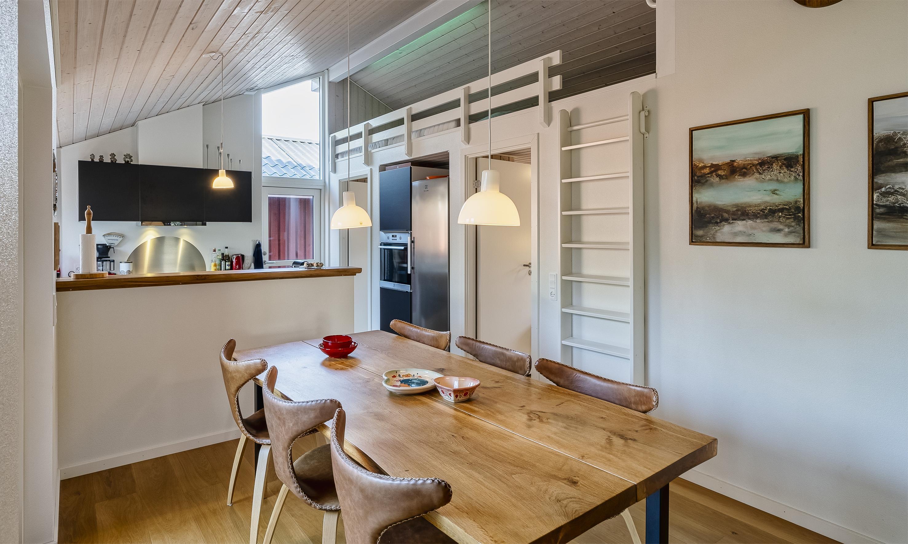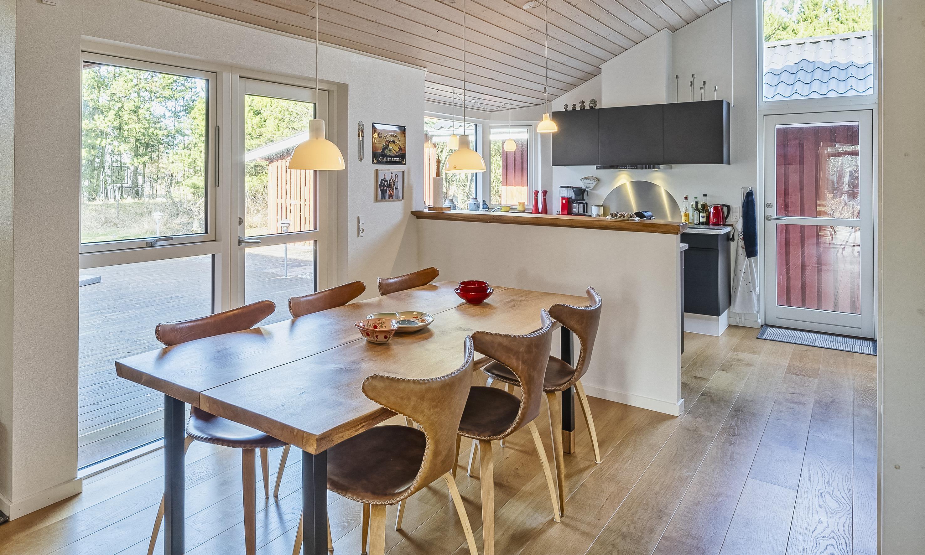 Die offene Küche ist mit dem Essbereich verbunden und hat direkten Zugang zur großen Holzterrasse.