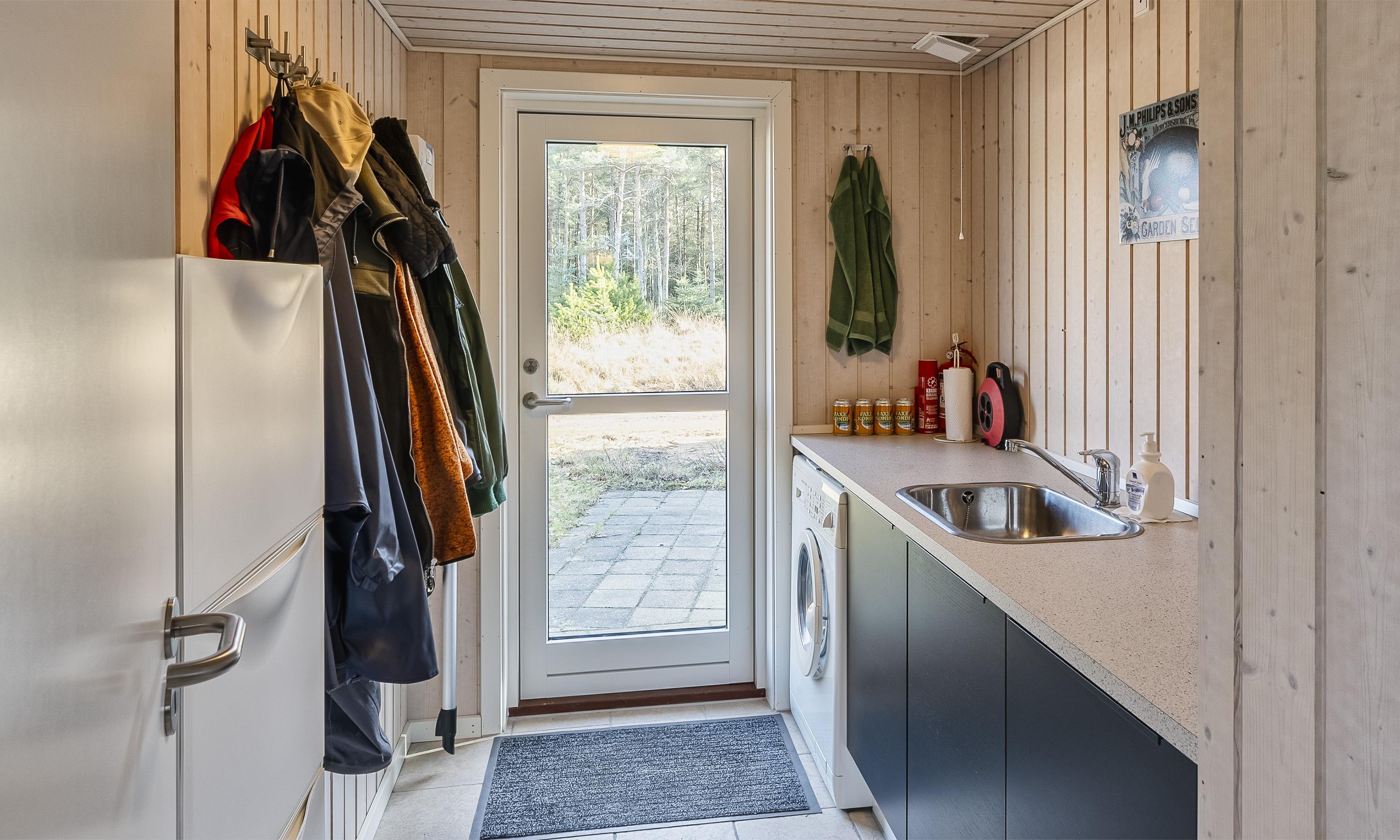 Sie werden von einem großen Hauswirtschaftsraum empfangen, der viel Platz für Schuhe und Jacken bietet.