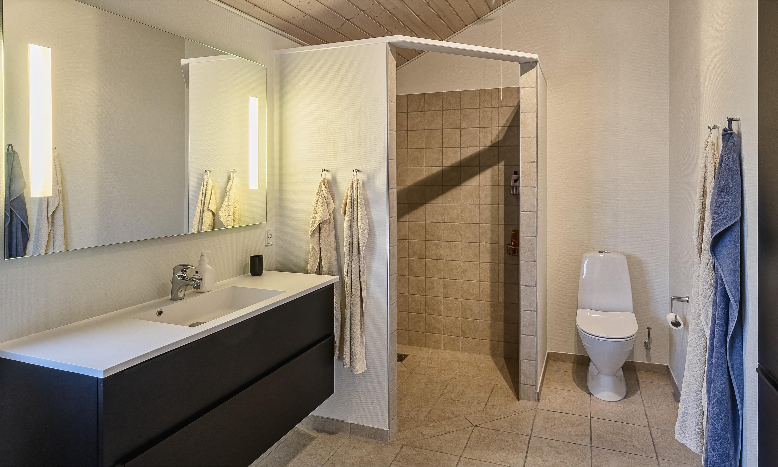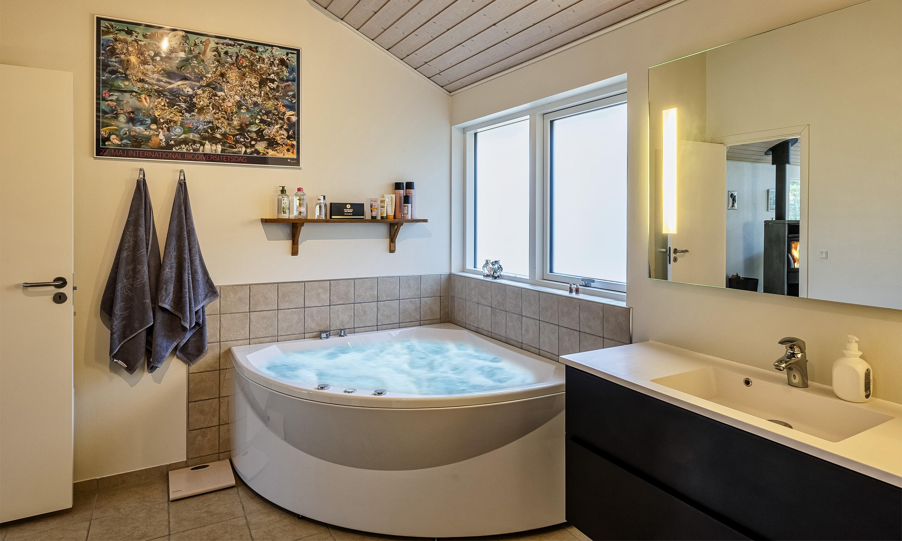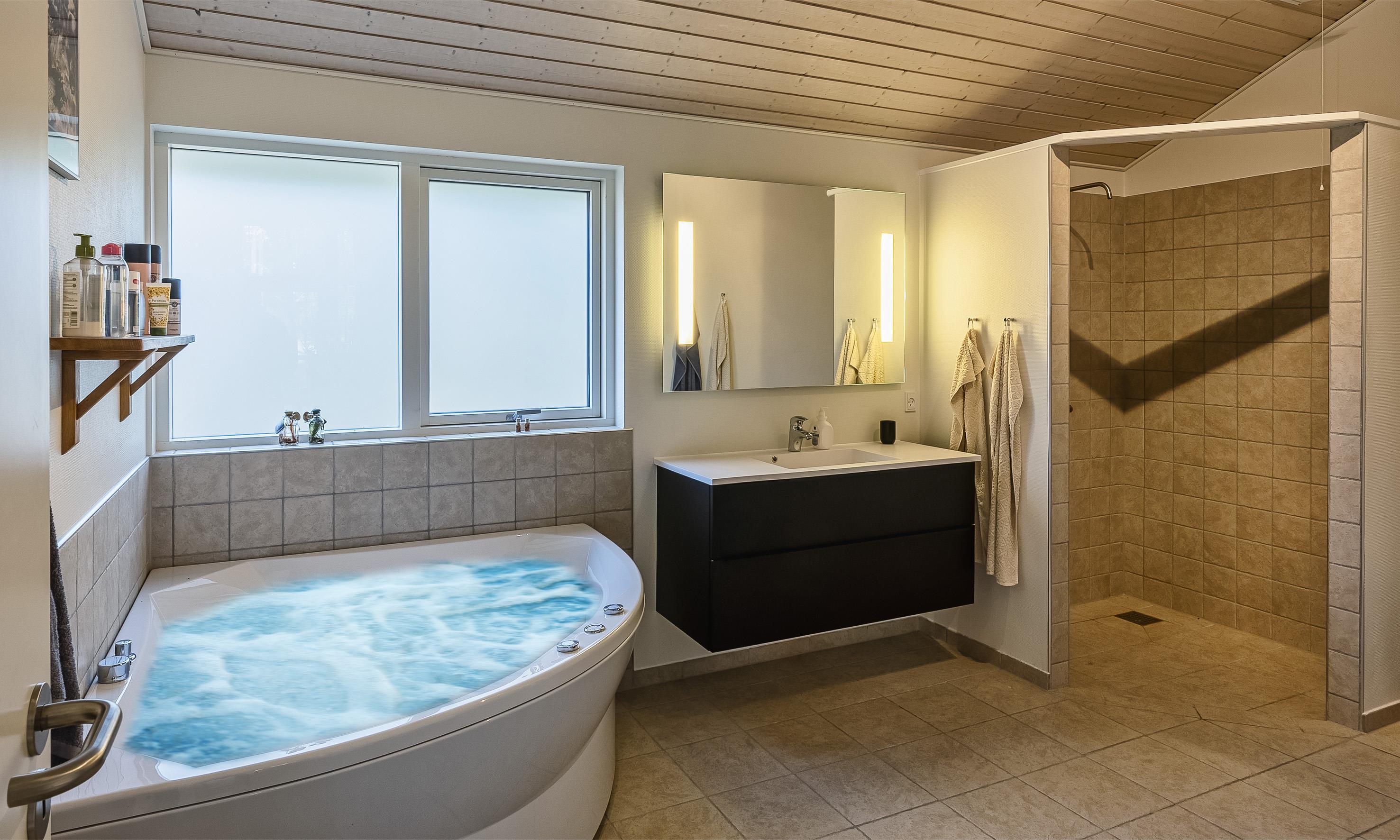 Großes Badezimmer mit Dusche, Whirlpool und Fußbodenheizung.