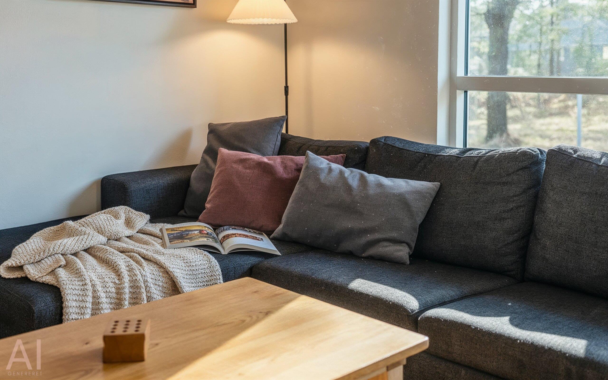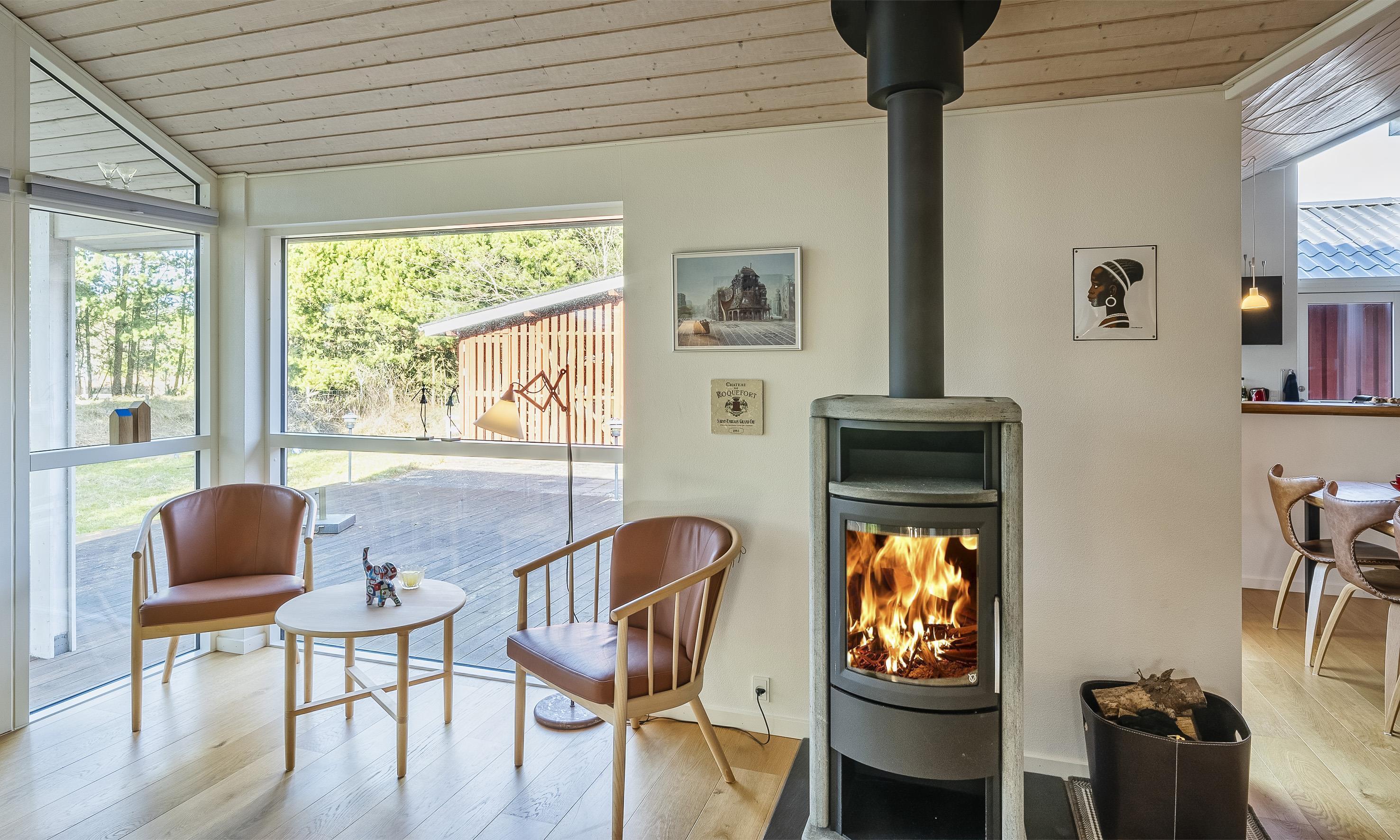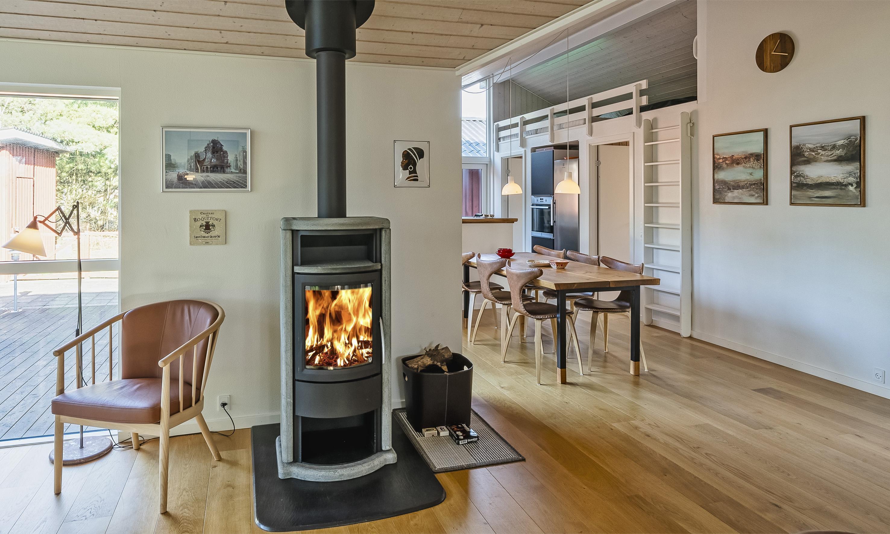 Gemütliches Wohnzimmer mit Kamin und Wärmepumpe.