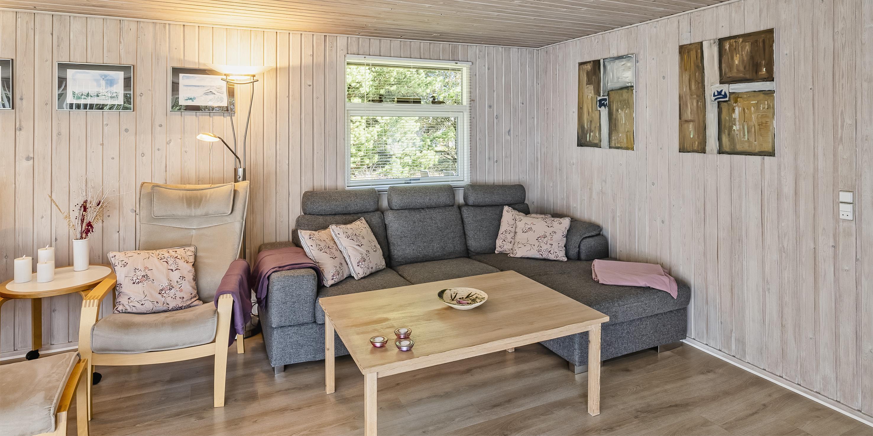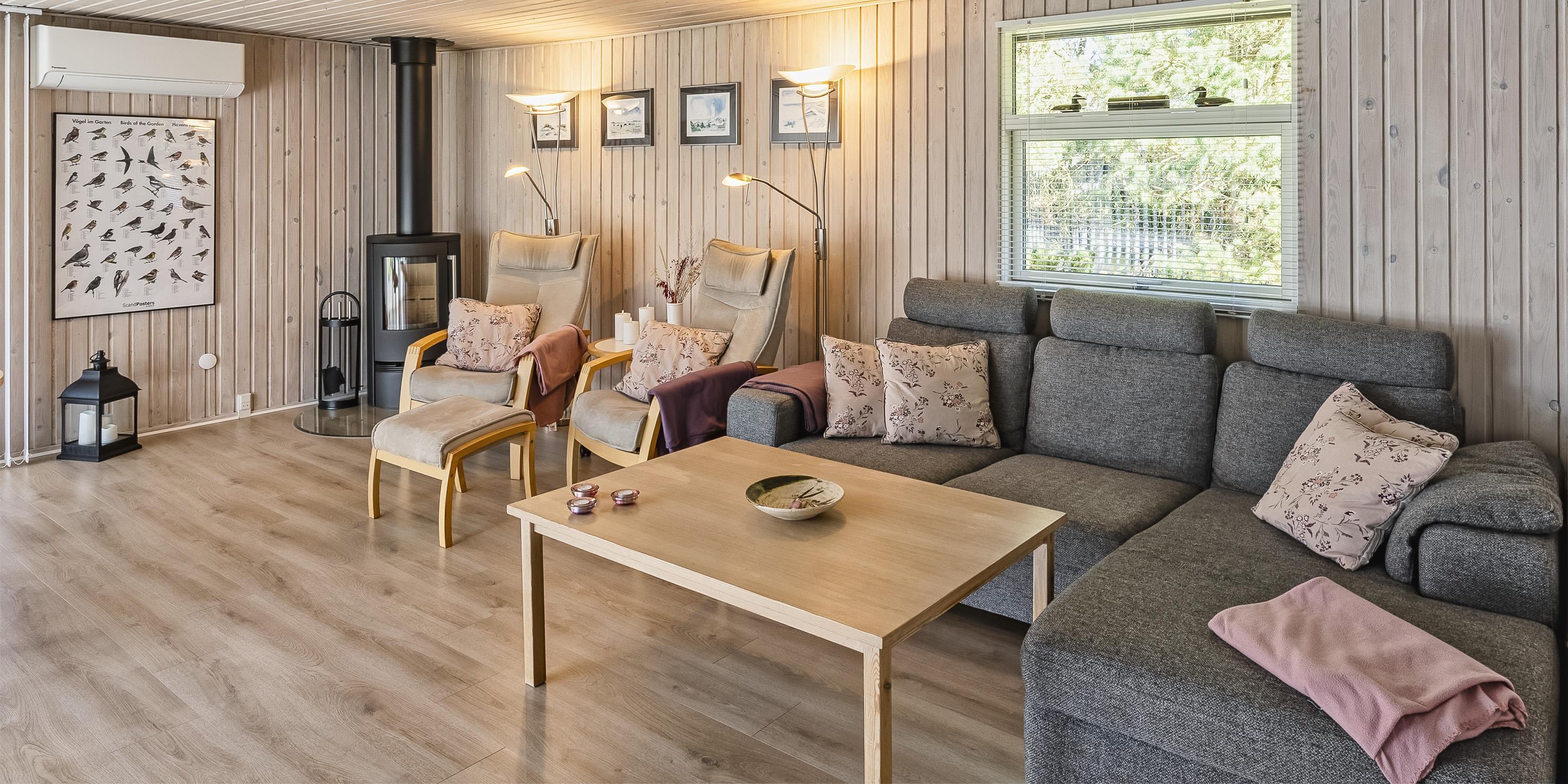 Das Haus enthält eine kleine Eingangshalle, ein neueres Badezimmer, zwei Schlafzimmer: DB + 2B, eine Küche und das Wohnzimmer. Der Essbereich befindet sich in Verbindung mit dem Wohnzimmer und mit Blick auf den Kaminofen. Das Wohnzimmer ist hell und freundlich eingerichtet mit großem Fenstern und die Natur und das Grundstück können durch diesen Ausblick richtig genossen werden. Die gemütlich Sofagruppe lädt zum Relaxen ein. Das Fernsehprogramm empfangen Sie über Parabolantenne. Desweiteren steht den Gästen Smart TV und Google Chromecast zur Verfügung. Die offene Küche mit großen Fenstern ist zum Grundstück ausgerichtet. Die Küche verfügt über einen Herd, einem Backofen, einer Geschirrspülmaschine, einer Mikrowelle und einen Kühlschrank mit Gefrierfach. Das Badezimmer ist mit einer Dusche, einem WC und einem Waschbecken mit Unterschrank ausgestattet. Das Badezimmer ist mit einer Fußbodenheizung versehen. Ein Schlafzimmer hat zwei Einzelbetten und das andere ein Doppelbett mit Zugang zu einer kleinen uneinnehmbaren Terrasse hinter dem Haus. Das Haus verfügt über eine Wärmepumpe, die im Wohnzimmer montiert ist. Mit dieser energiesparenden Wärmepumpe können Stromkosten gesenkt werden. Vom Wohnzimmer befindet sich dann ein Ausgang auf die große uneinsehbare teilweise überdachte Holzterrasse. Hinter dem Haus ist eine weitere kleine Terrasse. Das Grundstück ist mit Rasen angelegt, was reichlich Gelegenheit für Ballspiele und sowie gute Gelegenheiten zum Toben bietet. Desweiteren kann man davon ausgehen von Rothirschen besucht zu werden. Eine Wschmaschine steht den Gästen im Hause auch zur Verfügung. Das Rauchen ist im Haus nicht gestattet. Ein kleiner Hund mit einer Rückenhöhe von max. 30 cm ist erlaubt. Das Ferienhaus verfügt über einen W-Lan-Anschluss. Das Baujahr des Hauses ist 1977 und im Jahr 2005 wurde es renoviert.