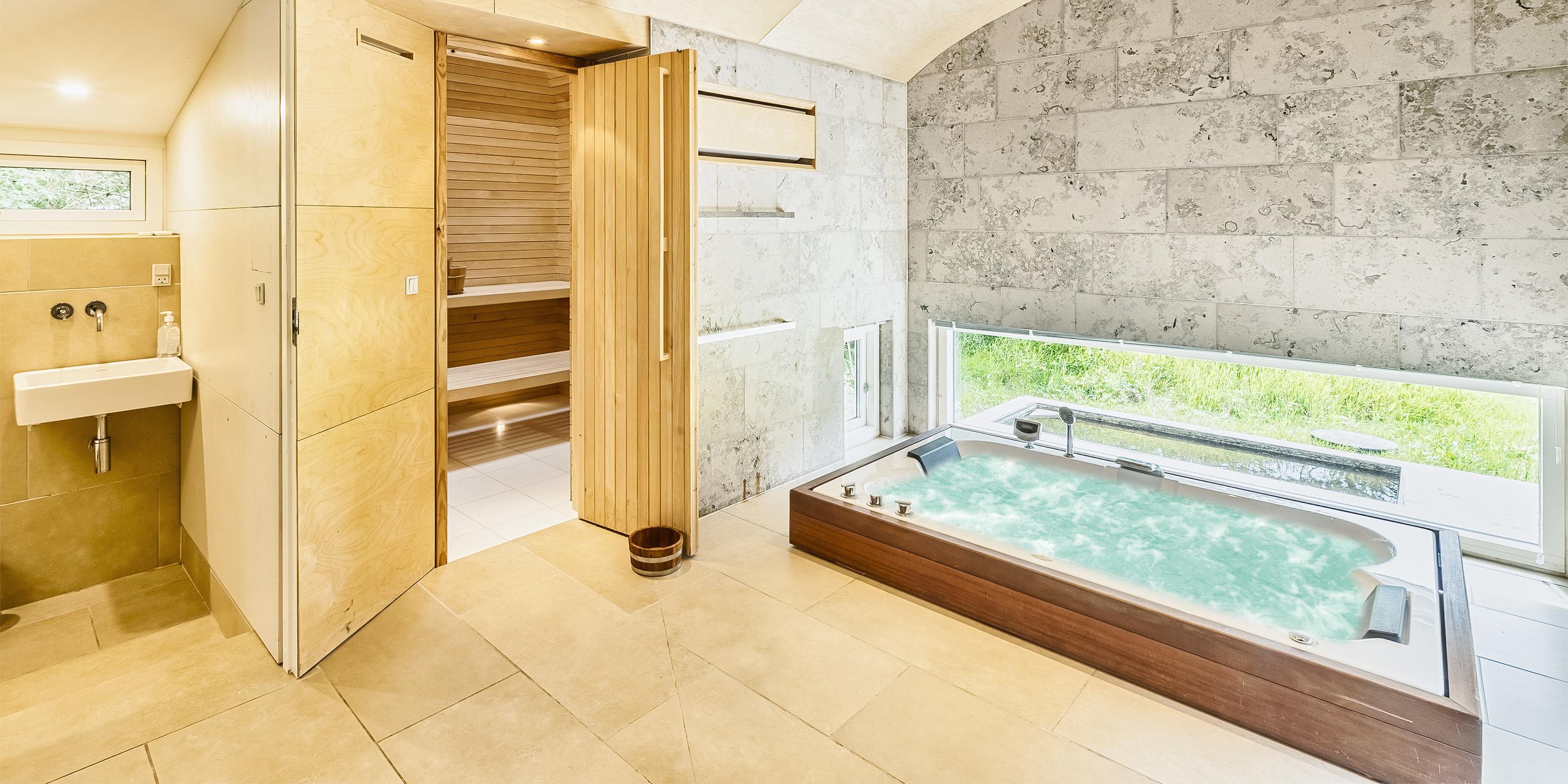 Badetempel mit Sauna, großem Whirlpool, Dusche, WC und Holzofen.