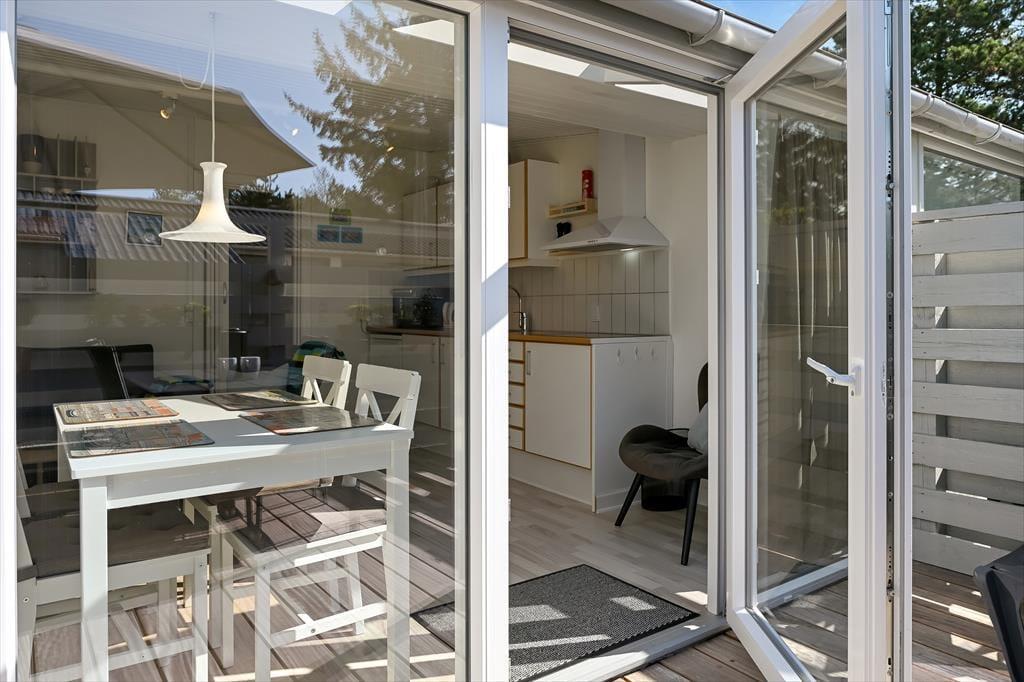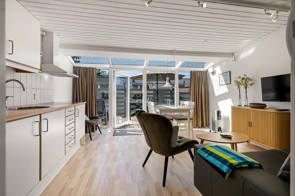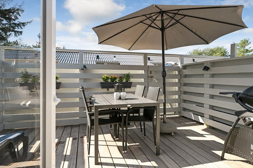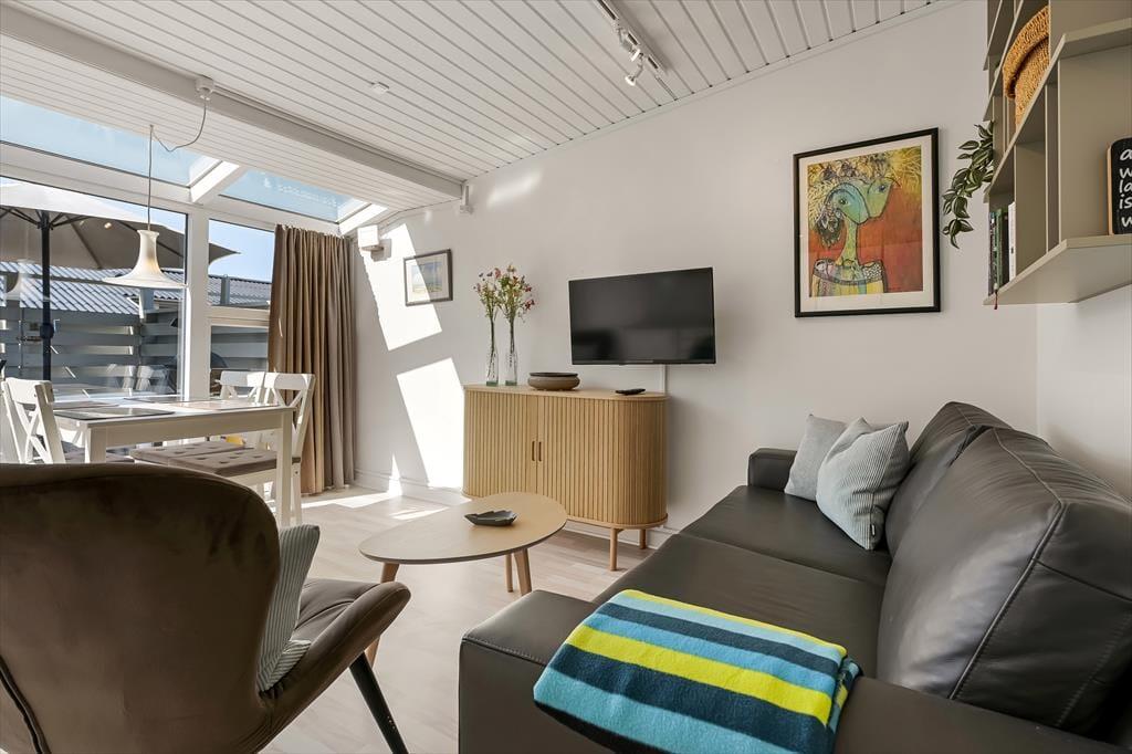 Die südlich ausgerichtete Terrasse des Reihenhauses wird schnell zum natürlichen Treffpunkt im Urlaub. Hier können Sie es sich in den Gartenmöbeln mit einem guten Buch bequem machen, während die Sonne Ihr Gesicht wärmt, oder den Tisch für ein gemütliches Mittagessen unter freiem Himmel decken. Die Terrasse ist der perfekte Ort, um den Tag mit einer Tasse Kaffee zu beginnen oder ihn mit einem Glas Wein zu beenden, wenn die Abendsonne sanft über das Gebiet fällt. Der kleine, private Außenbereich vermittelt ein Gefühl von Ruhe und Geborgenheit, und Sie können die Stille genießen – nur unterbrochen vom Zwitschern der Vögel oder dem Rauschen des Meeres im Hintergrund. Sollte das Wetter einmal umschlagen, können Sie sich ins Haus zurückziehen und dank der großen Glastüren dennoch den Blick auf die Terrasse behalten – so fühlt sich die Natur immer ganz nah an.