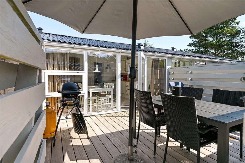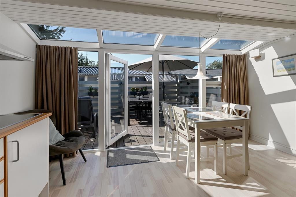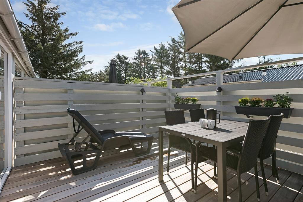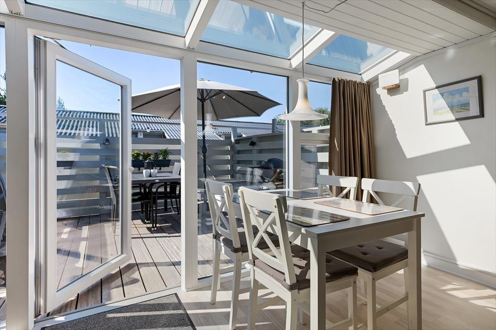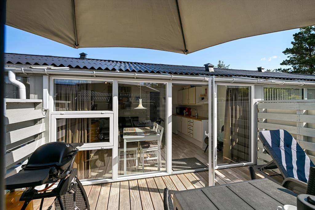 Die südlich ausgerichtete Terrasse des Reihenhauses wird schnell zum natürlichen Treffpunkt im Urlaub. Hier können Sie es sich in den Gartenmöbeln mit einem guten Buch bequem machen, während die Sonne Ihr Gesicht wärmt, oder den Tisch für ein gemütliches Mittagessen unter freiem Himmel decken. Die Terrasse ist der perfekte Ort, um den Tag mit einer Tasse Kaffee zu beginnen oder ihn mit einem Glas Wein zu beenden, wenn die Abendsonne sanft über das Gebiet fällt. Der kleine, private Außenbereich vermittelt ein Gefühl von Ruhe und Geborgenheit, und Sie können die Stille genießen – nur unterbrochen vom Zwitschern der Vögel oder dem Rauschen des Meeres im Hintergrund. Sollte das Wetter einmal umschlagen, können Sie sich ins Haus zurückziehen und dank der großen Glastüren dennoch den Blick auf die Terrasse behalten – so fühlt sich die Natur immer ganz nah an.