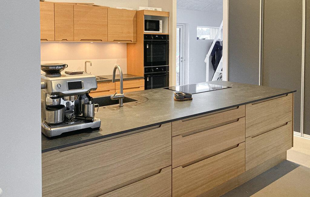Der offene Wohn- und Essbereich wirkt einladend, und große Fenster eröffnen den Blick in die umliegende Landschaft. Nehmen Sie auf den bequemen Sitzgelegenheiten Platz und verbringen Sie ruhige Abende mit einem Film oder guten Gesprächen. Bereiten Sie Mahlzeiten in der hochwertig ausgestatteten Küche mit großzügigen Arbeitsflächen zu. Versammeln Sie sich am langen Esstisch und genießen Sie gesellige Runden. Ziehen Sie im Pool Ihre Bahnen und lassen Sie Ihre Kinder die Wasserrutsche ausprobieren. Entspannen Sie anschließend im Whirlpool oder fordern Sie sich bei einer Partie Dart heraus.