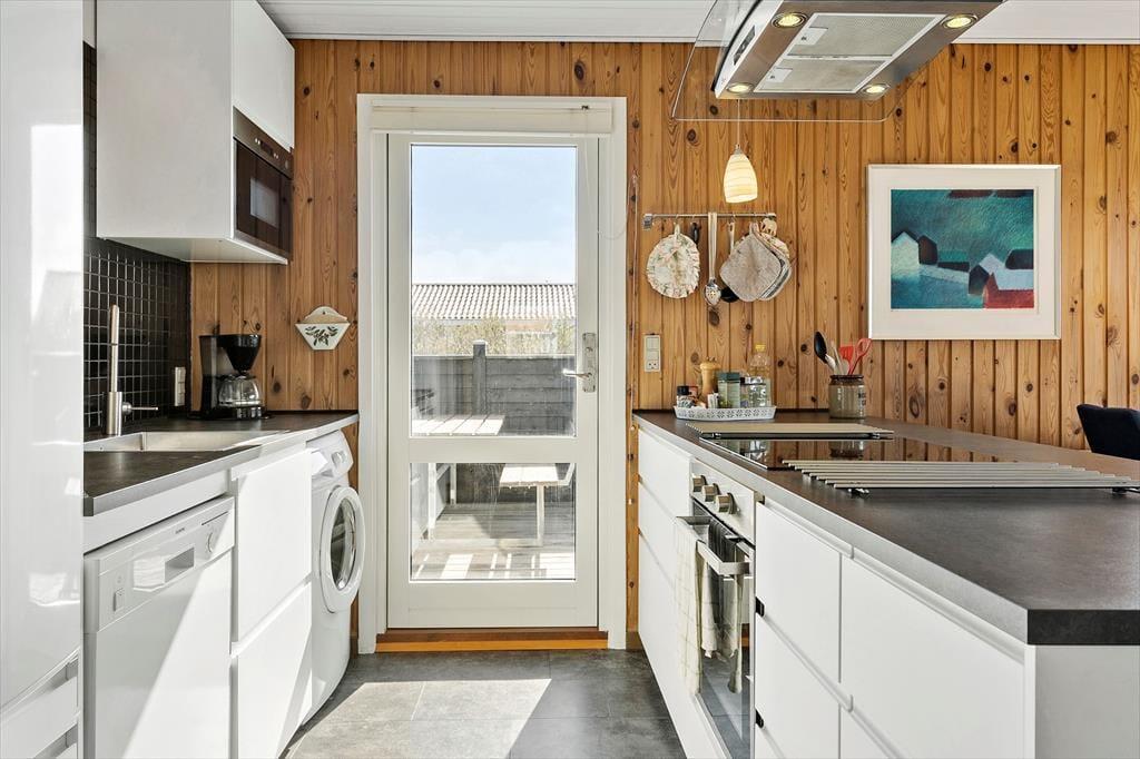 Auch draußen lädt das Ferienhaus zum Entspannen und Beisammensein ein. Eine großzügige Terrasse erstreckt sich vor dem Haus und bietet dir reichlich Platz, um einen sonnigen Platz mit einer Tasse Kaffee zu finden oder es dir windgeschützt gemütlich zu machen und das Abendessen vom Grill zu genießen. Lass den Tag in aller Ruhe ausklingen – mit Blick auf das friedliche Ferienhausgebiet und vielleicht dem Ruf einer Möwe in der Ferne. Wenn du mit Kindern reist, ist der Garten ein wunderbarer Ort zum Spielen und für Ballspiele – und mit der kurzen Entfernung sowohl zum Strand als auch zum Spielplatz gibt es reichlich Möglichkeiten, Energie loszuwerden. Der perfekte Rahmen, um die langen Sommertage mit Sonne im Gesicht und Sand zwischen den Zehen zu genießen.
