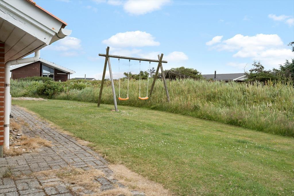 Der Garten des Ferienhauses lädt zu einem besonders entspannten Outdoor-Urlaub ein. Die große Rasenfläche bietet viel Platz zum Spielen und Toben, und das Schaukelgestell ist bereit für viele fröhliche Kinderstunden. Währenddessen können es sich die Erwachsenen auf einer Sonnenliege gemütlich machen oder im Schatten unter der überdachten Terrasse entspannen. Hier ist der perfekte Ort, um mit frisch gebrühtem Kaffee in den Tag zu starten und den Abend mit einem leckeren Essen vom Grill ausklingen zu lassen, während die letzten Sonnenstrahlen über die Dünen gleiten. Der offene Garten und die ruhige Atmosphäre schaffen die perfekte Kulisse für Erholung und Zweisamkeit – ganz gleich, ob du dem Vogelgezwitscher am Morgen lauschst oder am Nachmittag ein gutes Buch liest. Und mit nur 250 Metern bis zum Strand bist du jederzeit schnell am Wasser – sei es für einen Sprung in die Wellen oder einen gemütlichen Spaziergang entlang der Küste.