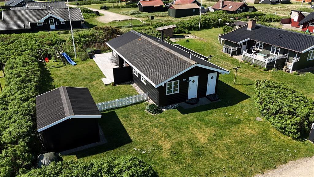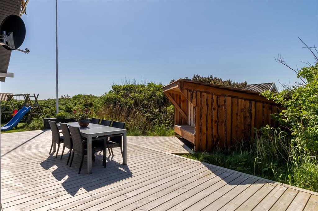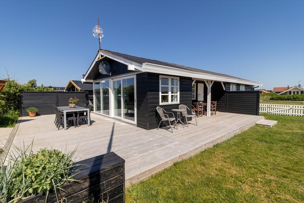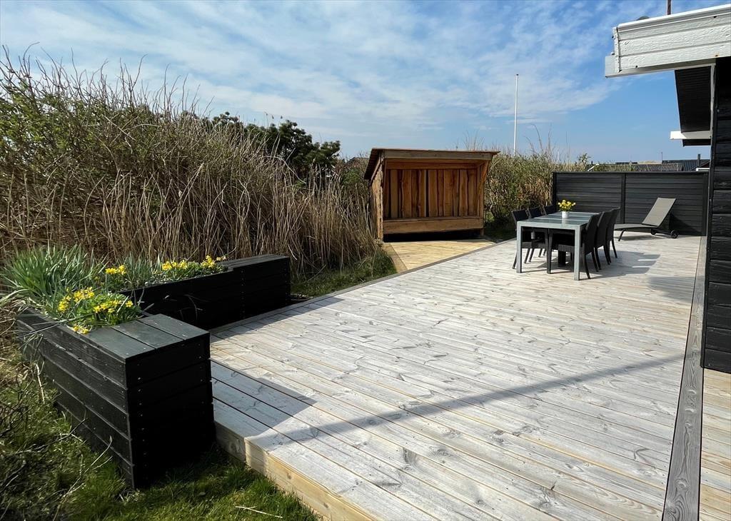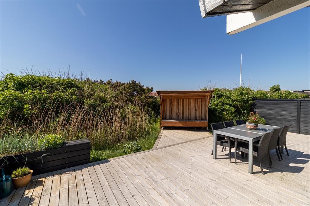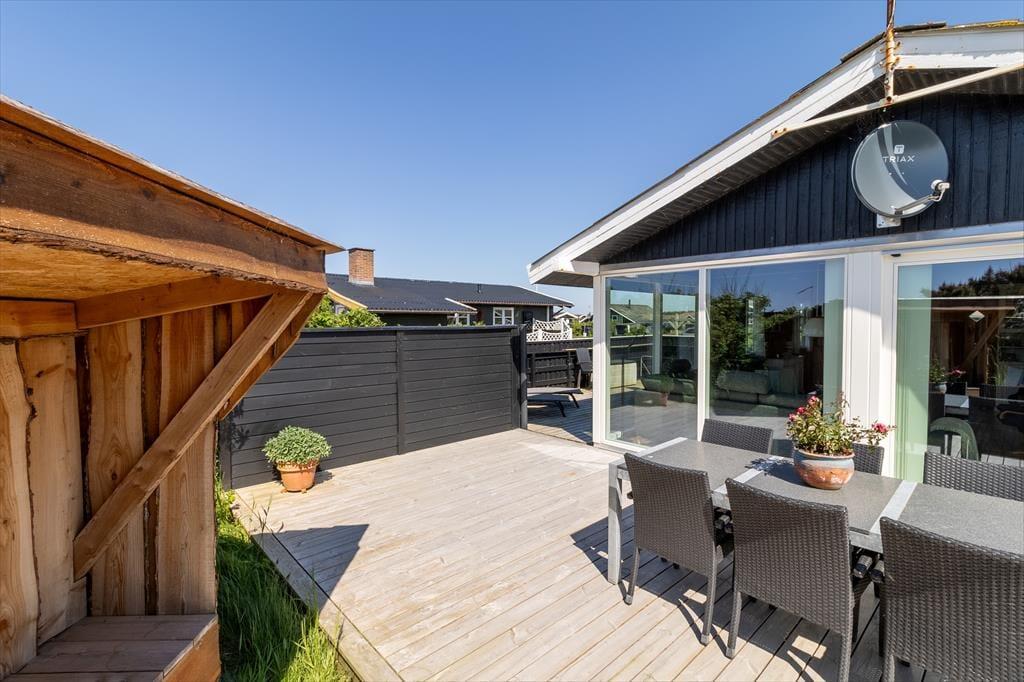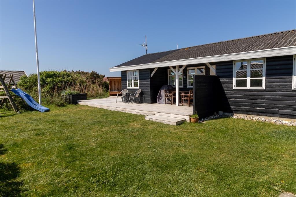 Scheint die Sommersonne über Vejlby Klit, ist es wunderbar, das Ferienleben auf der großen Holzterrasse zu genießen, die sich über drei Seiten des Hauses erstreckt. Selbst bei weniger gutem Wetter kannst du draußen sitzen, denn die kleine Überdachung bietet Schutz vor leichtem Regen oder Abendtau. Auf der Terrasse stehen Gartenmöbel, Liegestühle und ein Grill zur Verfügung – ideal für gesellige Grillabende. Für kleine Kinder gibt es Schaukeln und eine grüne Rasenfläche zum Spielen.